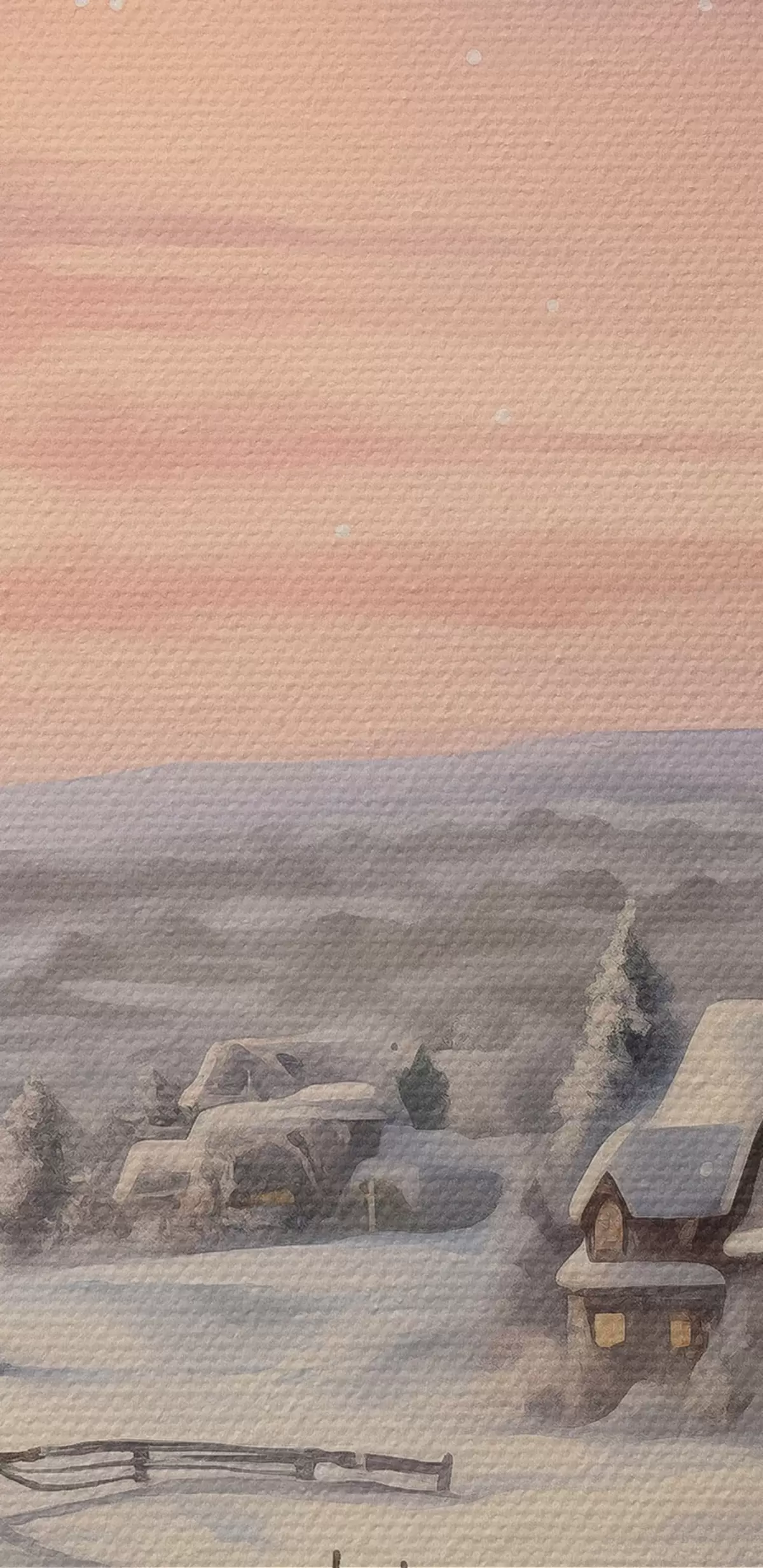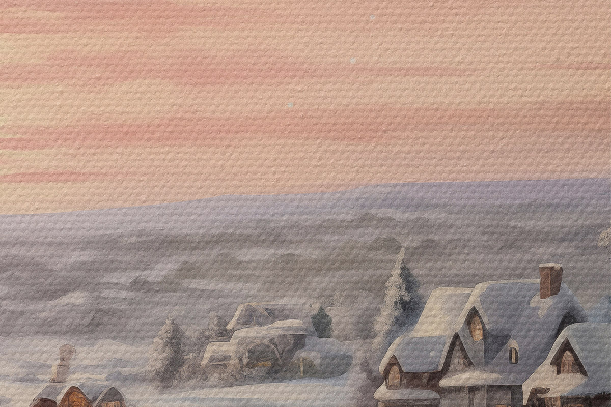 Bild Sonnenuntergang im Winterdorf, rustikal, Aquarell, Schneeflocken Nr r41386