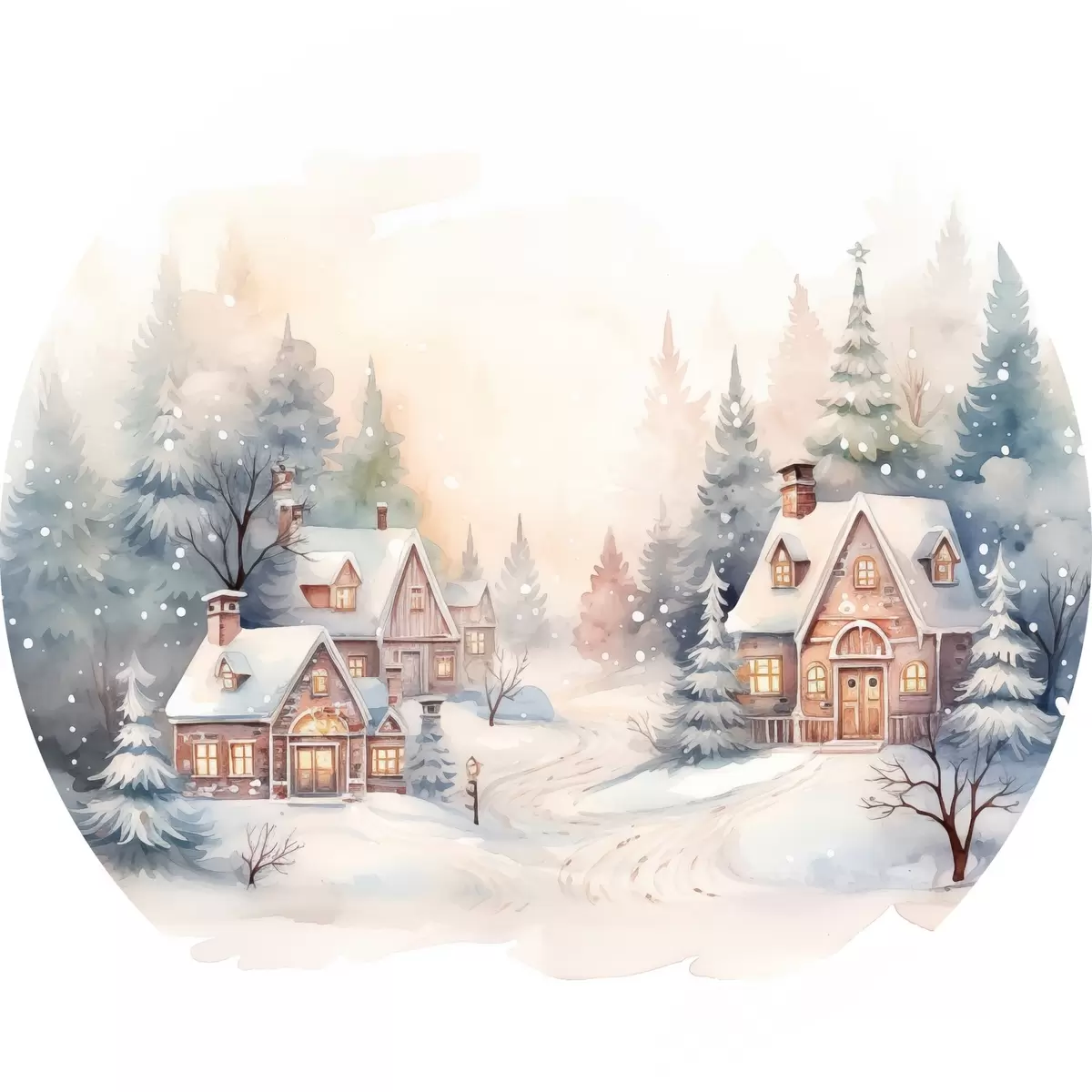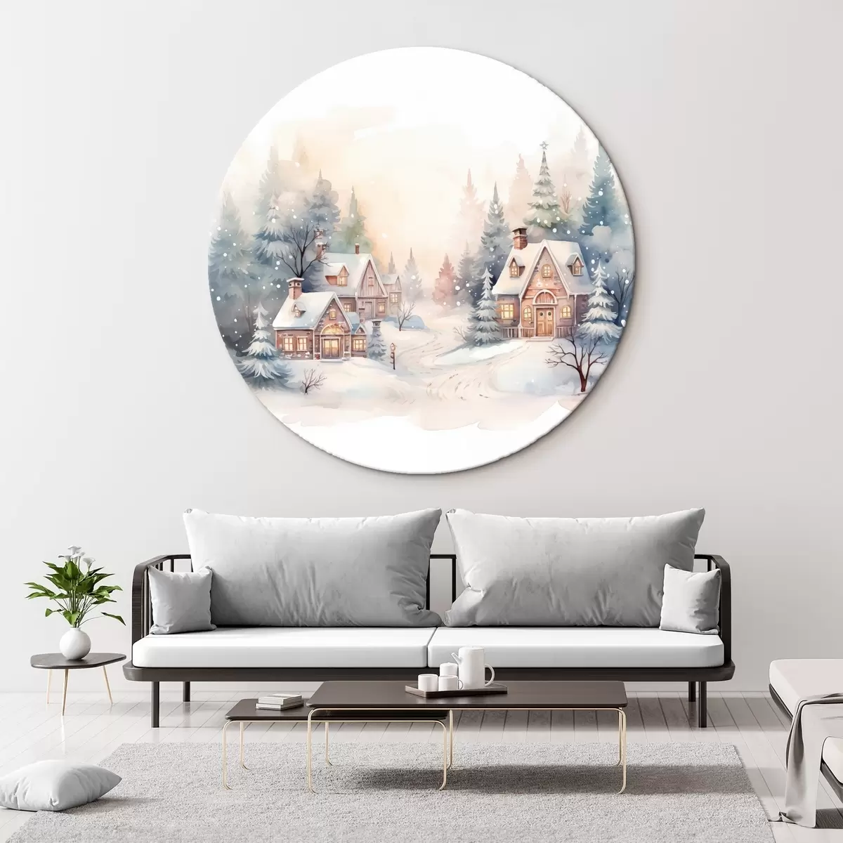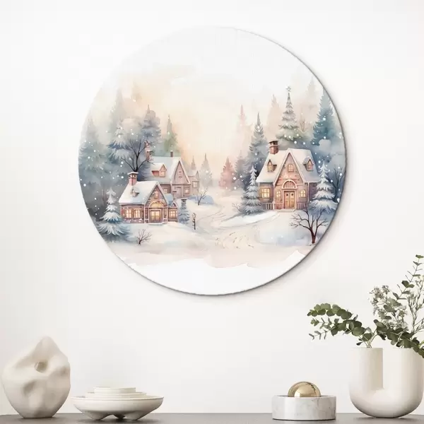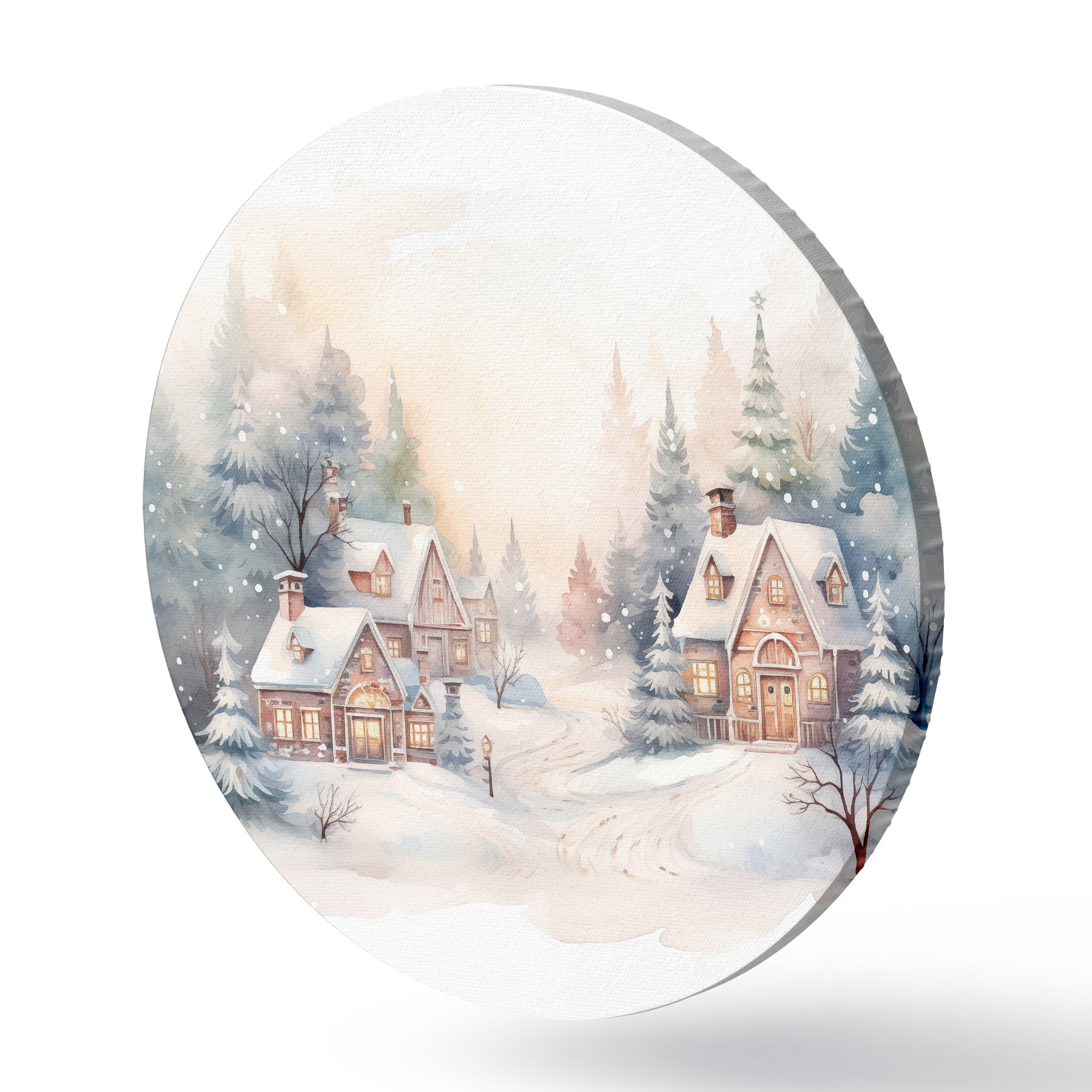 Runde Gemälde Winterlandschaft, Kiefernwald, schöne Häuser, Aquarell, Susnet r41390