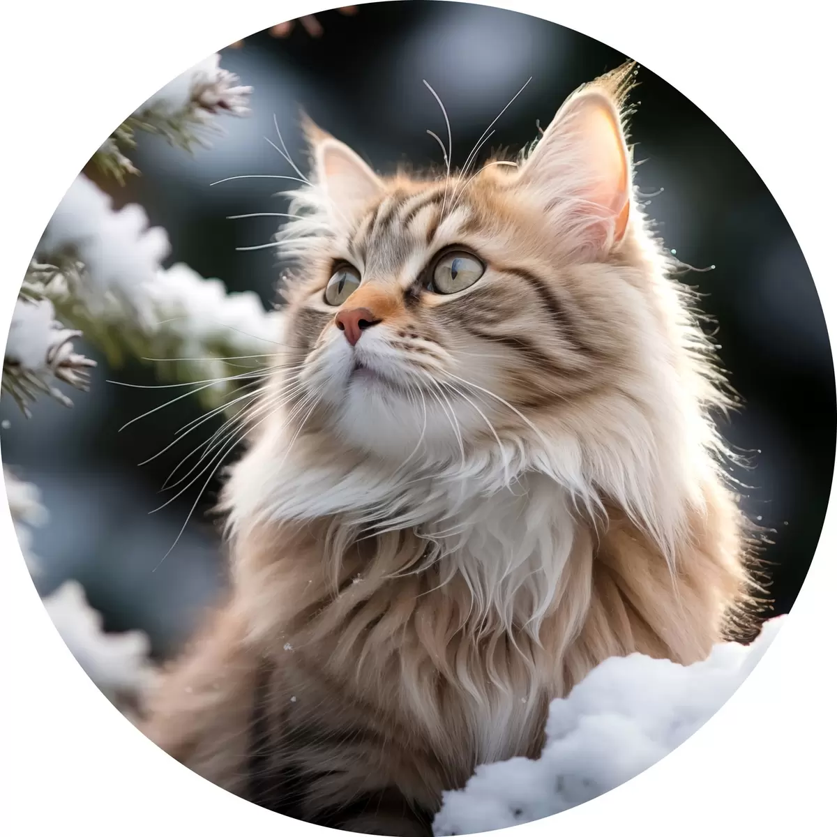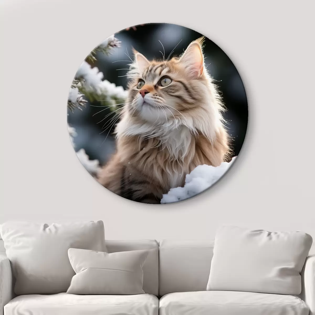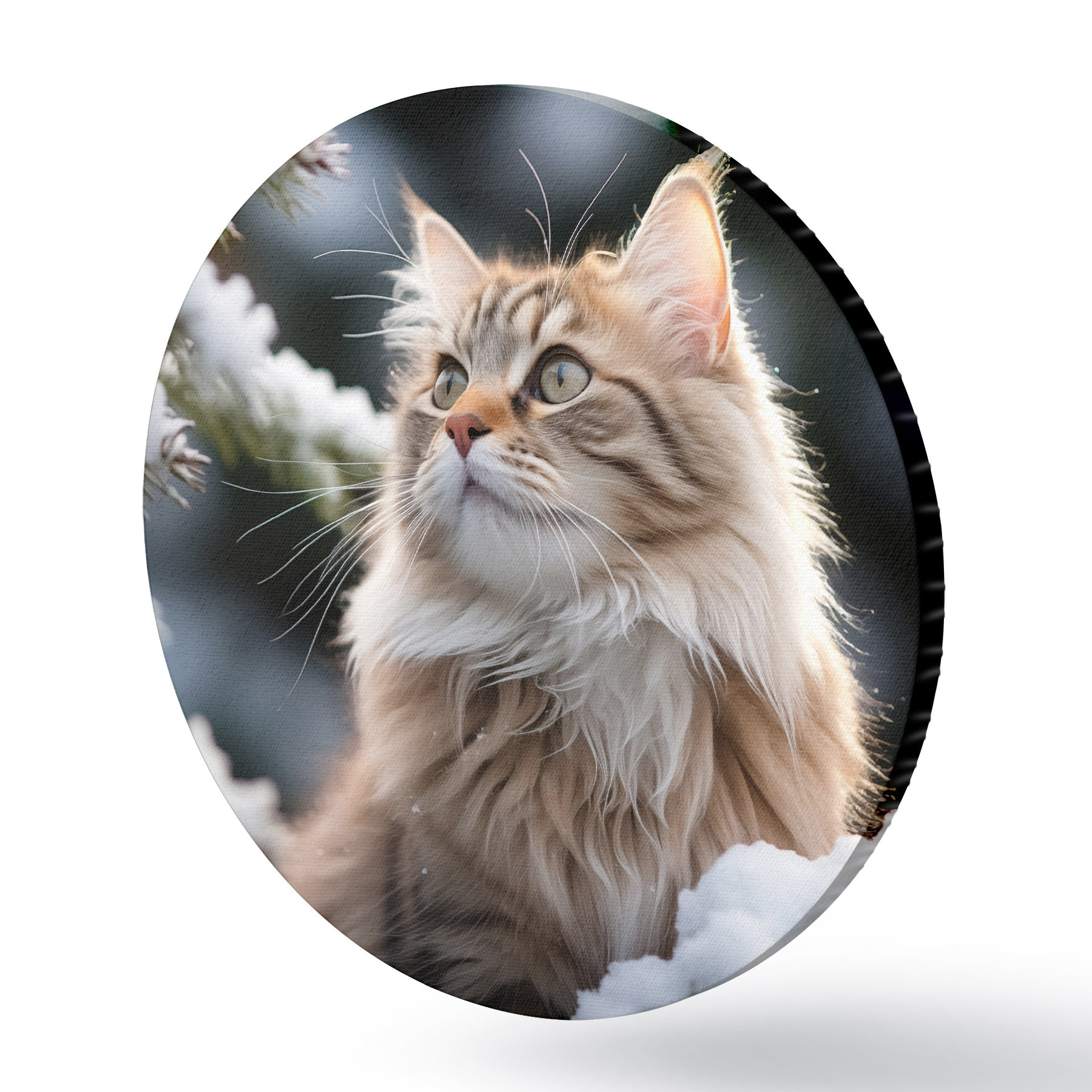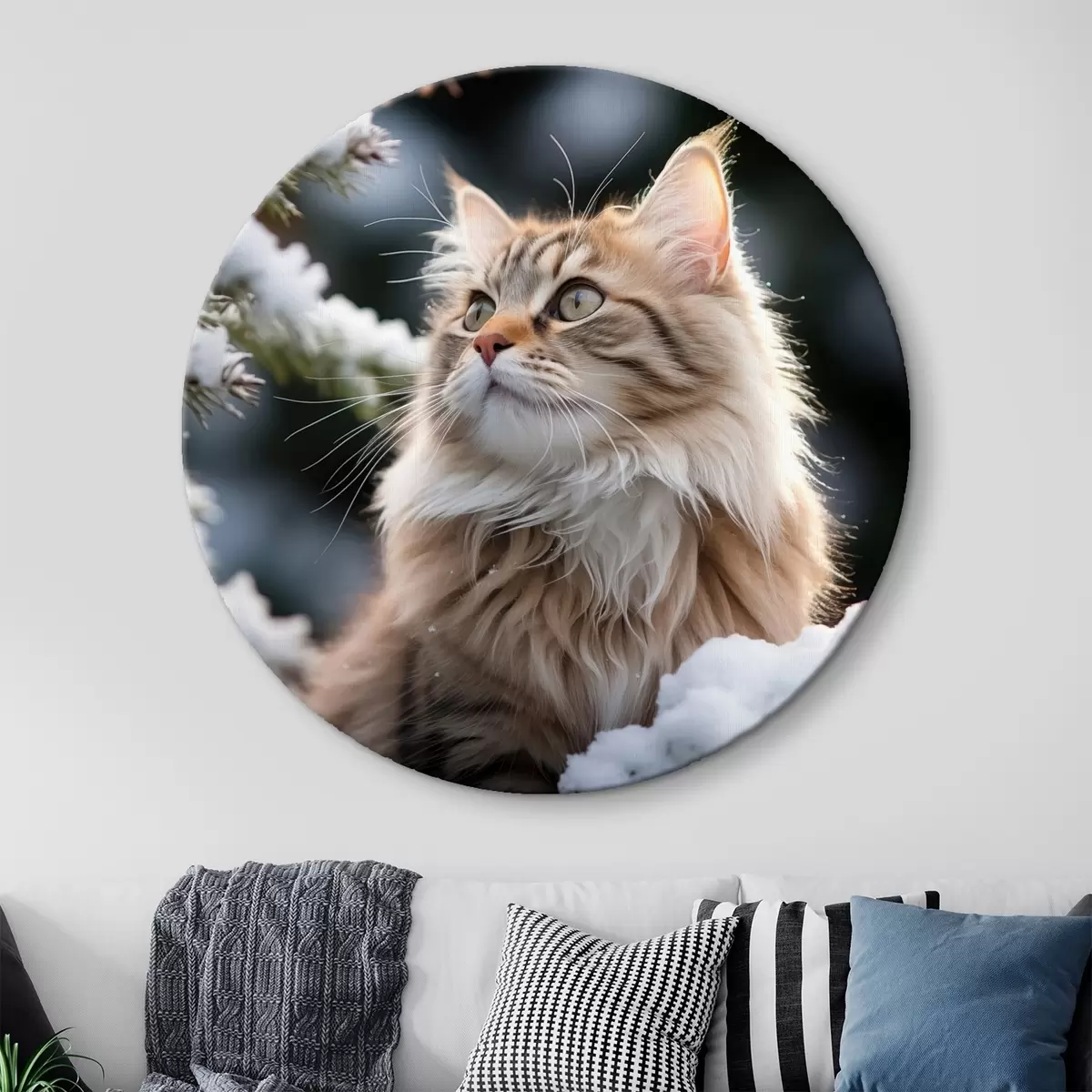 Runde Gemälde Eine flauschige rothaarige Katze sitzt in der Nähe des Schnees auf einem dunklen Hintergrund r41435