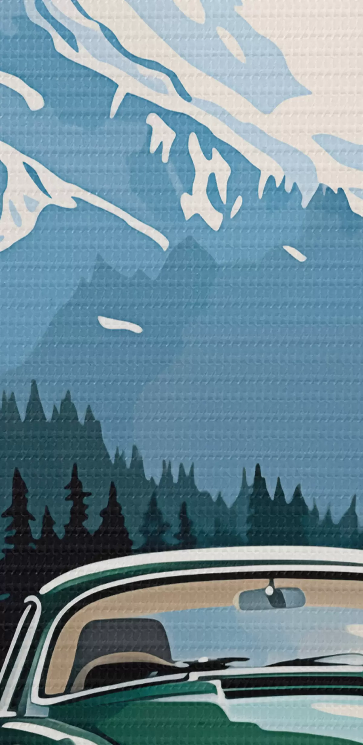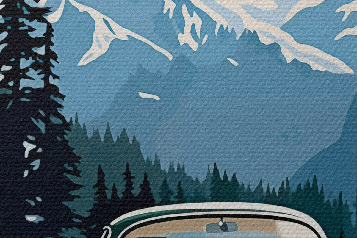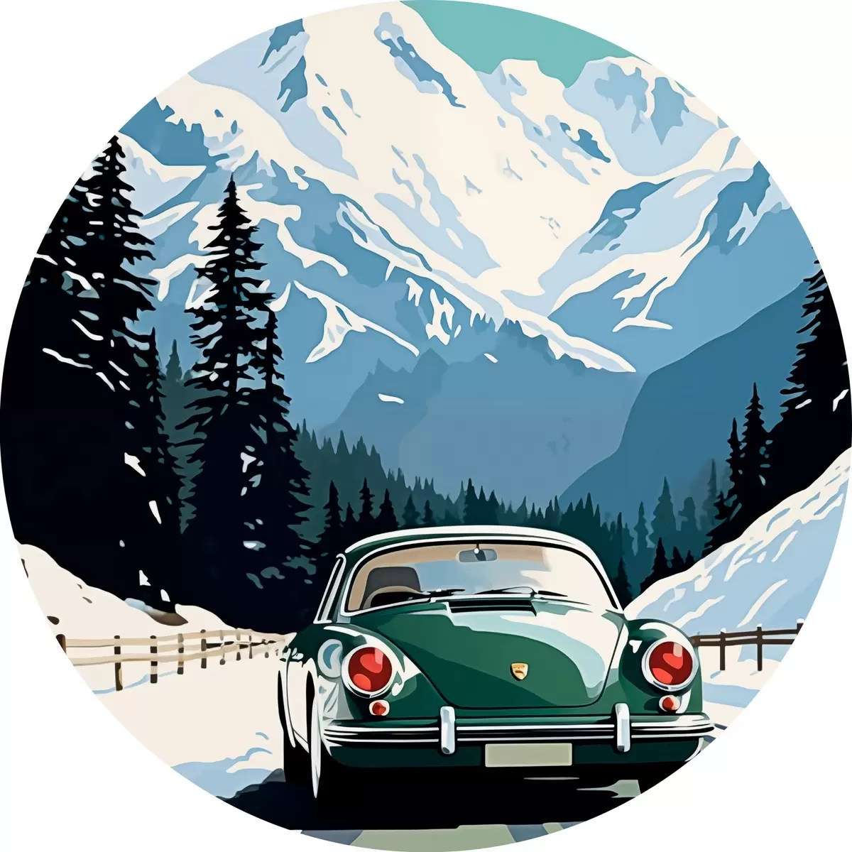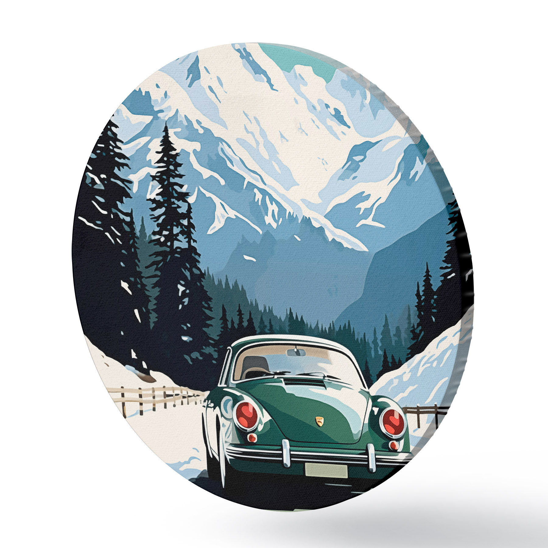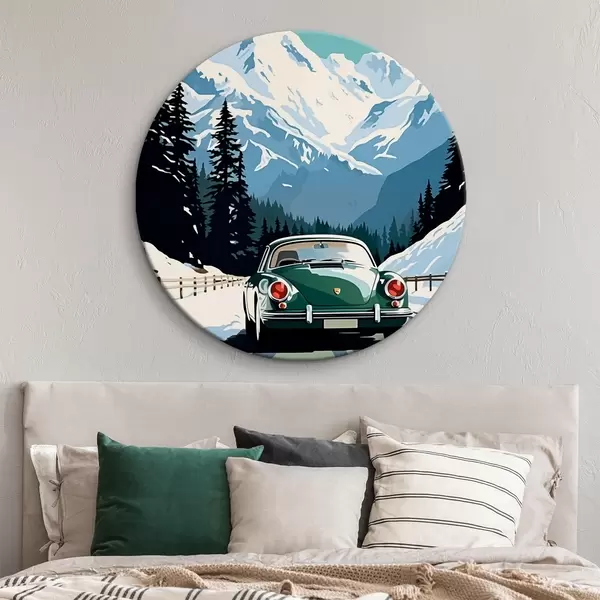 Runde Gemälde Retro-Auto auf einer winterlichen Bergstraße r41478
