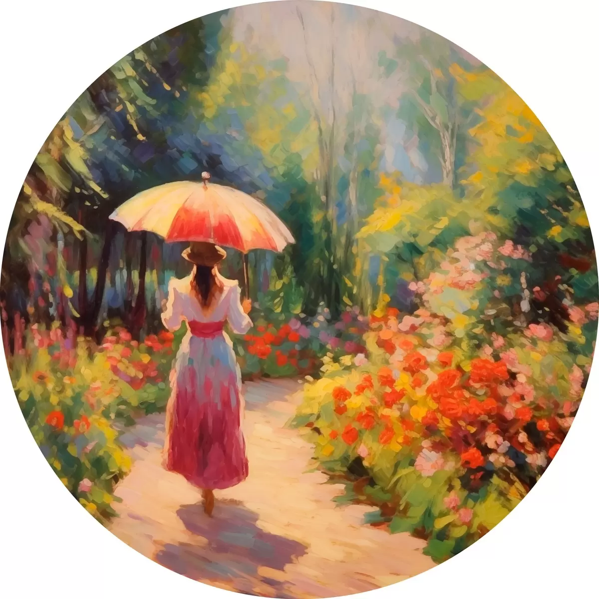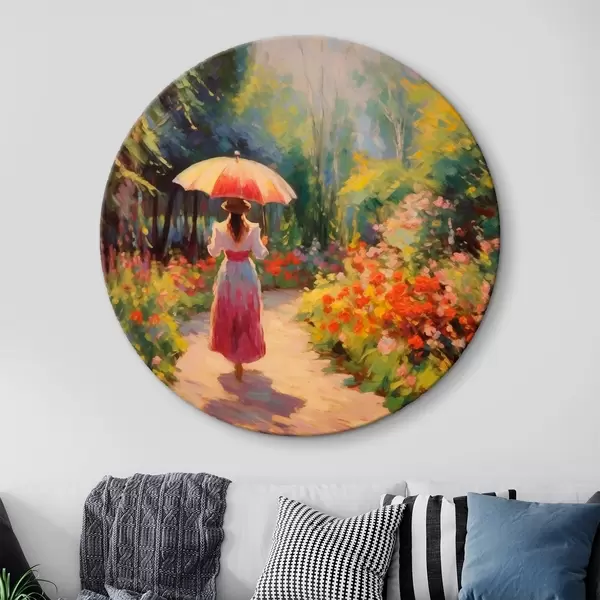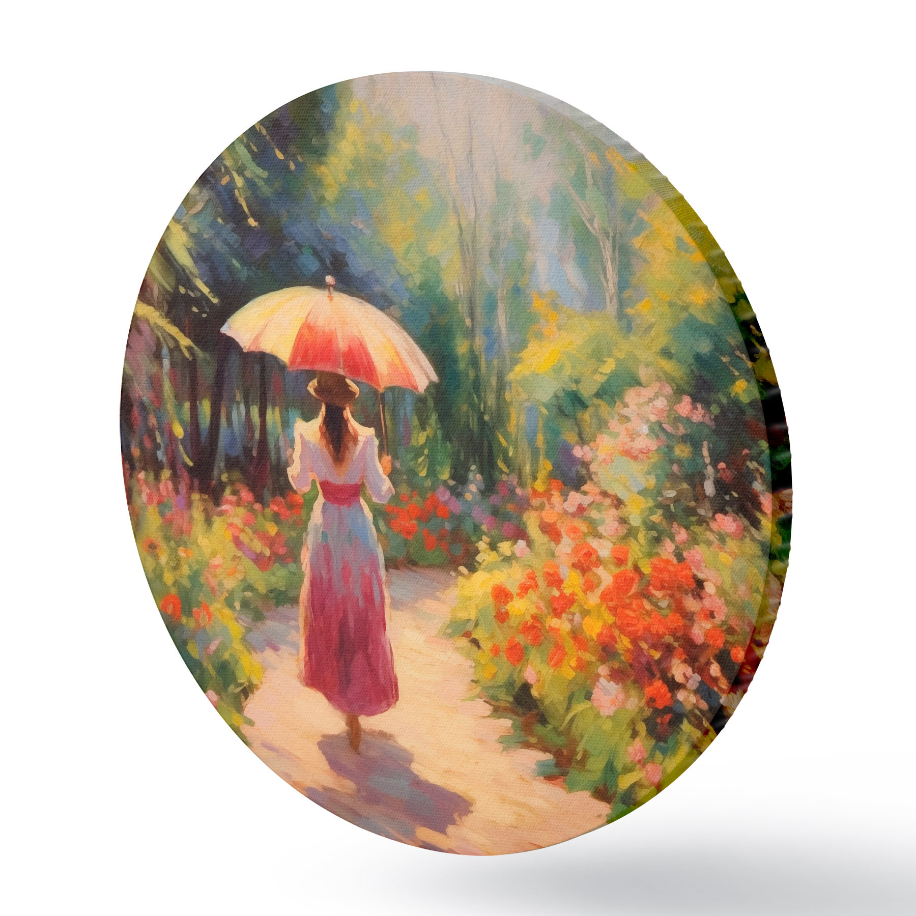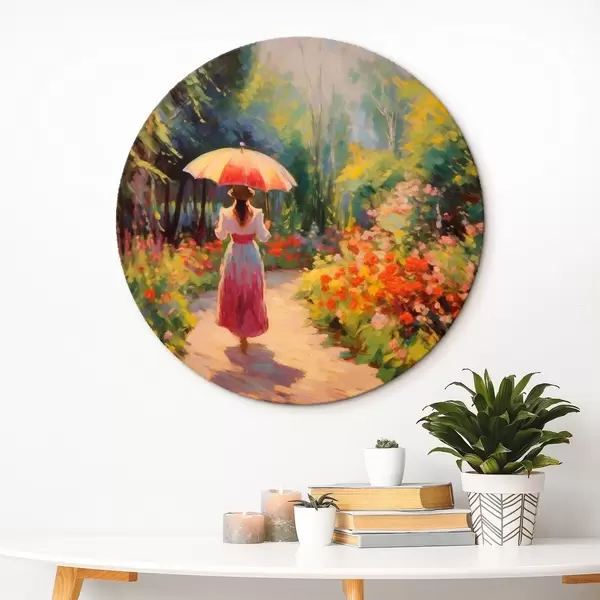 Runde Gemälde Dame mit Regenschirm in einem blühenden Garten r41495