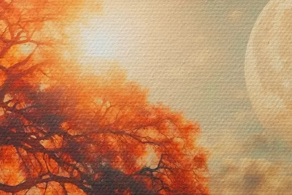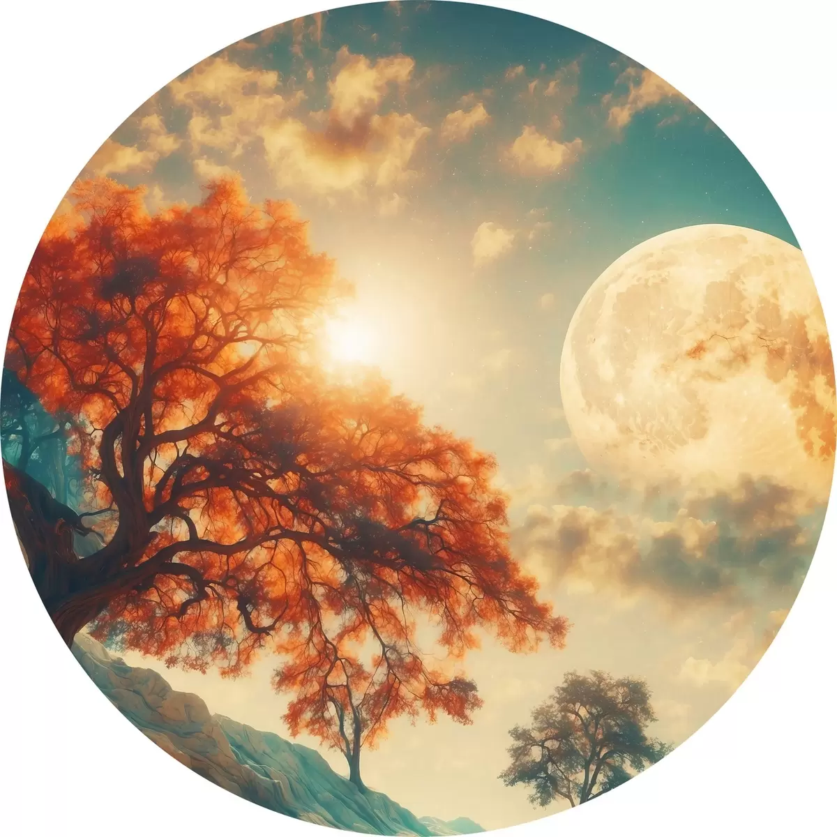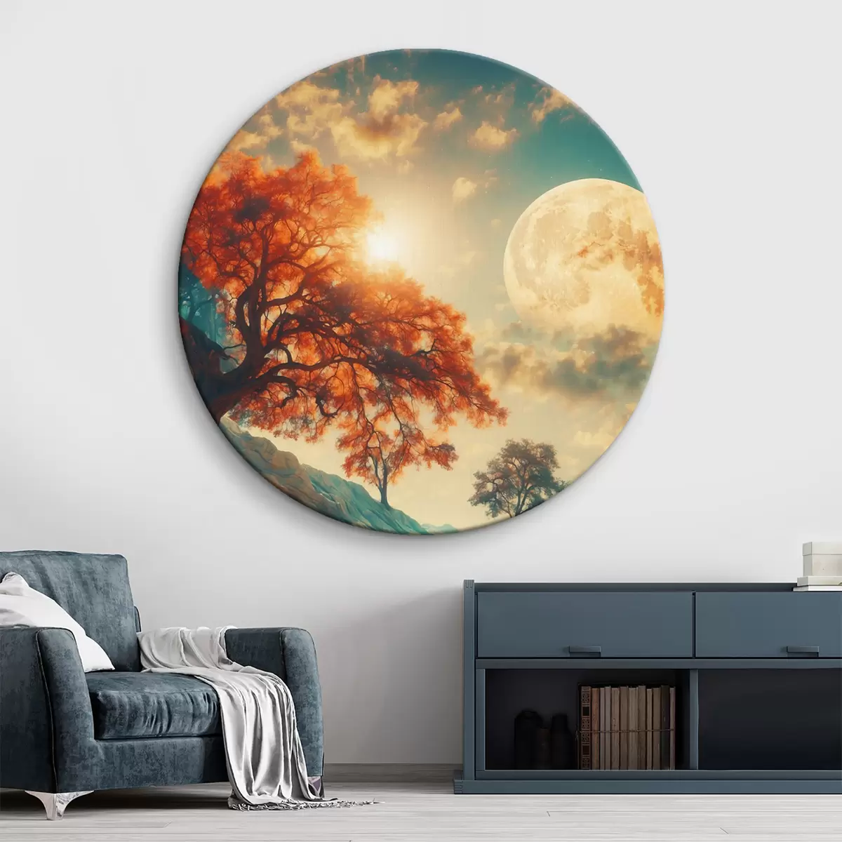 Runde Gemälde Bäume und Berge auf riesigem Mondhintergrund r41774