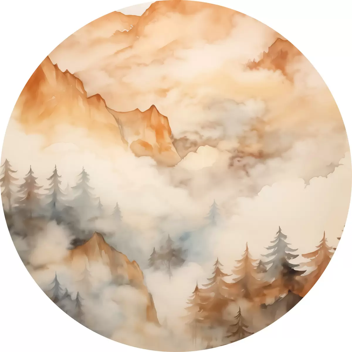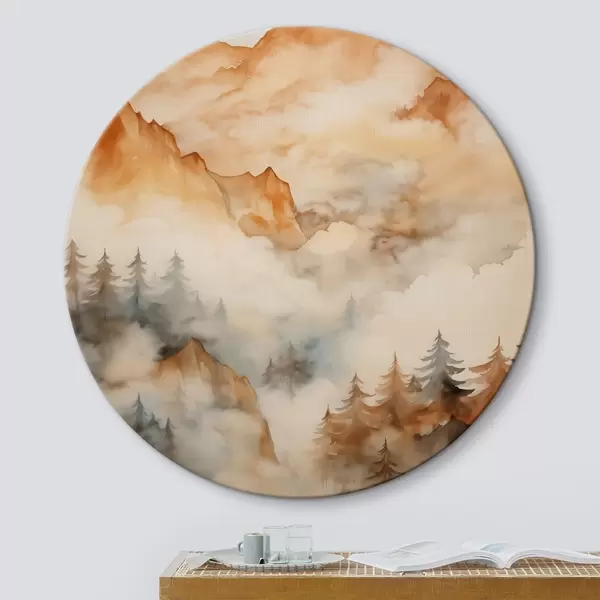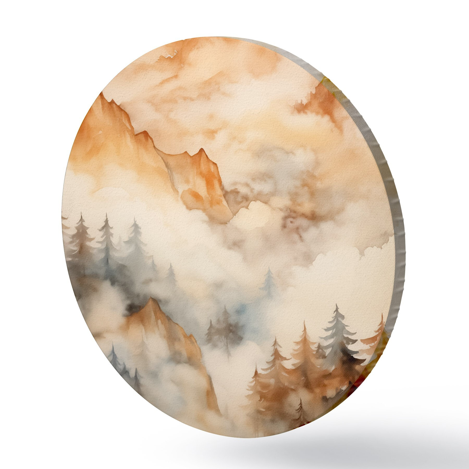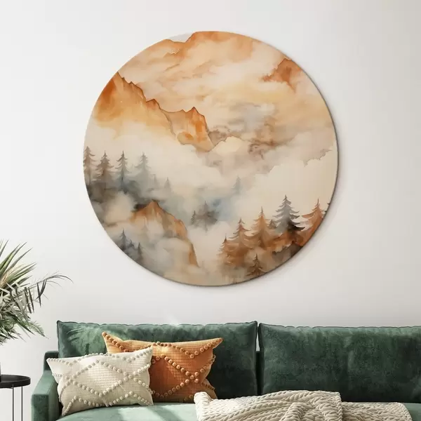 Runde Gemälde Wald und Berge Nachahmung von Aquarell, orange Farbtöne r42119