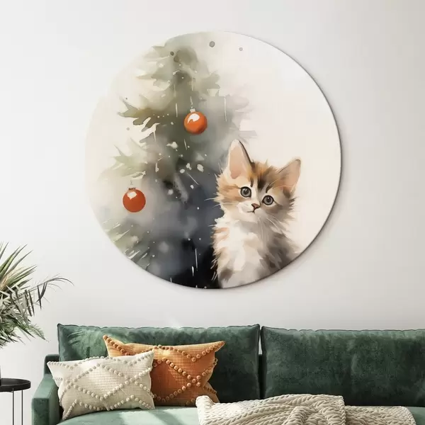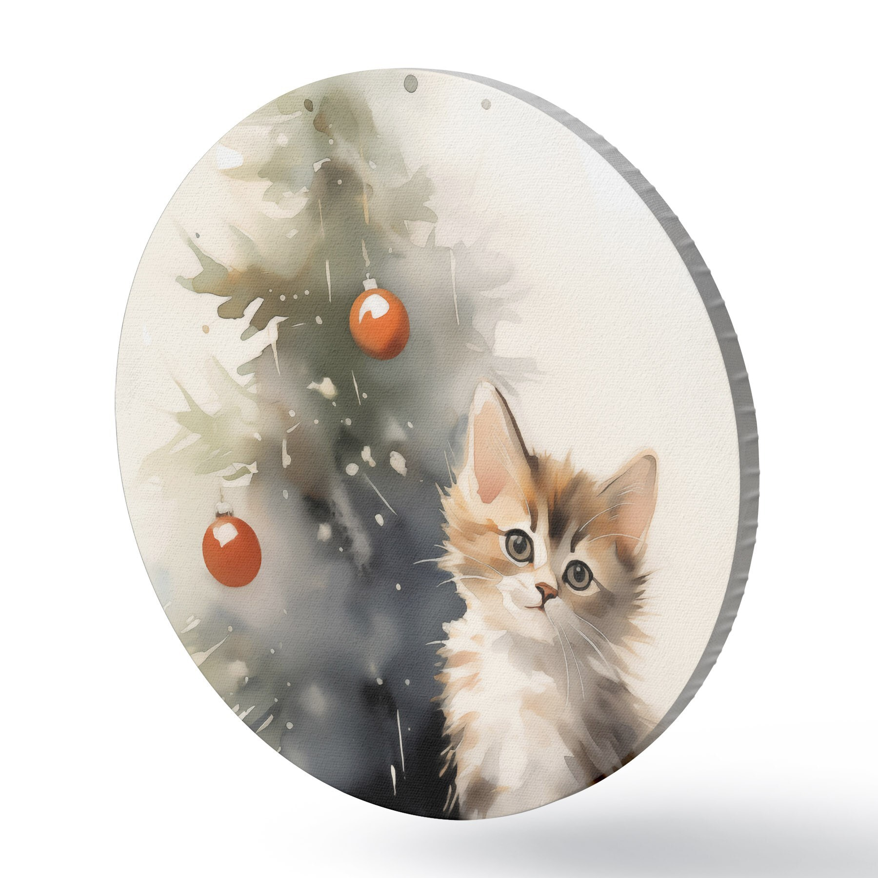 Runde Gemälde Kätzchen in der Nähe des Weihnachtsbaums Nachahmung des nassen Aquarells r42140
