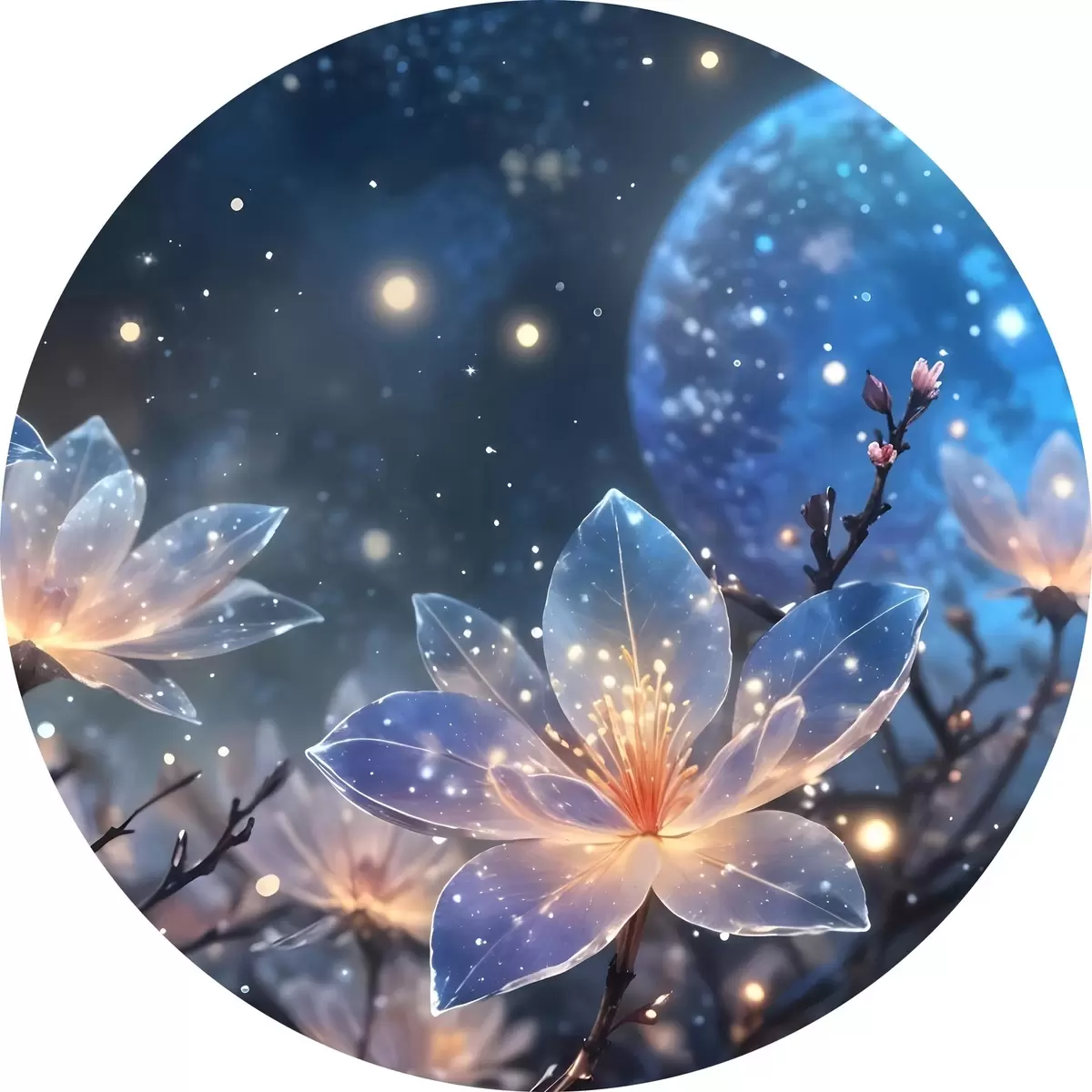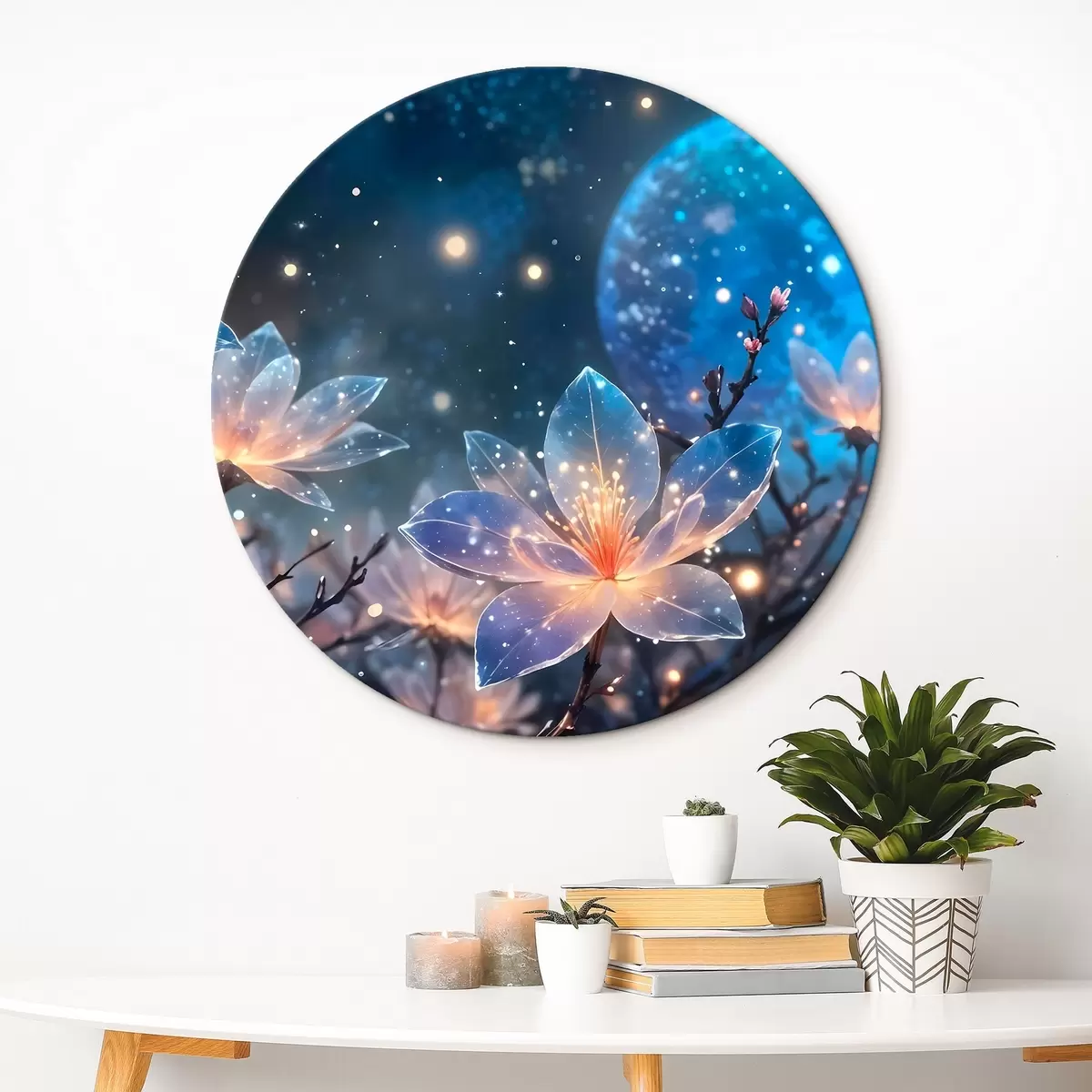 Runde Gemälde Abstrakte Fantasie Blumen auf Zweigen mit strukturierten Blütenblättern mit Sternen und einem Mond in einem Nachthimmel Hintergrund r42211