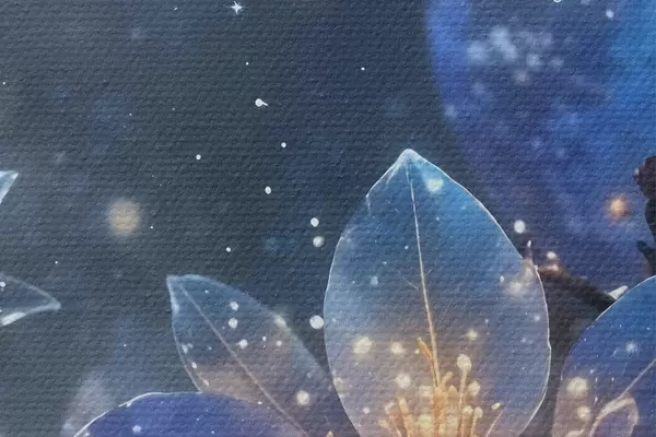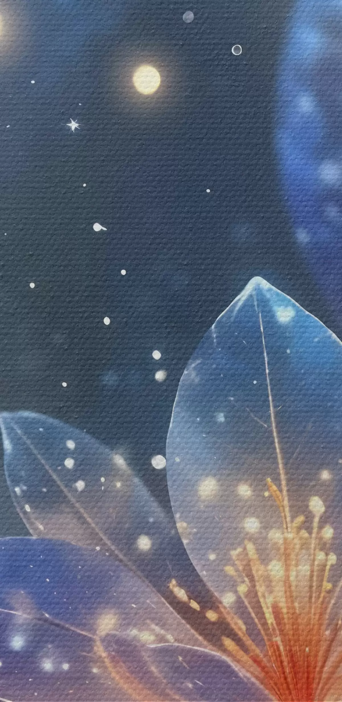 Bild Abstrakte Fantasie Blumen auf Zweigen mit strukturierten Blütenblättern mit Sternen und einem Mond in einem Nachthimmel Hintergrund Nr r42211
