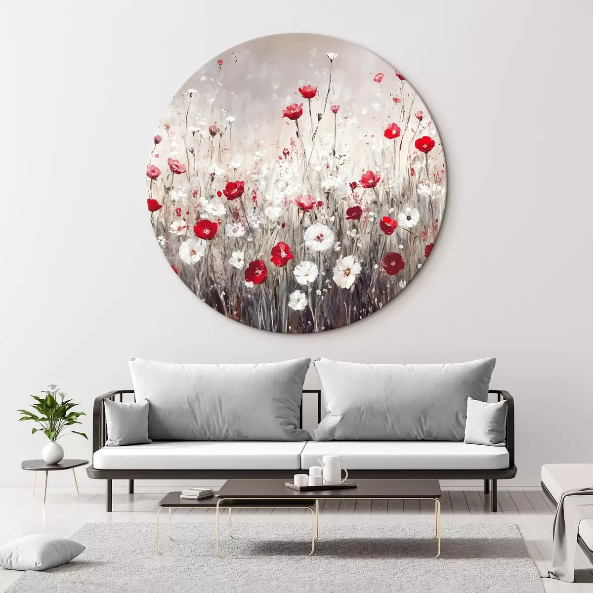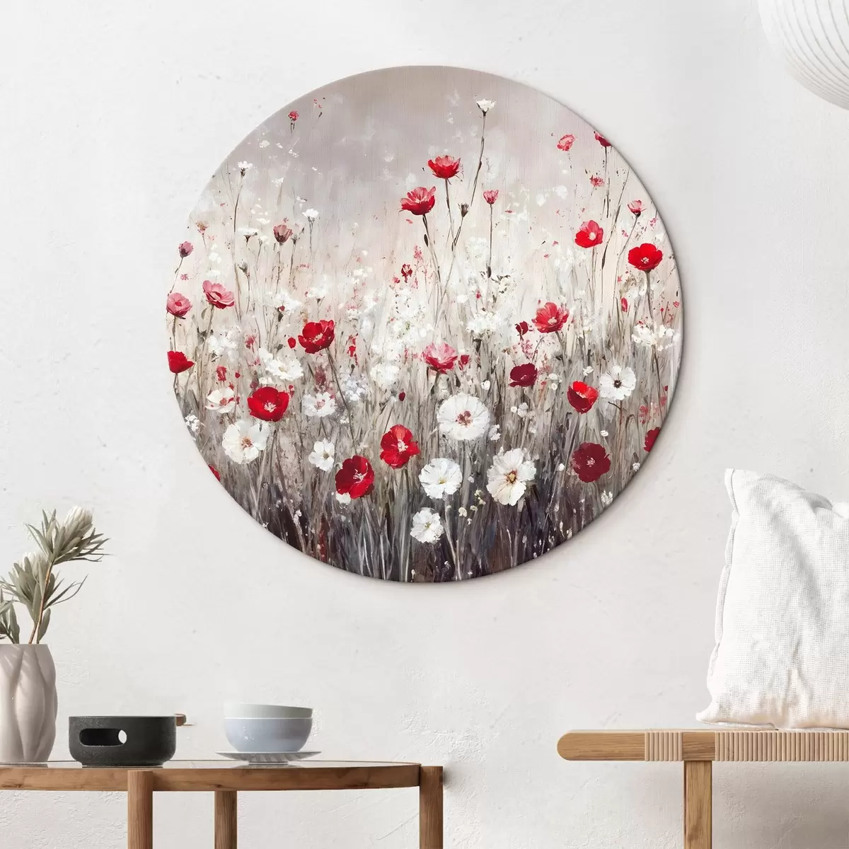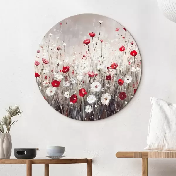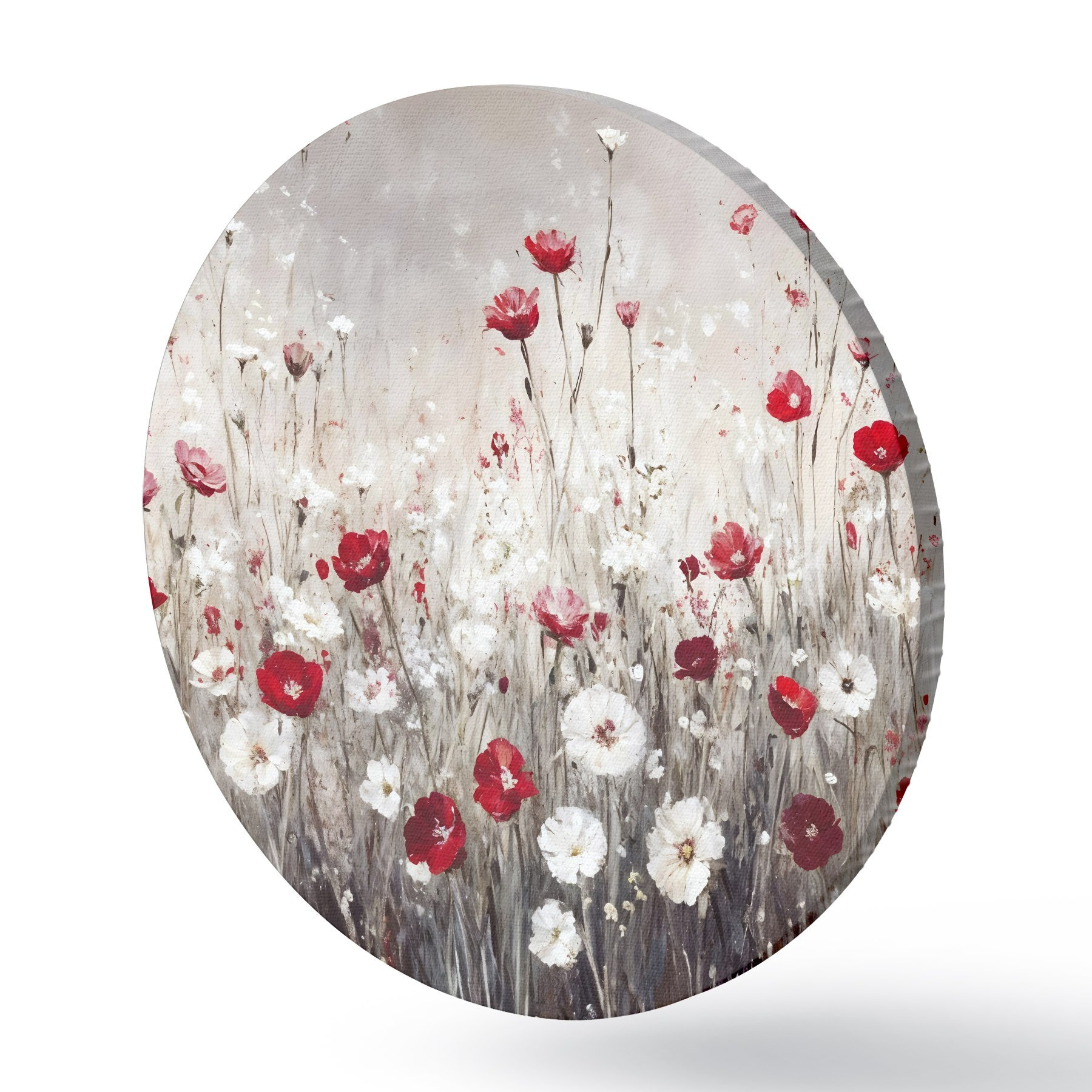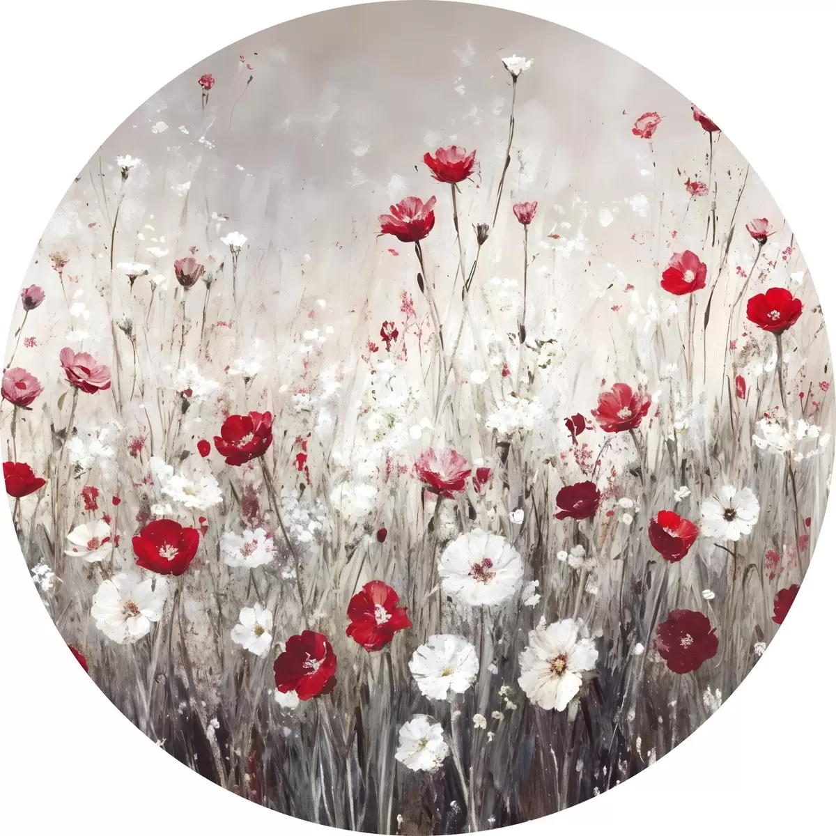 Runde Gemälde Abstrakte Nachahmung der Ölmalerei ein Feld von roten und weißen Mohnblumen und Gänseblümchen vor einem grauen strukturierten Hintergrund r42213