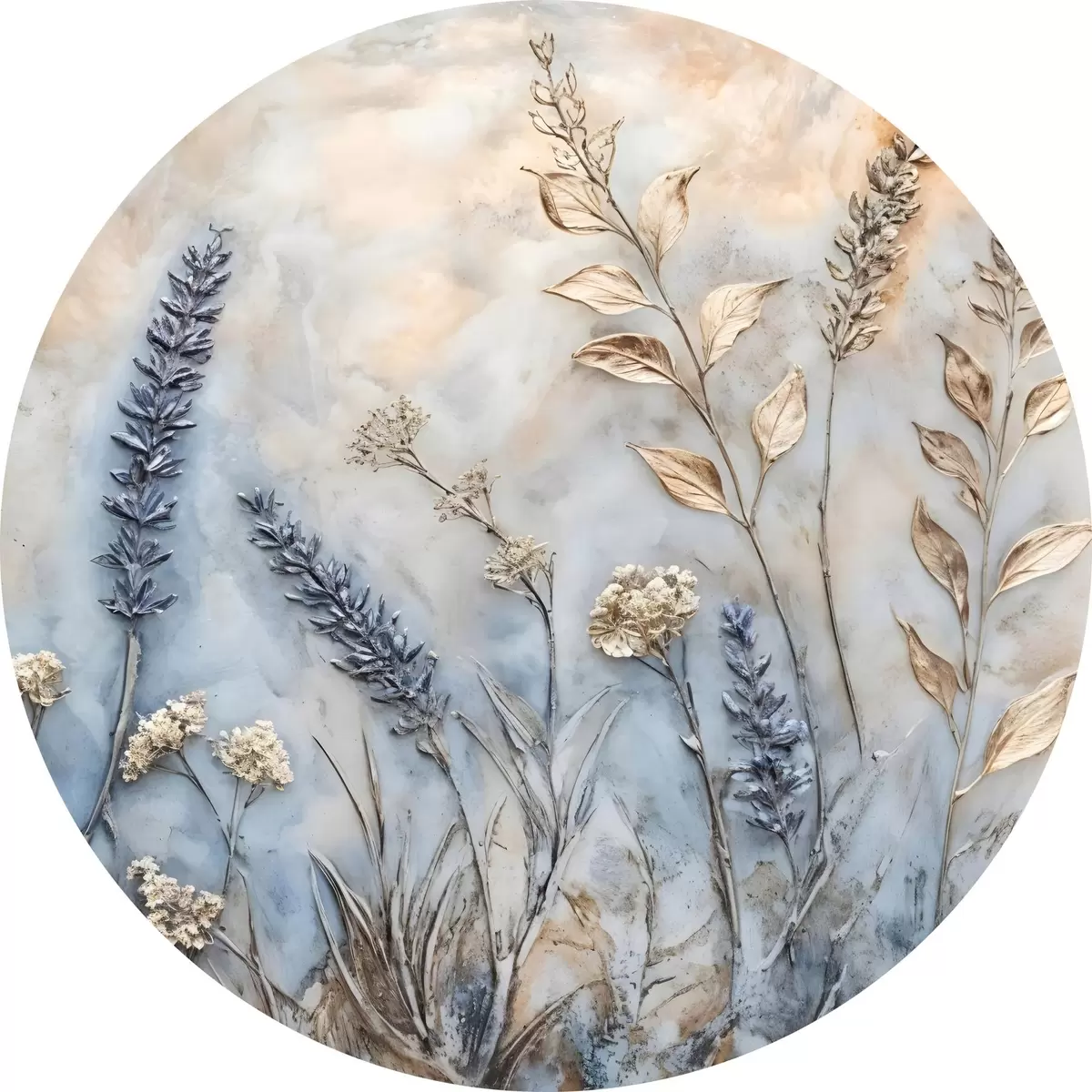 Runde Gemälde Ein Feld mit verschiedenen Wildblumen und Pflanzen in Blau-, Weiß- und Beigetönen vor einem weichen, dunstigen Hintergrund r42214