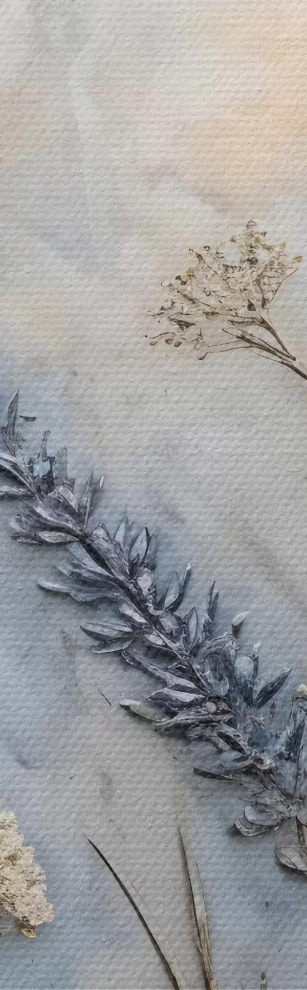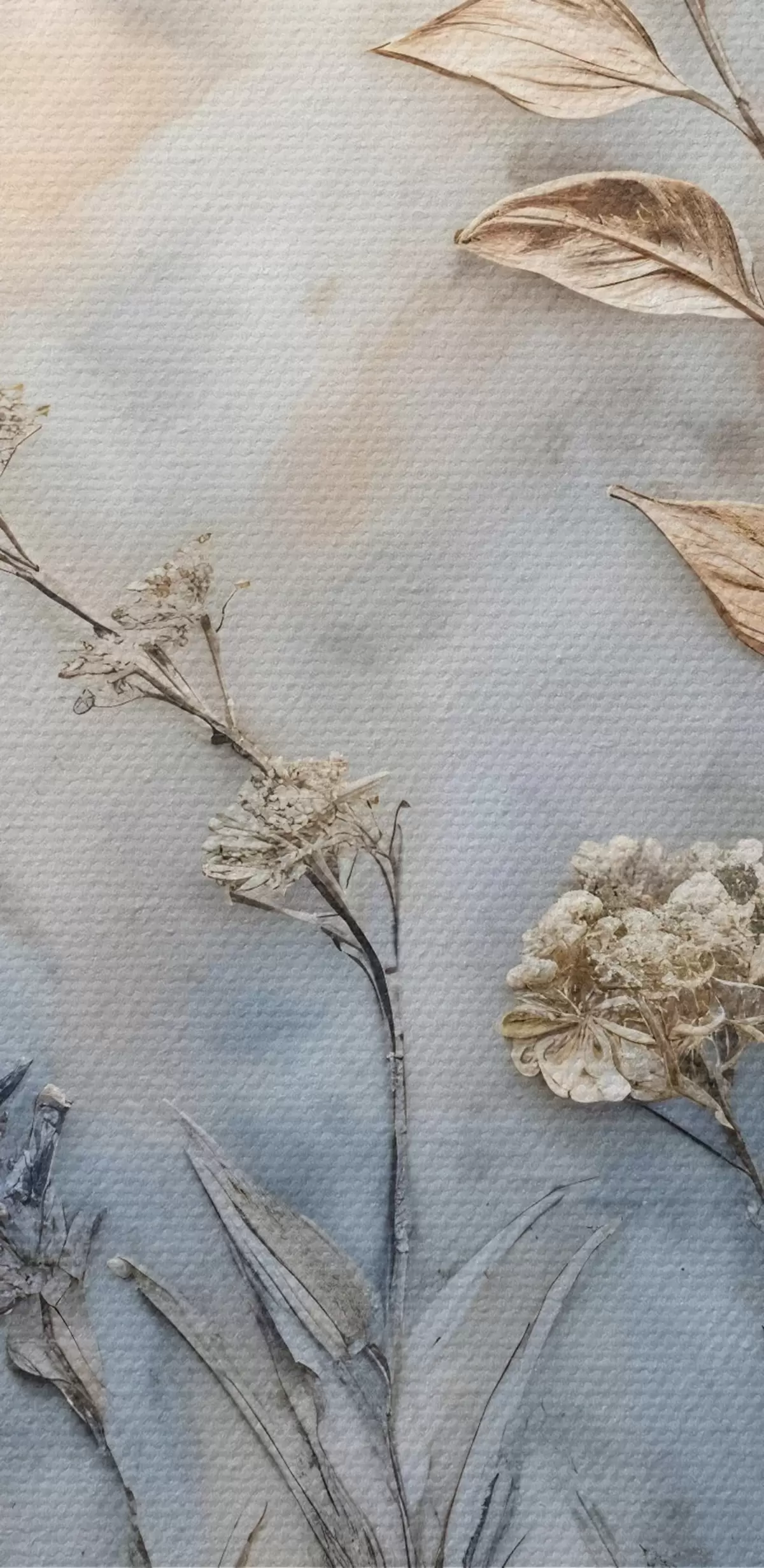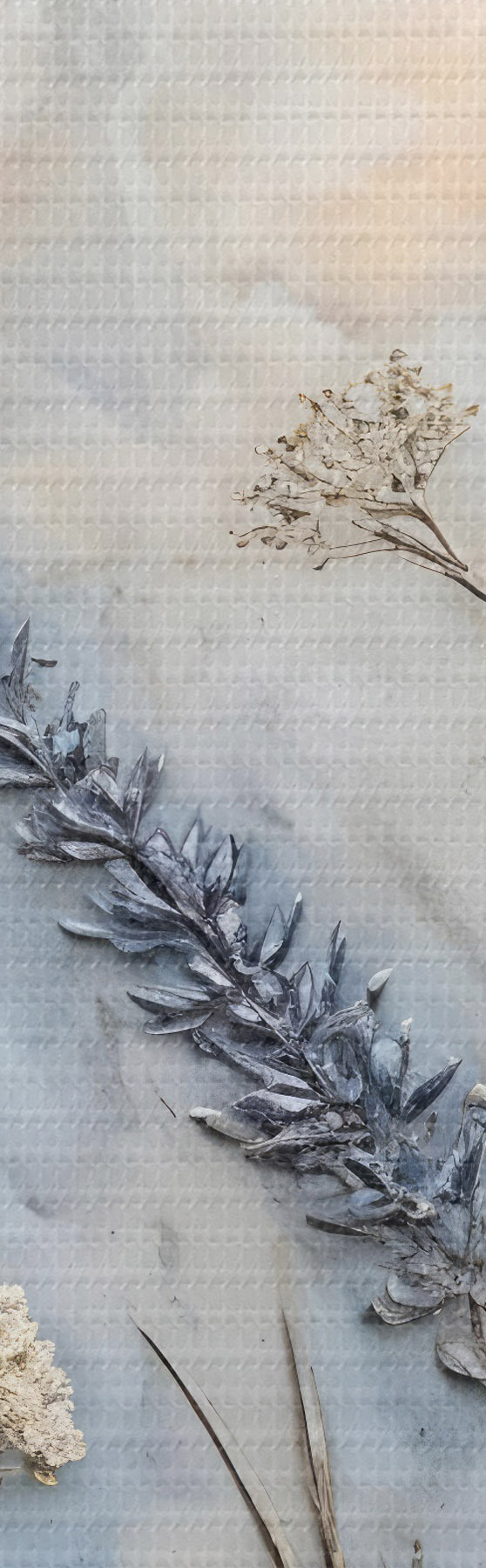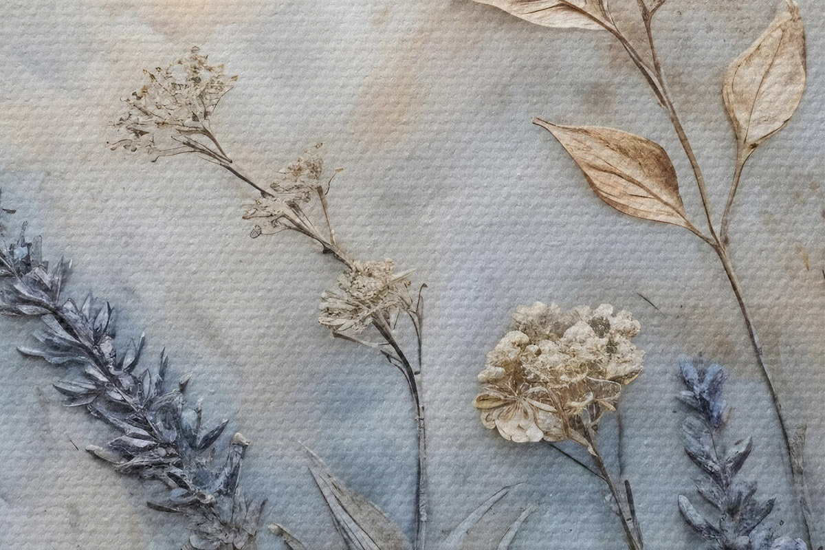Bild Ein Feld mit verschiedenen Wildblumen und Pflanzen in Blau-, Weiß- und Beigetönen vor einem weichen, dunstigen Hintergrund Nr r42214