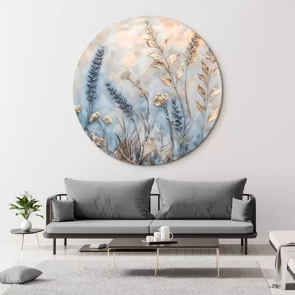 Runde Gemälde Ein Feld mit verschiedenen Wildblumen und Pflanzen in Blau-, Weiß- und Beigetönen vor einem weichen, dunstigen Hintergrund r42214