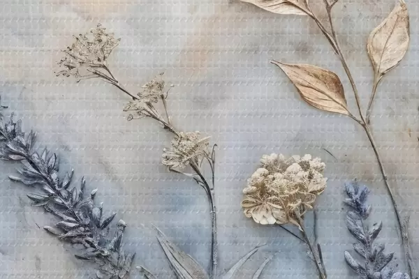 Bild Ein Feld mit verschiedenen Wildblumen und Pflanzen in Blau-, Weiß- und Beigetönen vor einem weichen, dunstigen Hintergrund Nr r42214