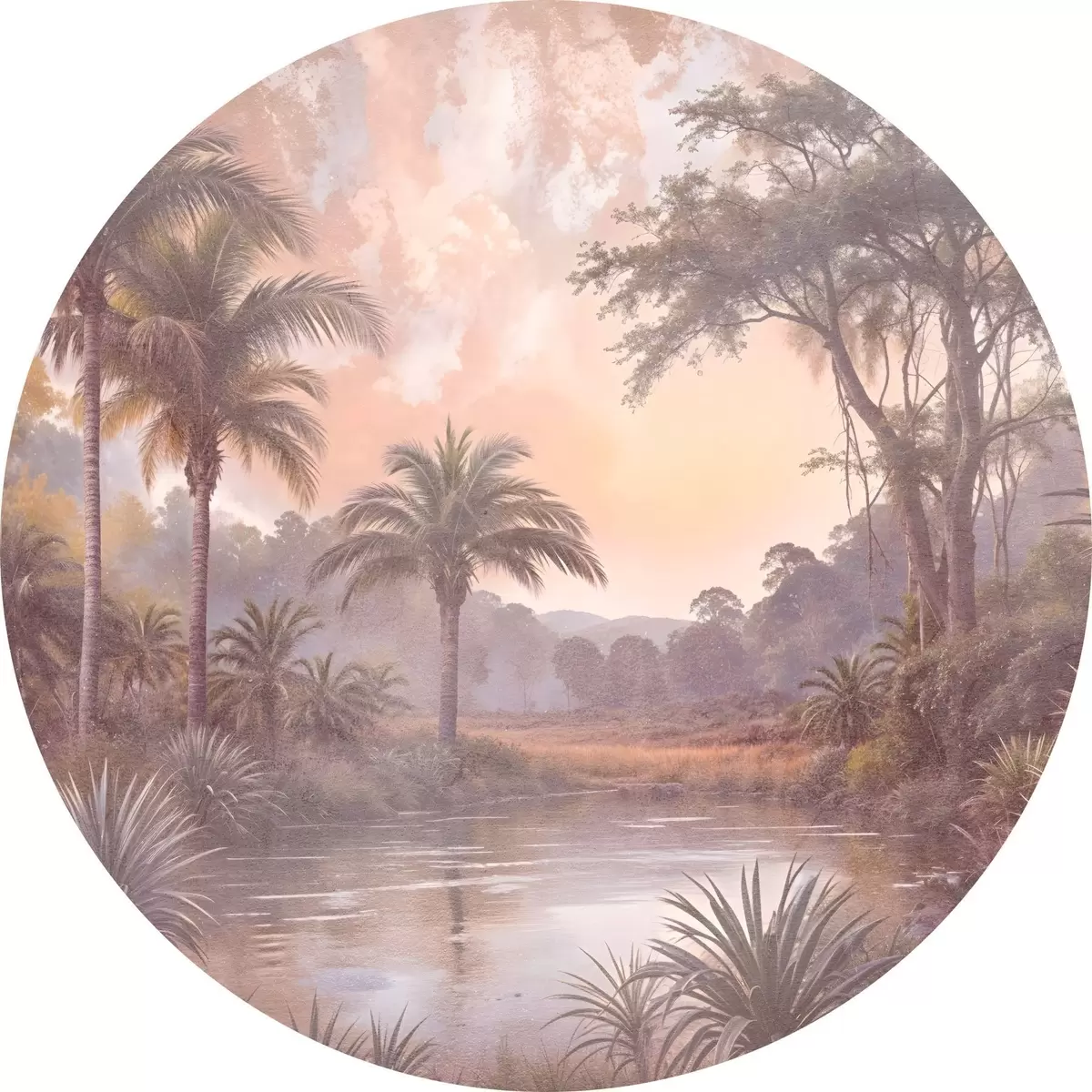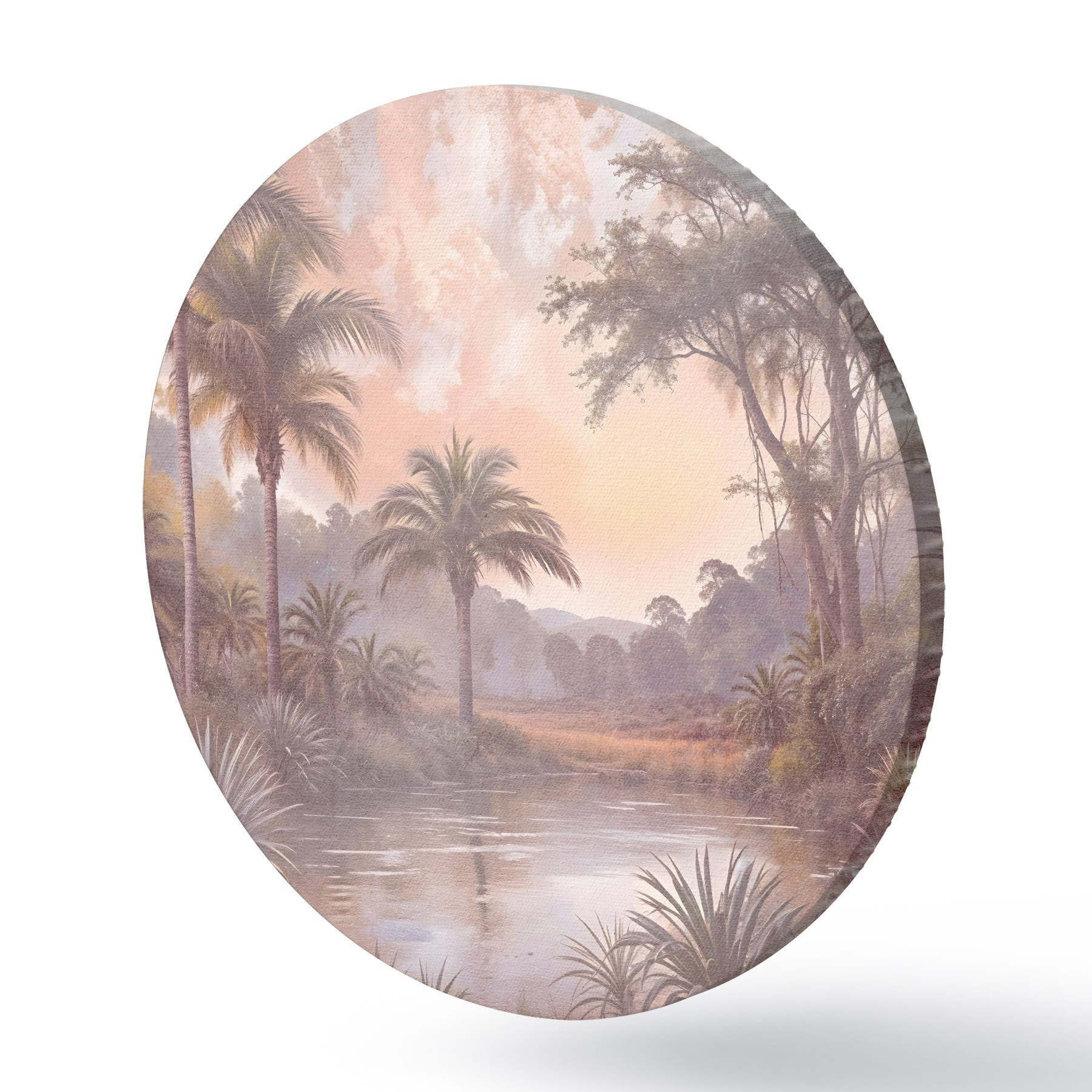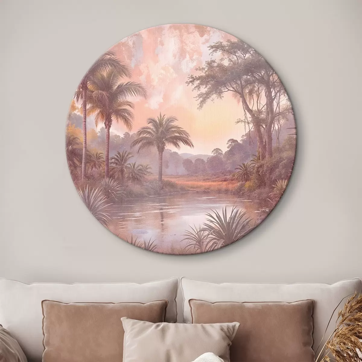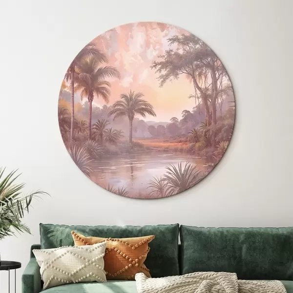 Runde Gemälde Eine tropisch strukturierte Landschaft mit einem ruhigen See, umgeben von üppigen Palmen und anderem Laub r42219