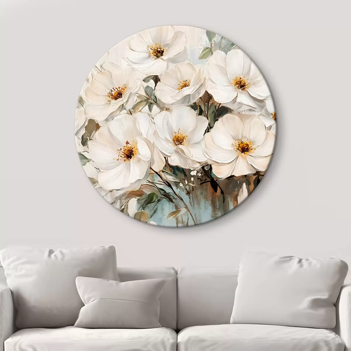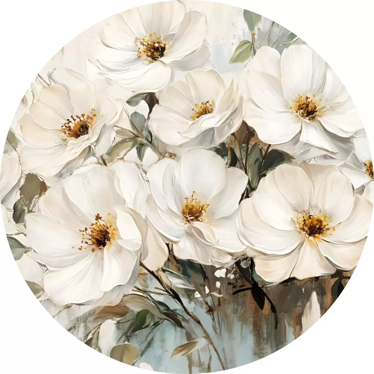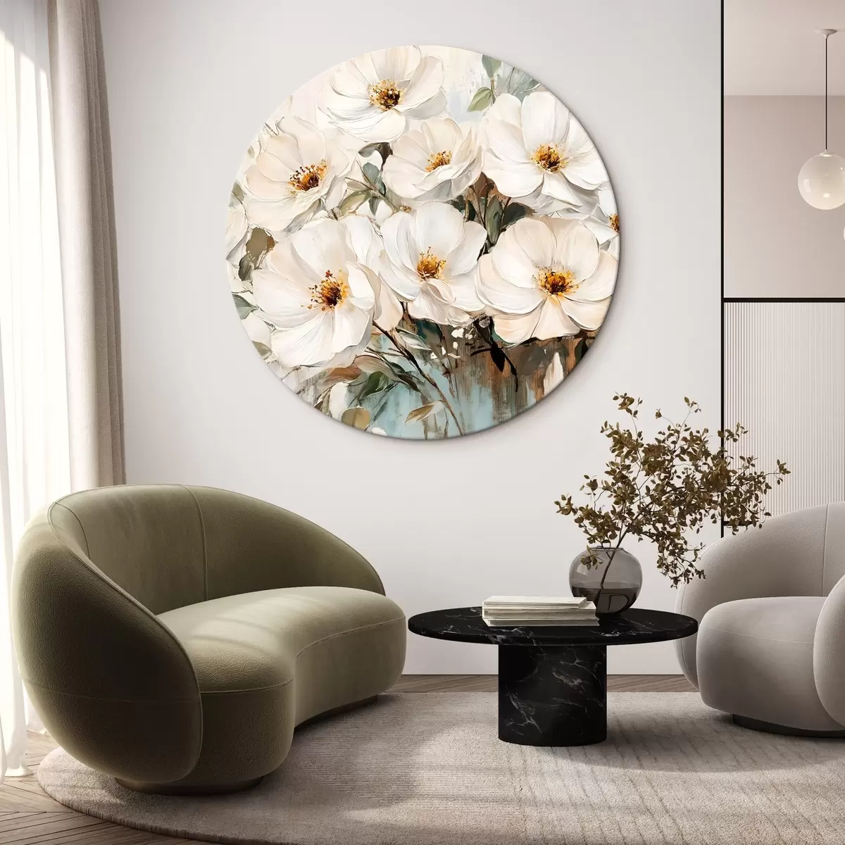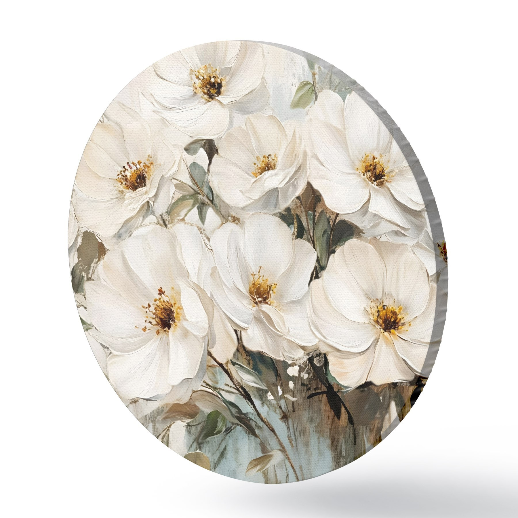 Runde Gemälde Ein Strauß großer weißer Blumen in Ölmalerei Stil mit gelben Zentren vor einem hellen Hintergrund r42222