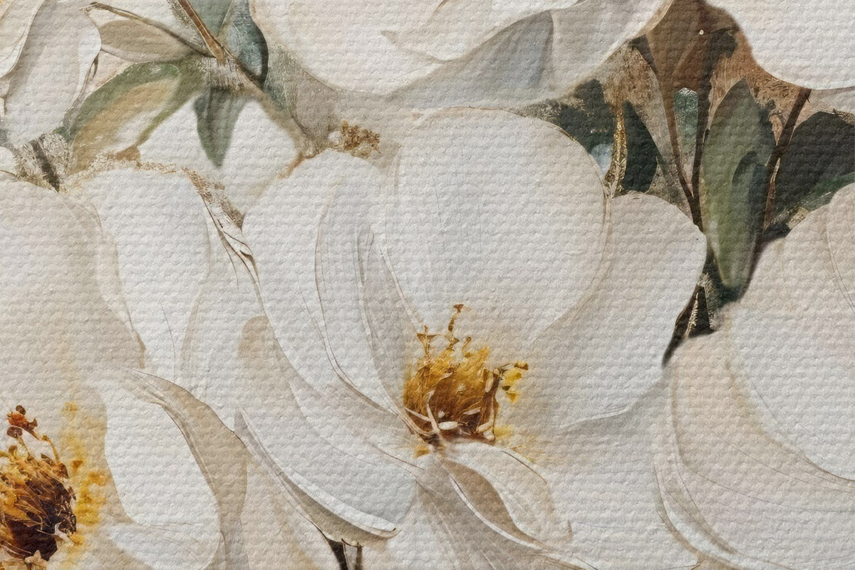 Bild Ein Strauß großer weißer Blumen in Ölmalerei Stil mit gelben Zentren vor einem hellen Hintergrund Nr r42222