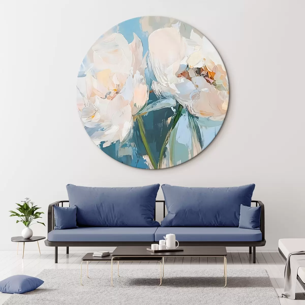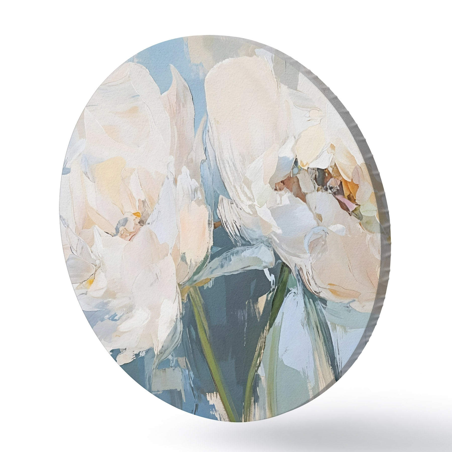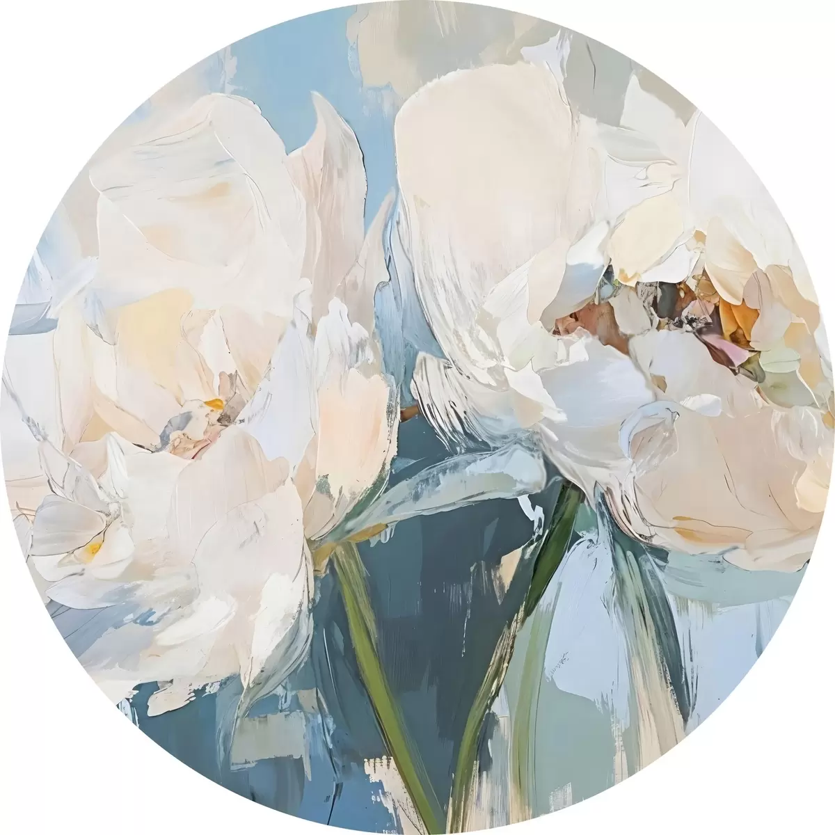 Runde Gemälde Weiße minimalistische abstrakte Pfingstrosen Ölgemälde Nachahmung gegen einen weichen blauen Hintergrund r42226