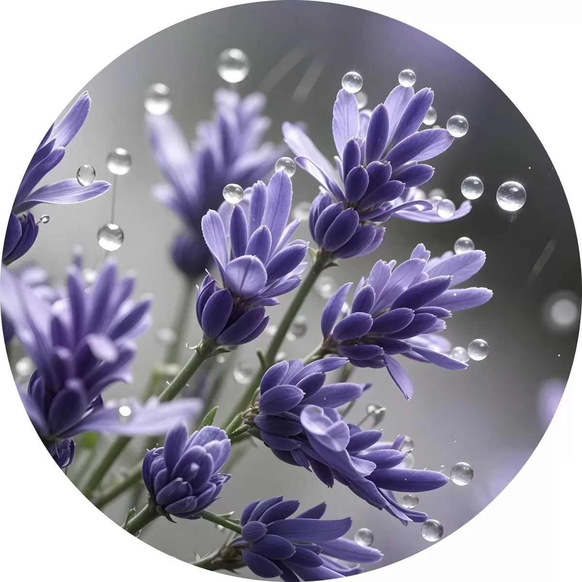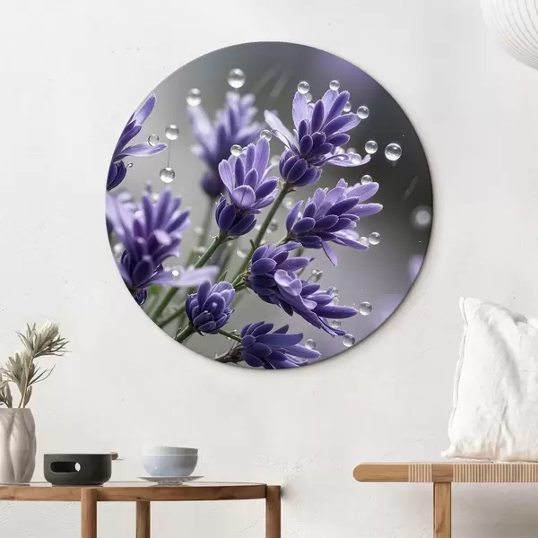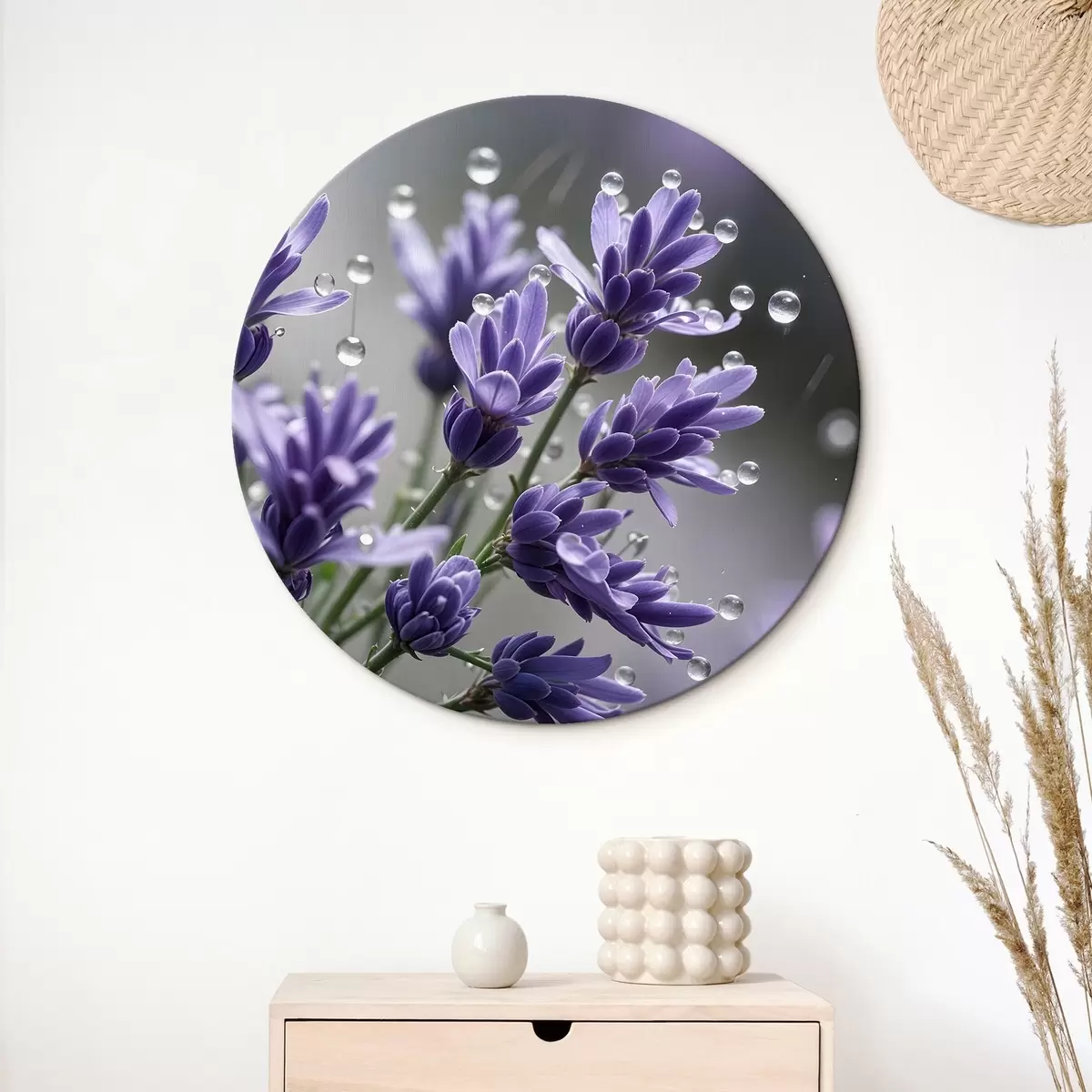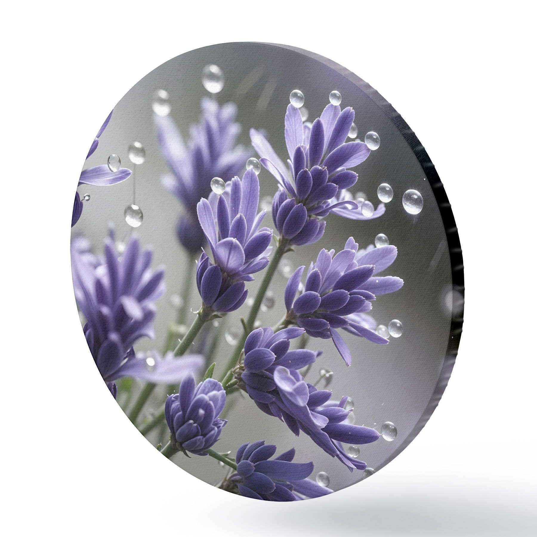 Runde Gemälde Lila Lavendelblüten mit Wassertropfen auf den Blütenblättern, vor einem unscharfen Hintergrund r42229