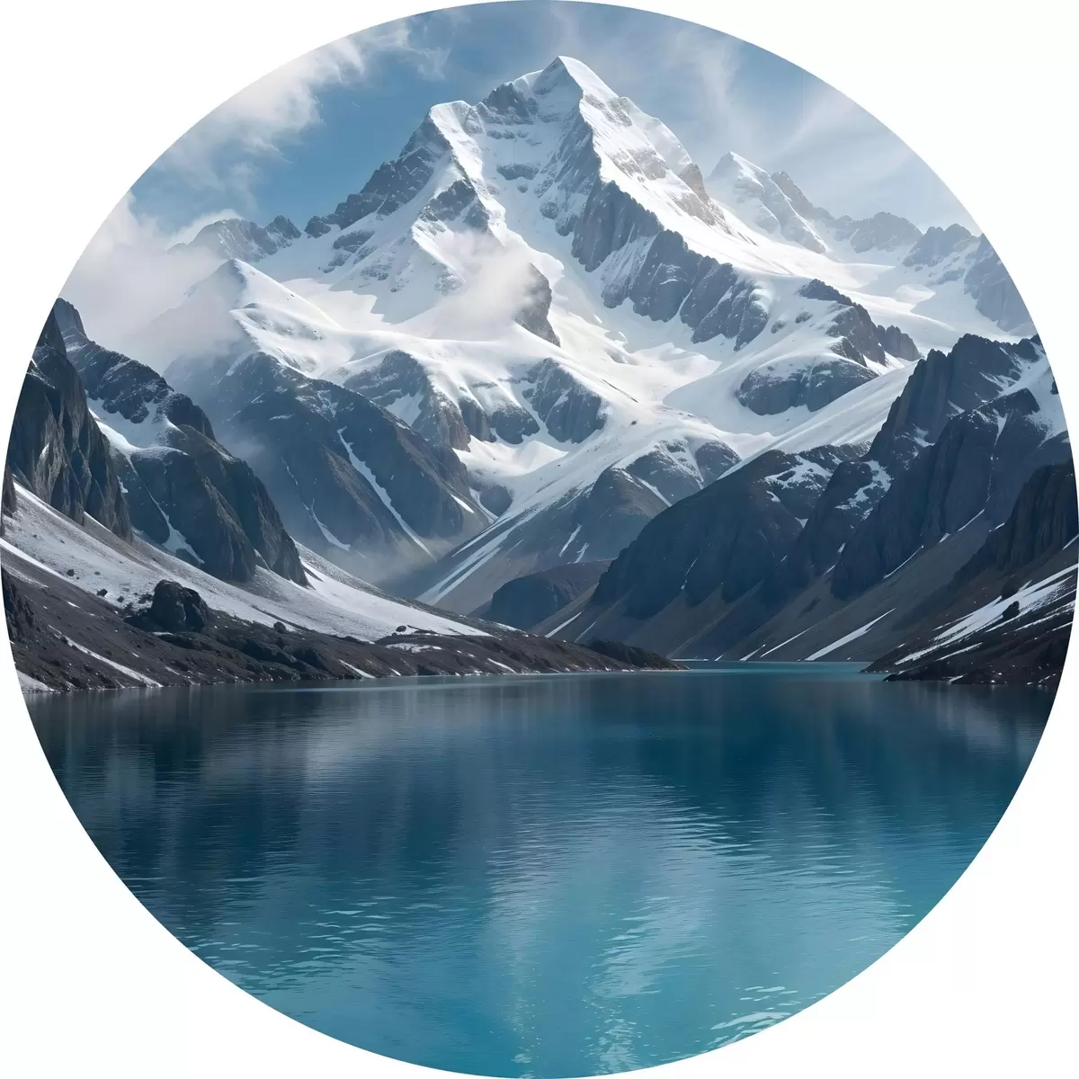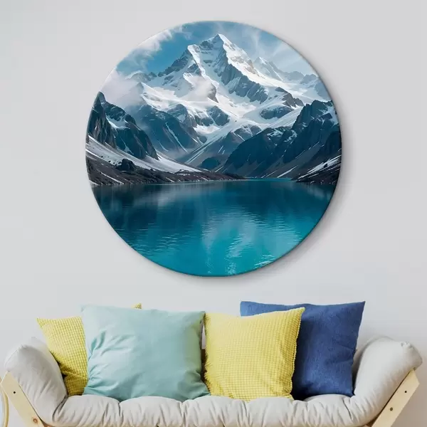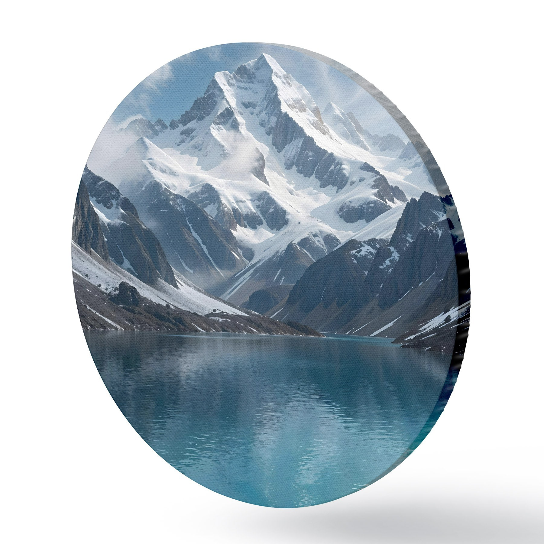 Runde Gemälde Ein schneebedeckter Berggipfel, der sich in einem ruhigen türkisfarbenen See spiegelt, umgeben von felsigem Gelände und dramatischen Wolken r42232