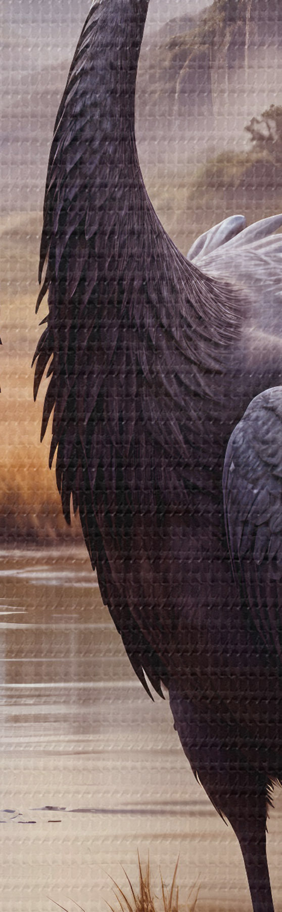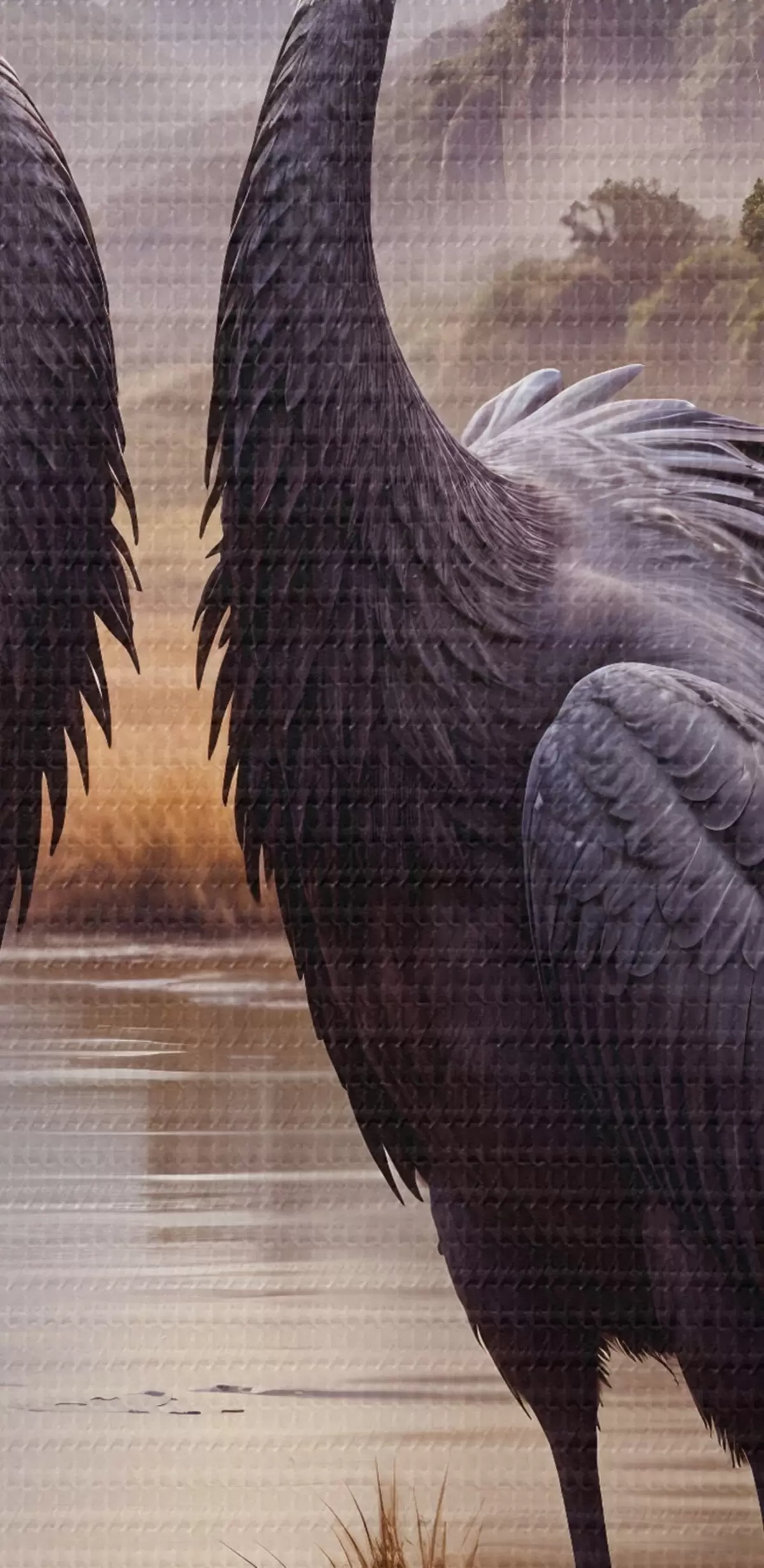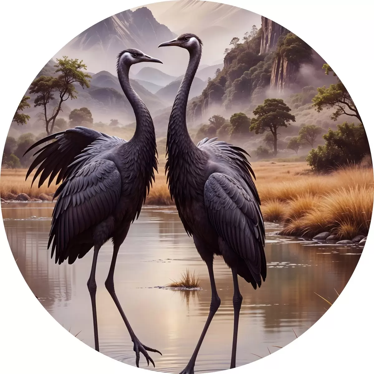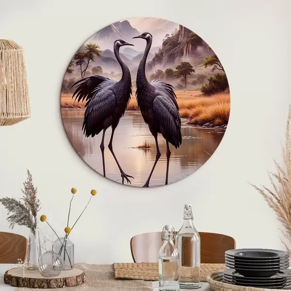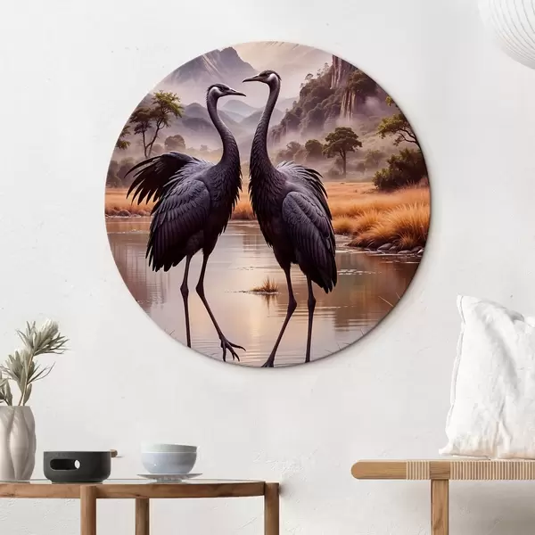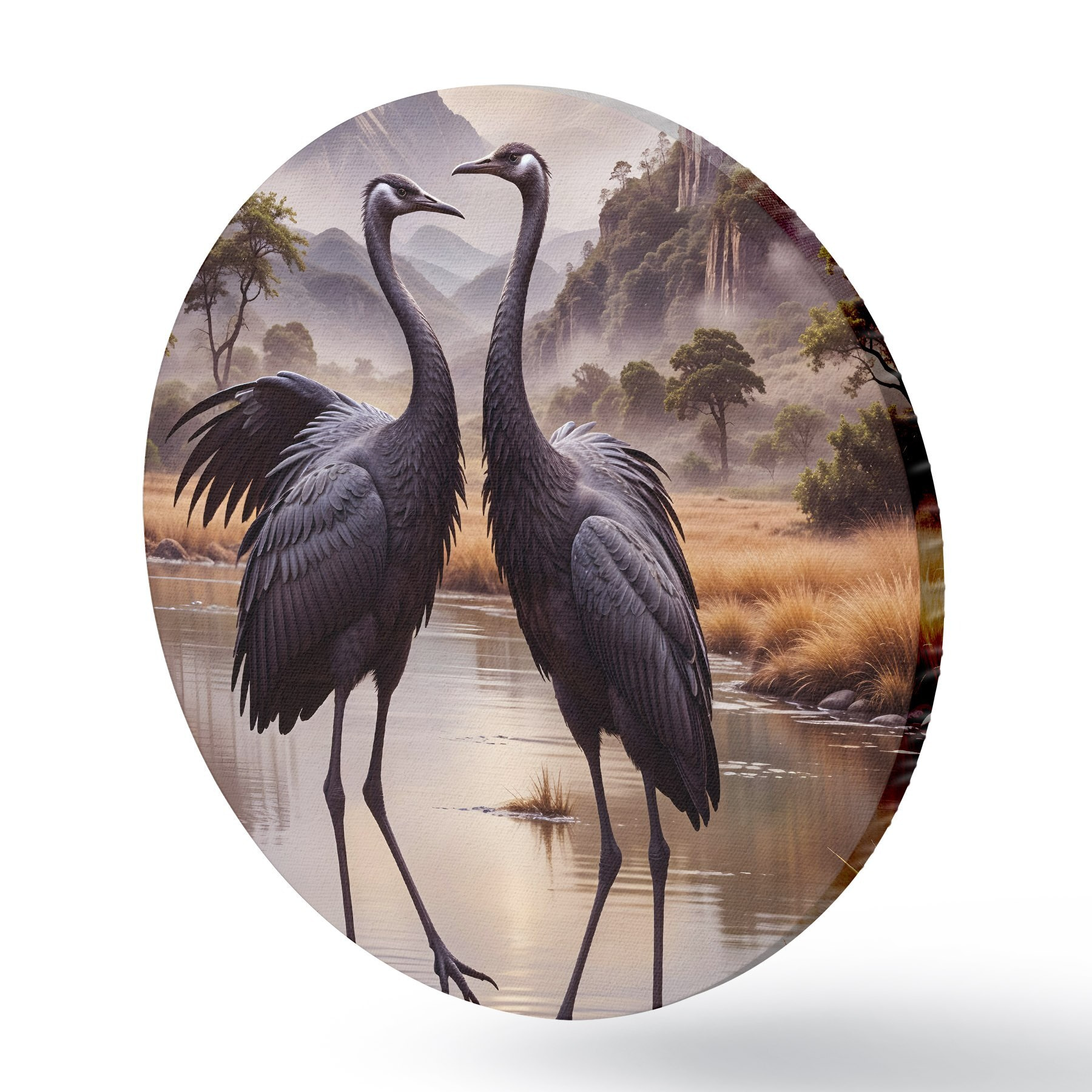 Runde Gemälde Zwei große schwarze Kraniche, die in einem flachen Teich stehen, mit einer bergigen Landschaft im Hintergrund r42240