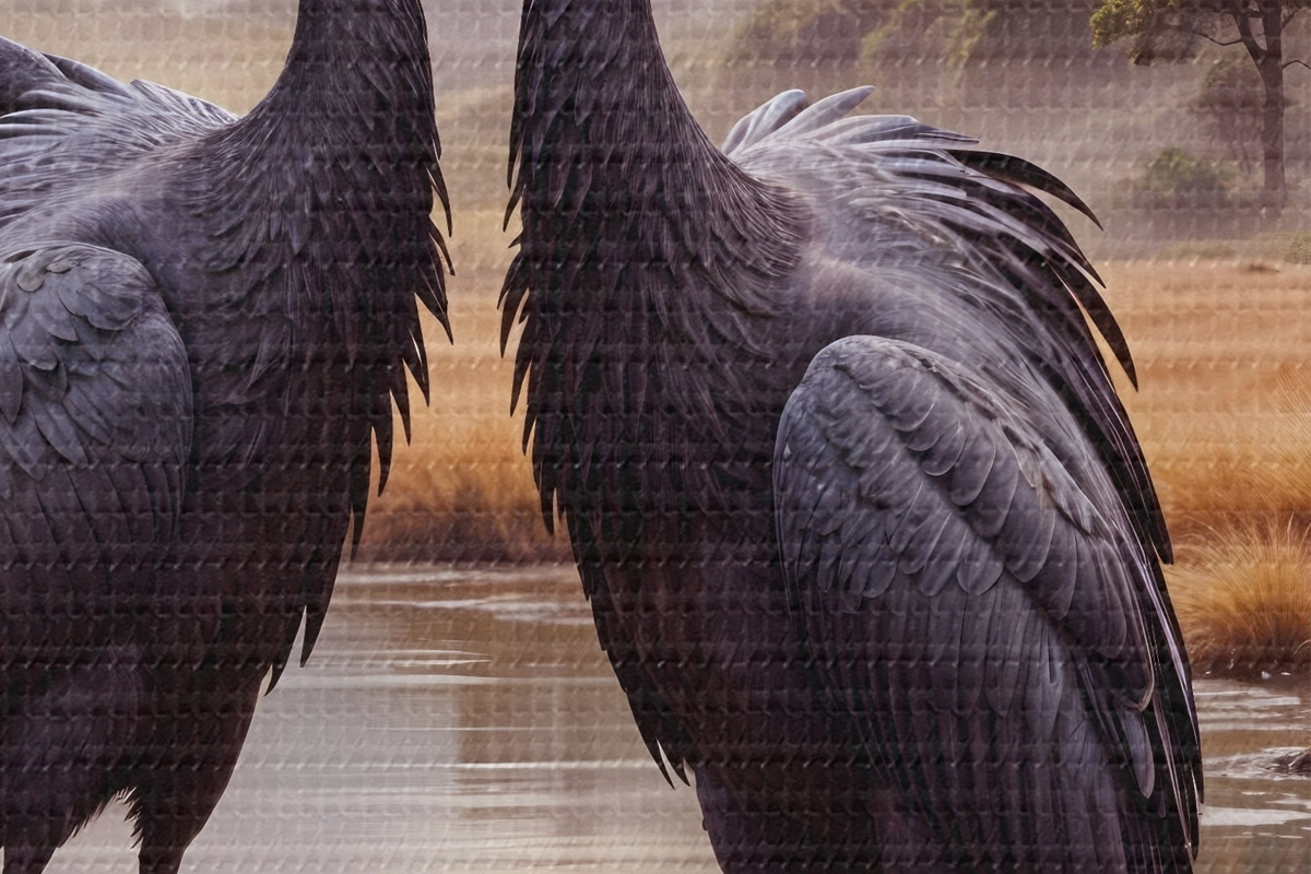 Bild Zwei große schwarze Kraniche, die in einem flachen Teich stehen, mit einer bergigen Landschaft im Hintergrund Nr r42240
