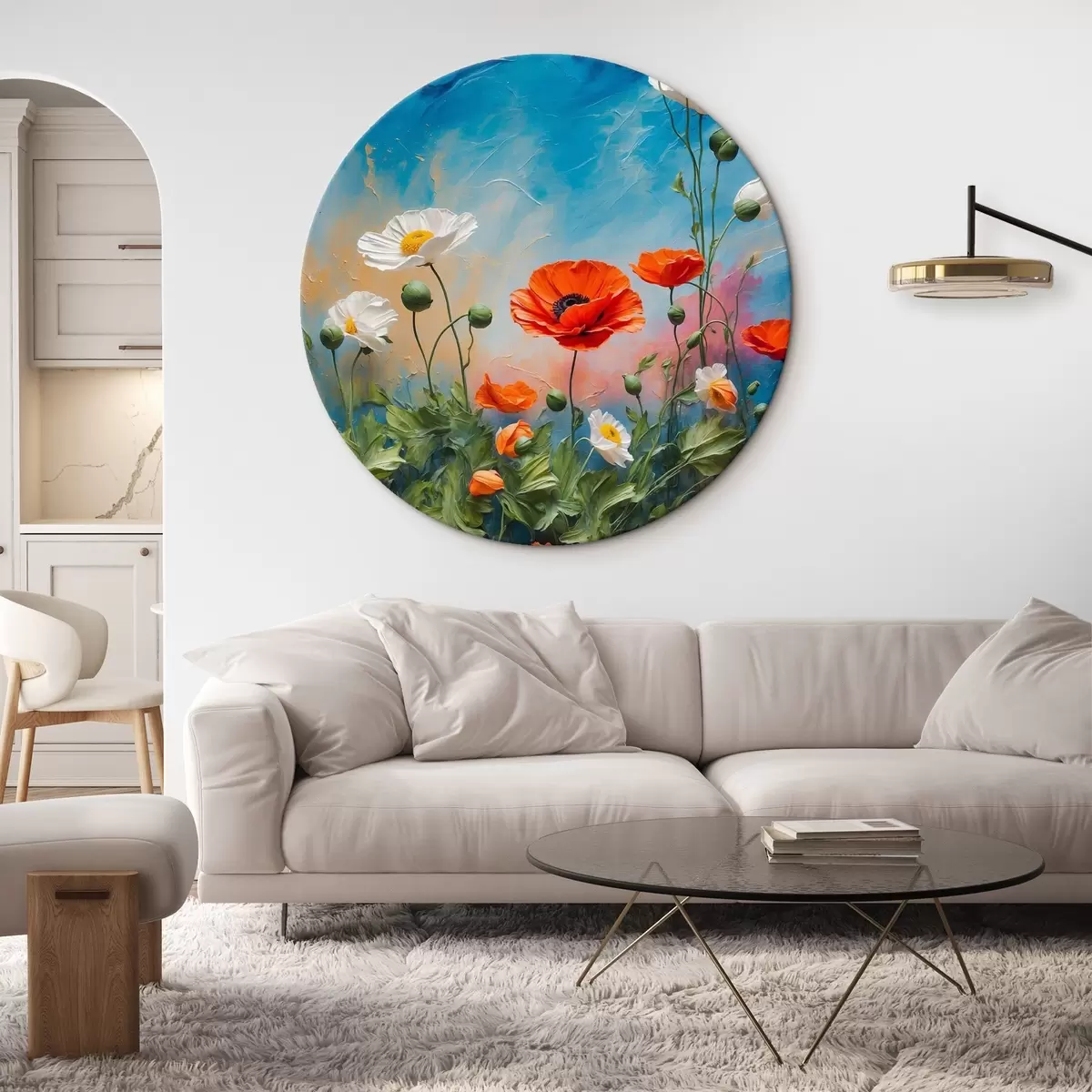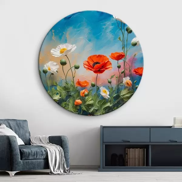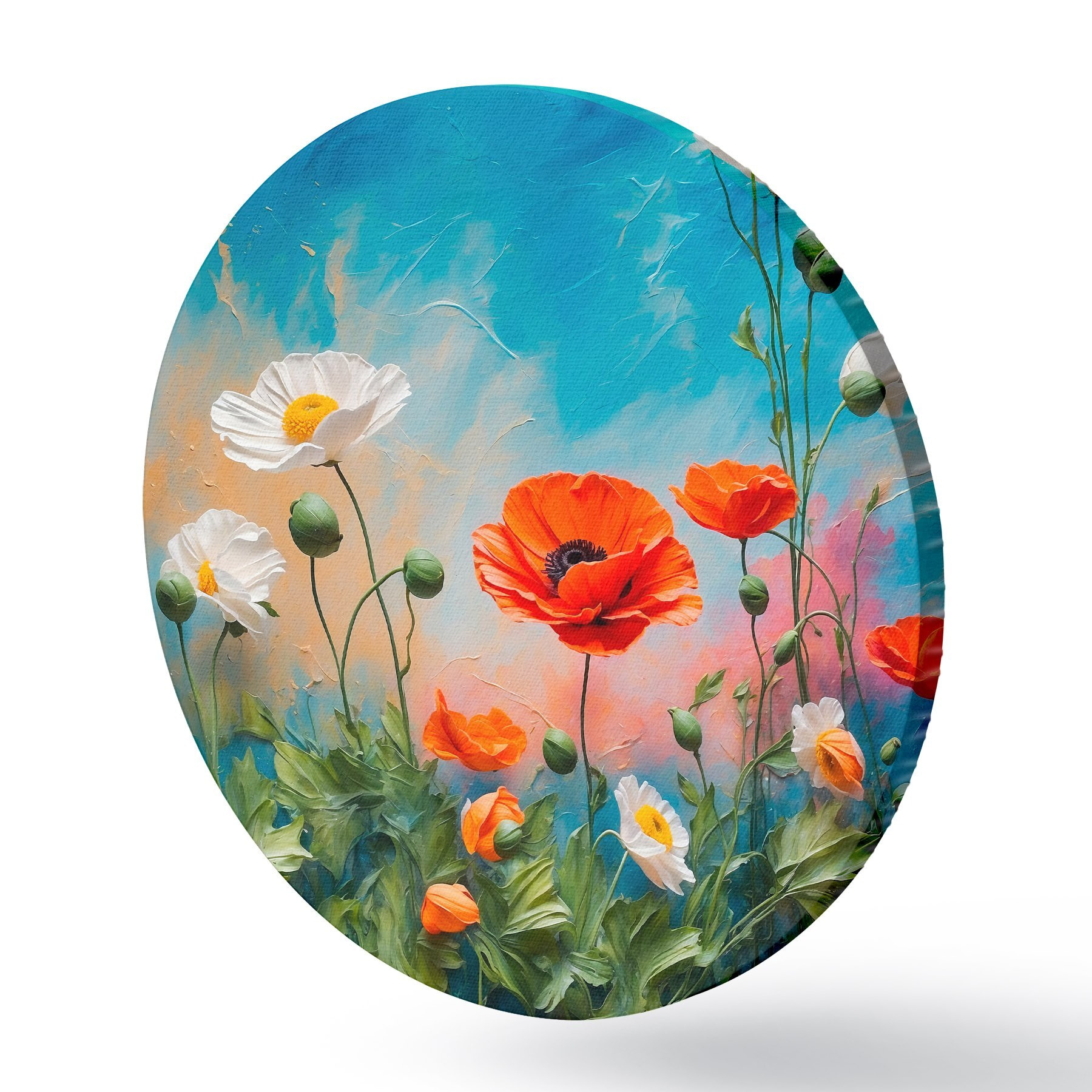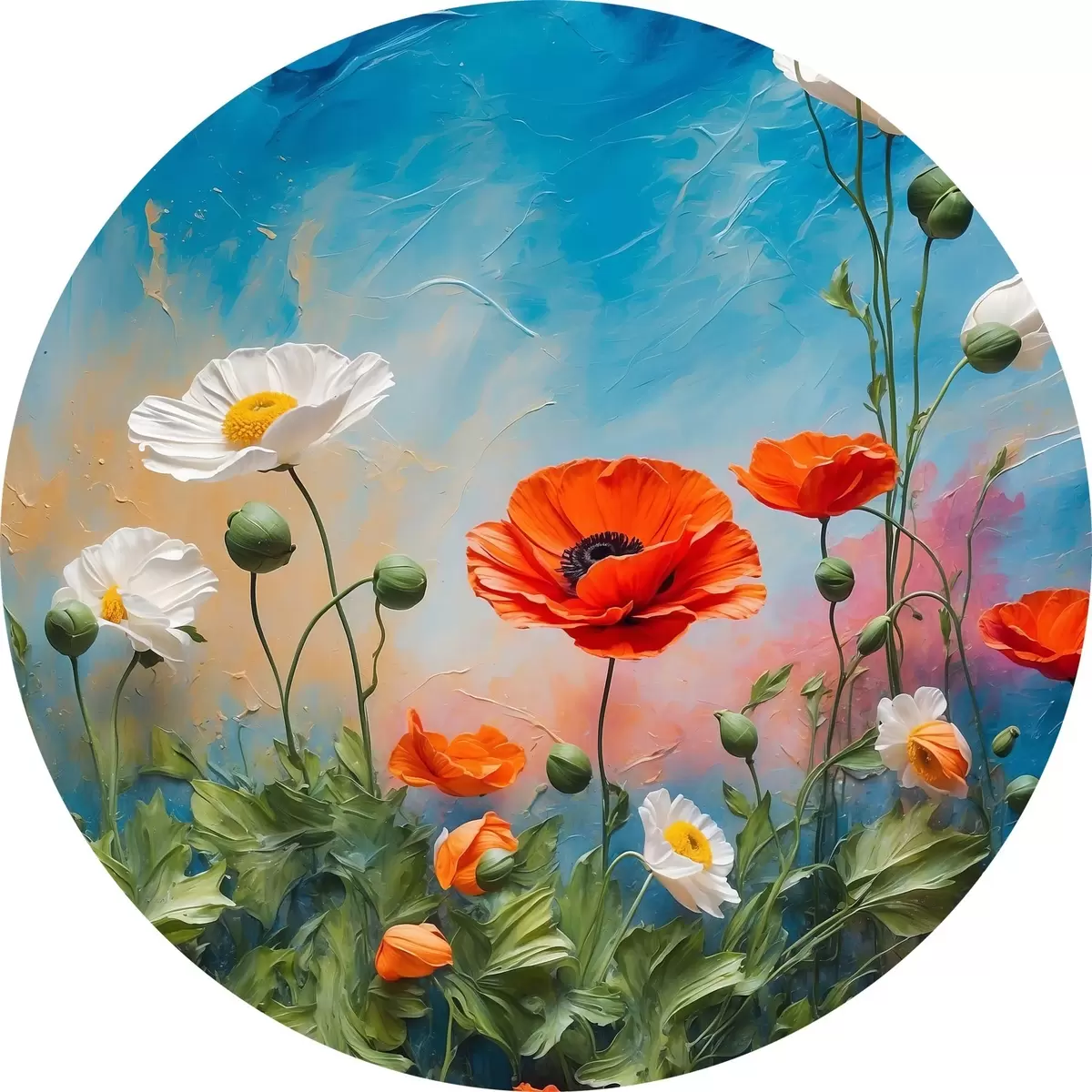 Runde Gemälde Gänseblümchen und Mohnblumen auf blauem Hintergrund r42261