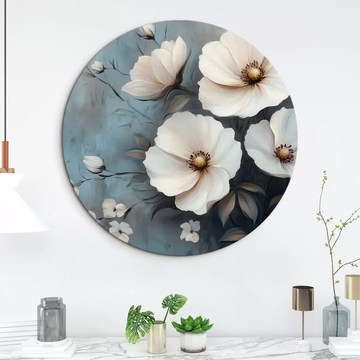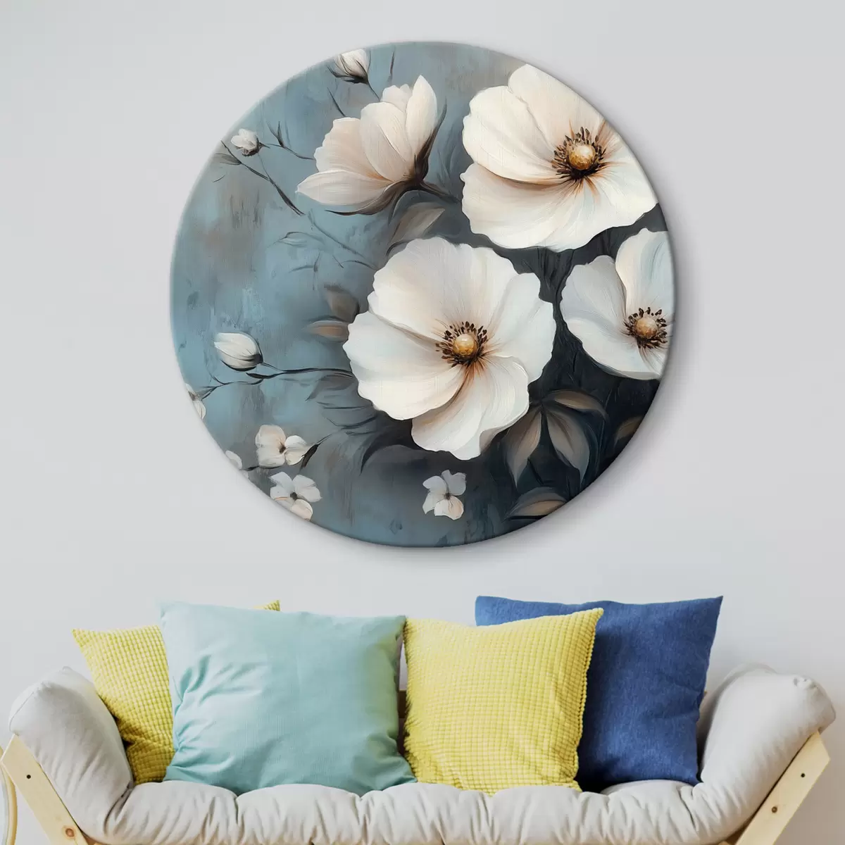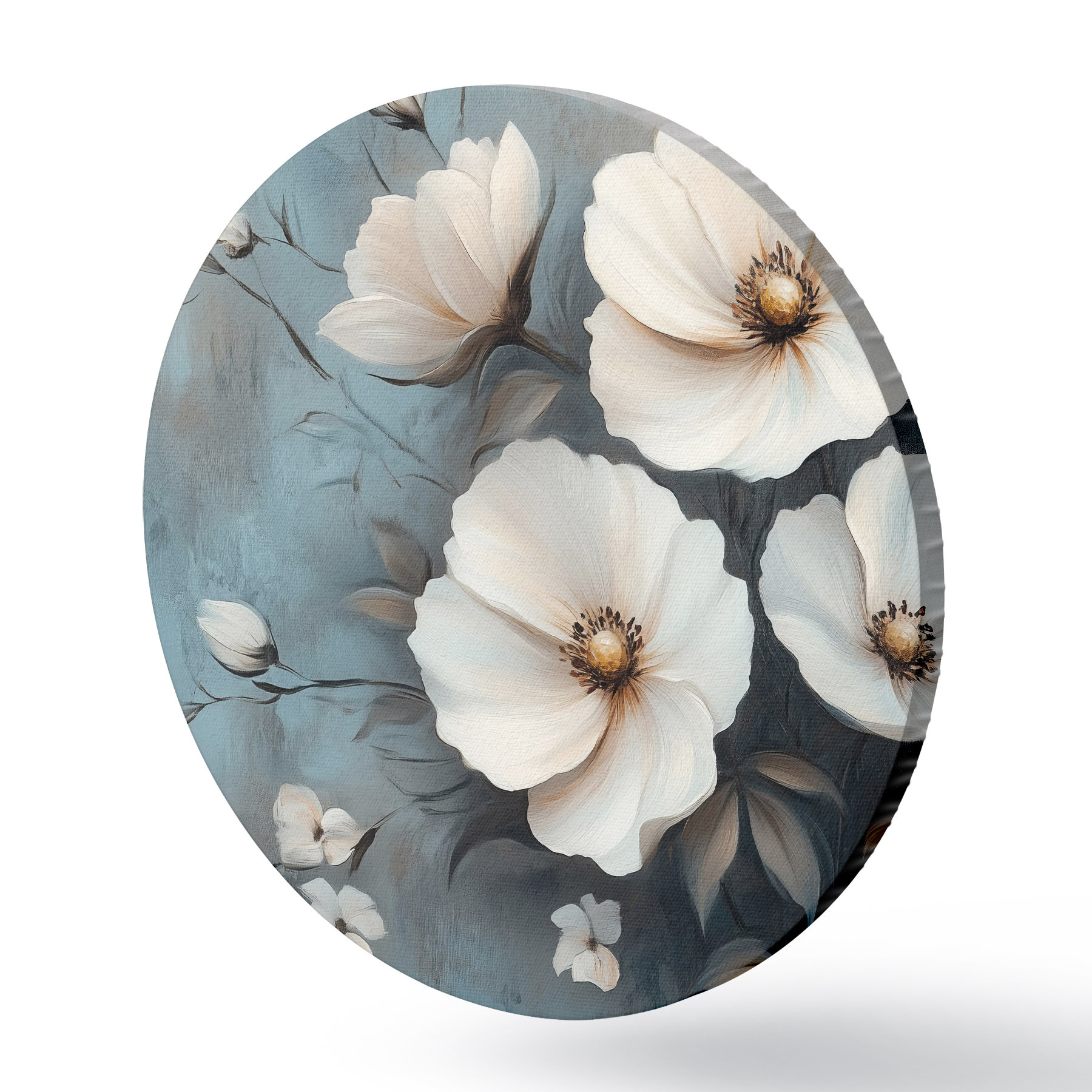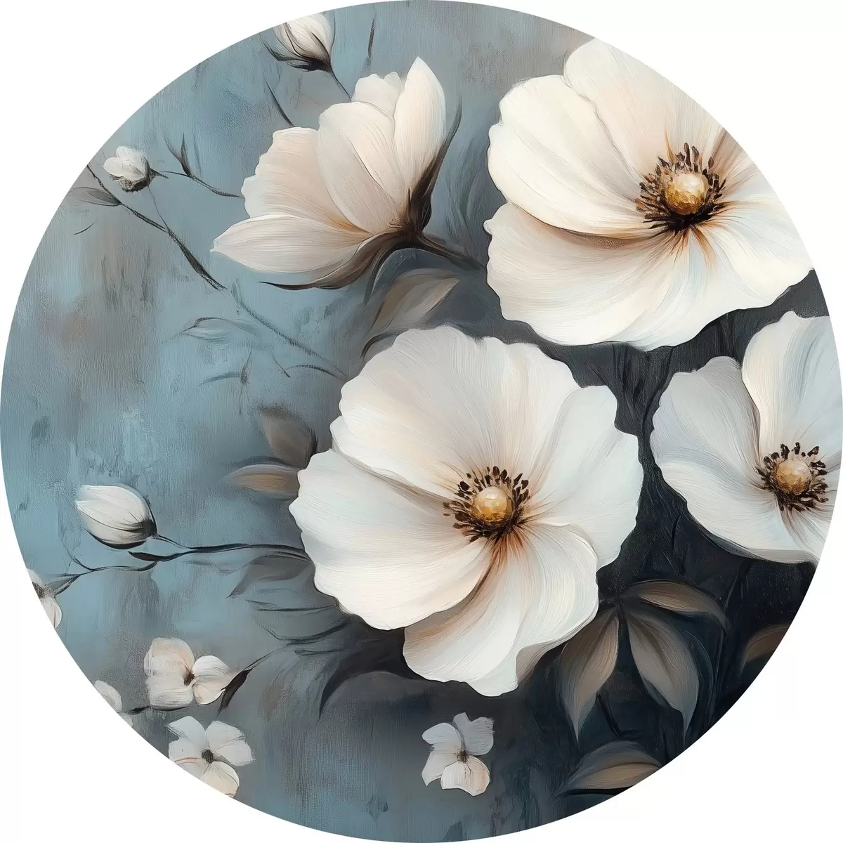 Runde Gemälde Weiße Blumen auf blauem Hintergrund r42319
