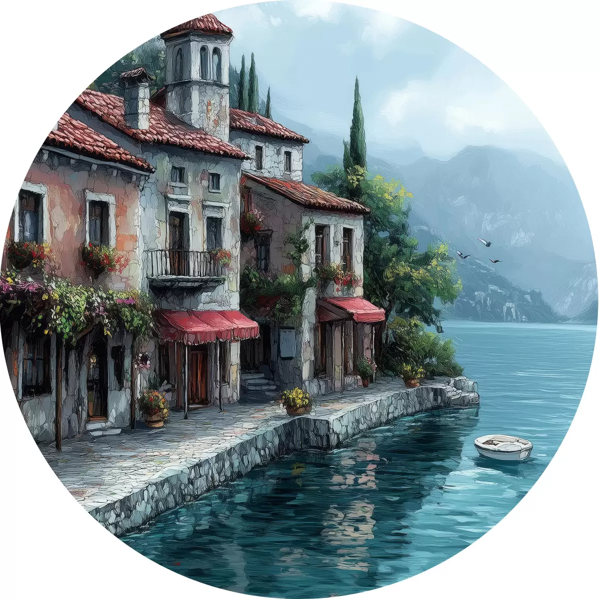 Runde Gemälde Haus oberhalb des Sees in den Bergen r42334