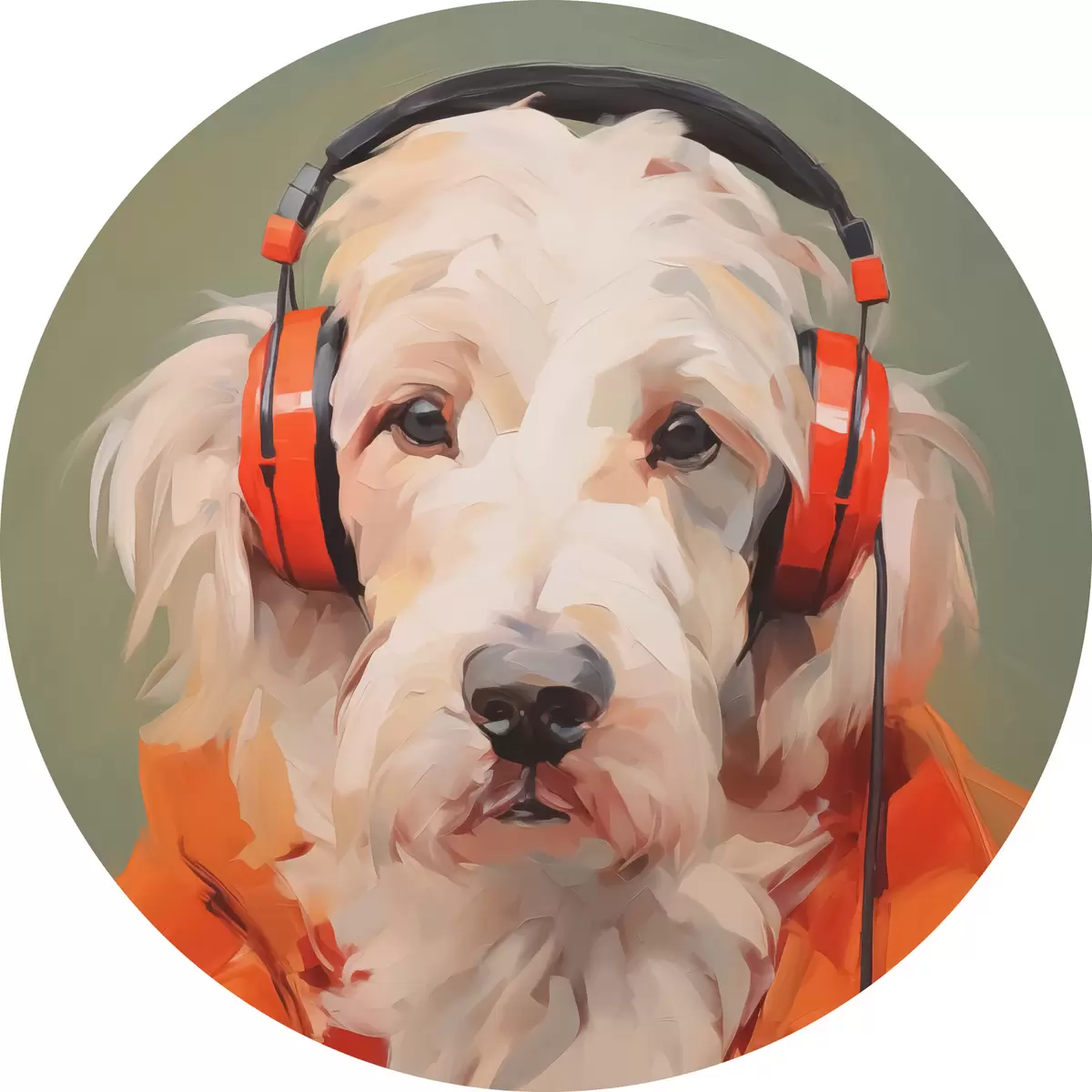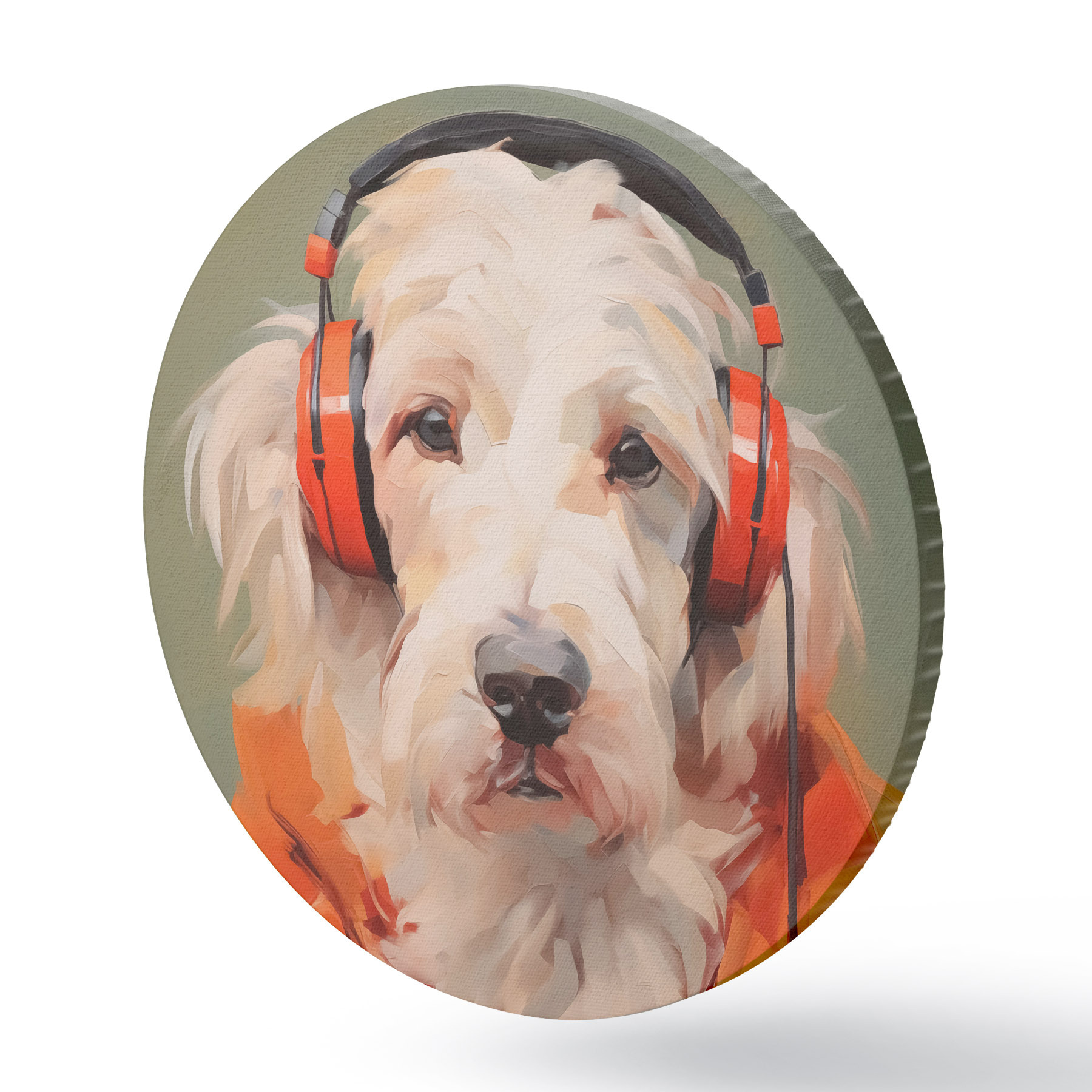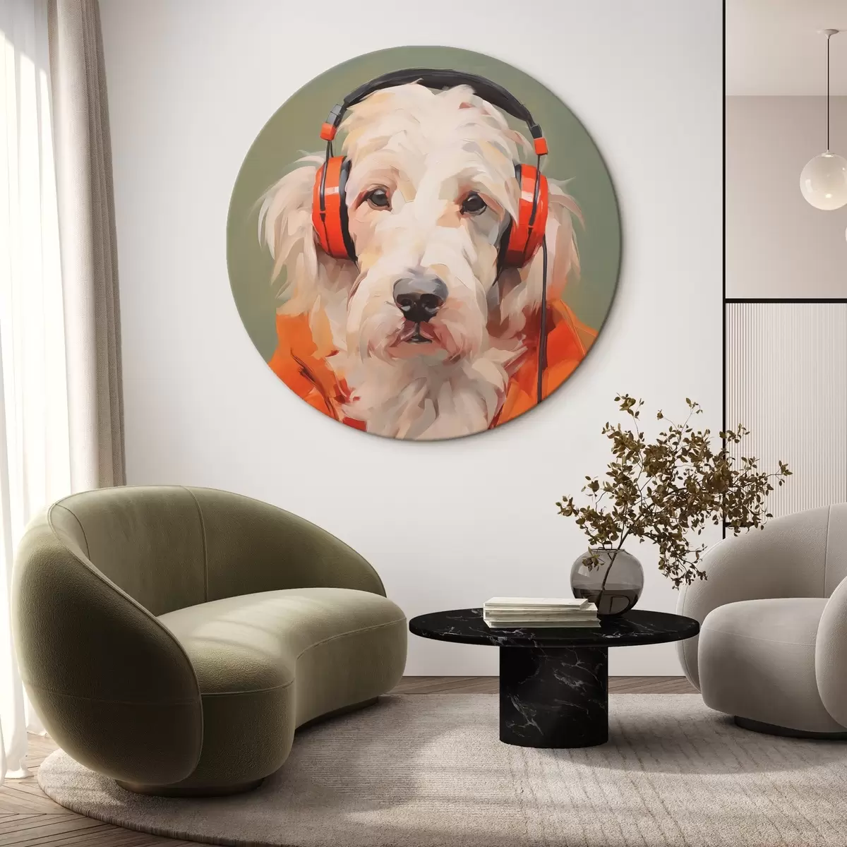 Runde Gemälde Weißer Hund mit orangefarbener Jacke und Kopfhörer Imitation Malerei r42364