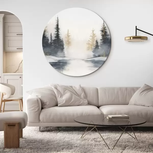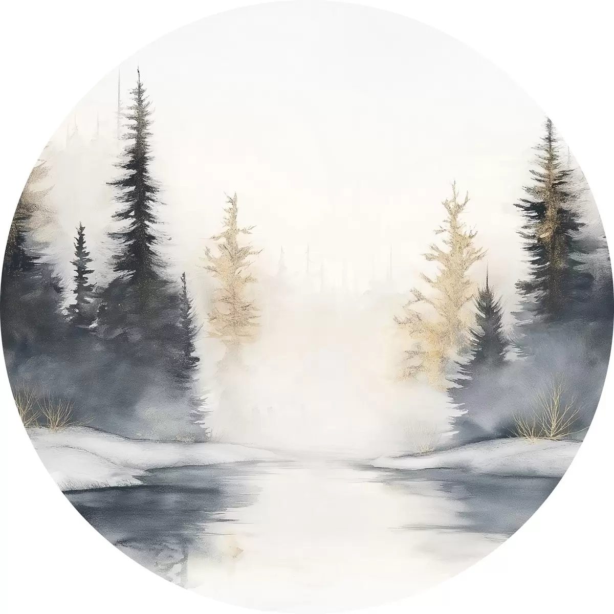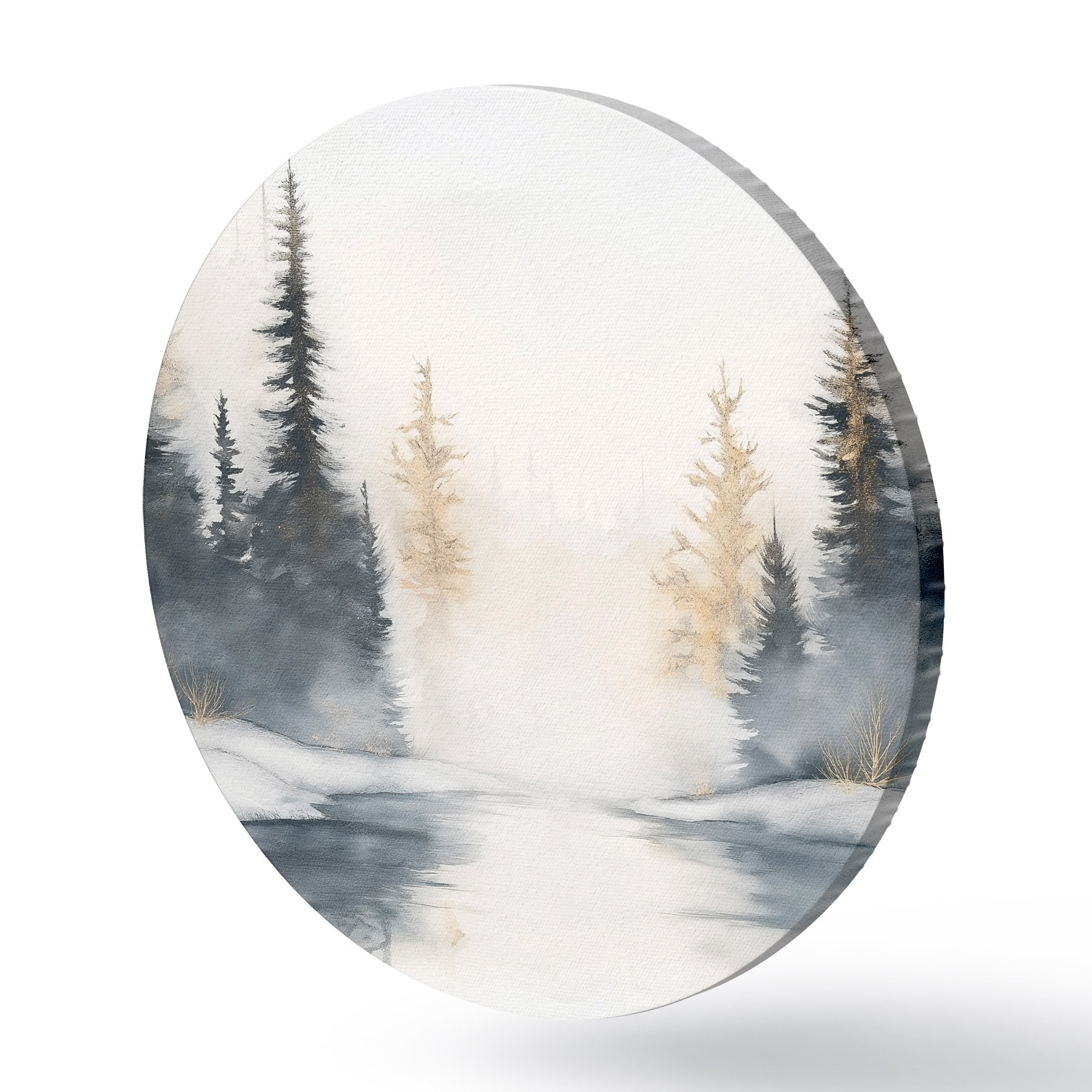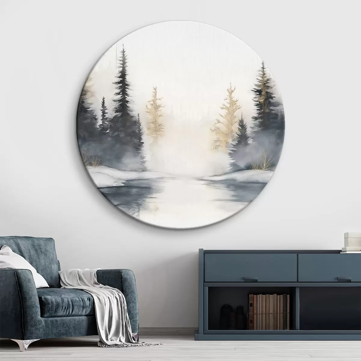 Runde Gemälde Winterlandschaft mit Fluss und Kiefern, Natur, Wald, Nebel r42374