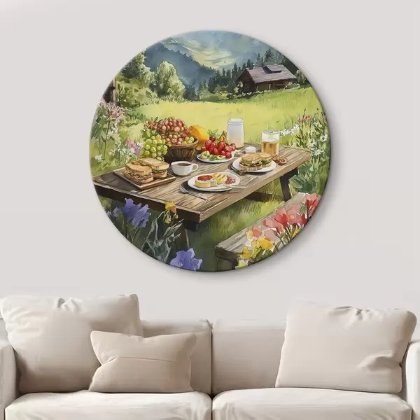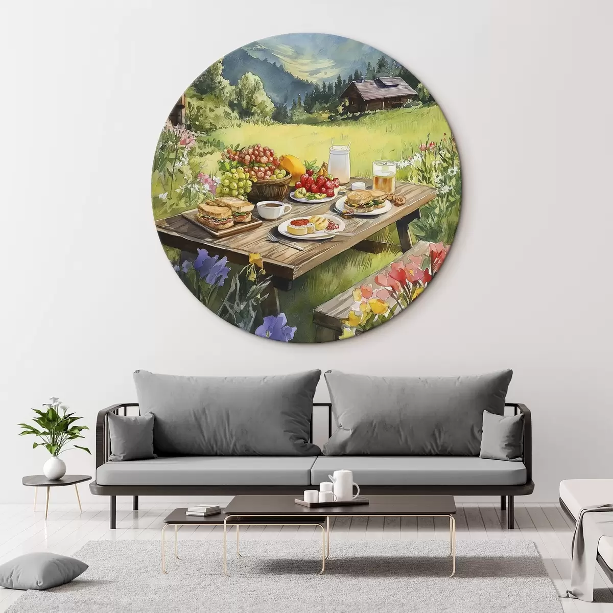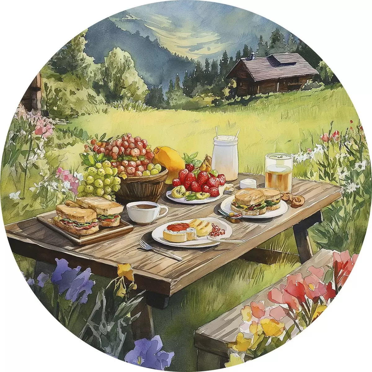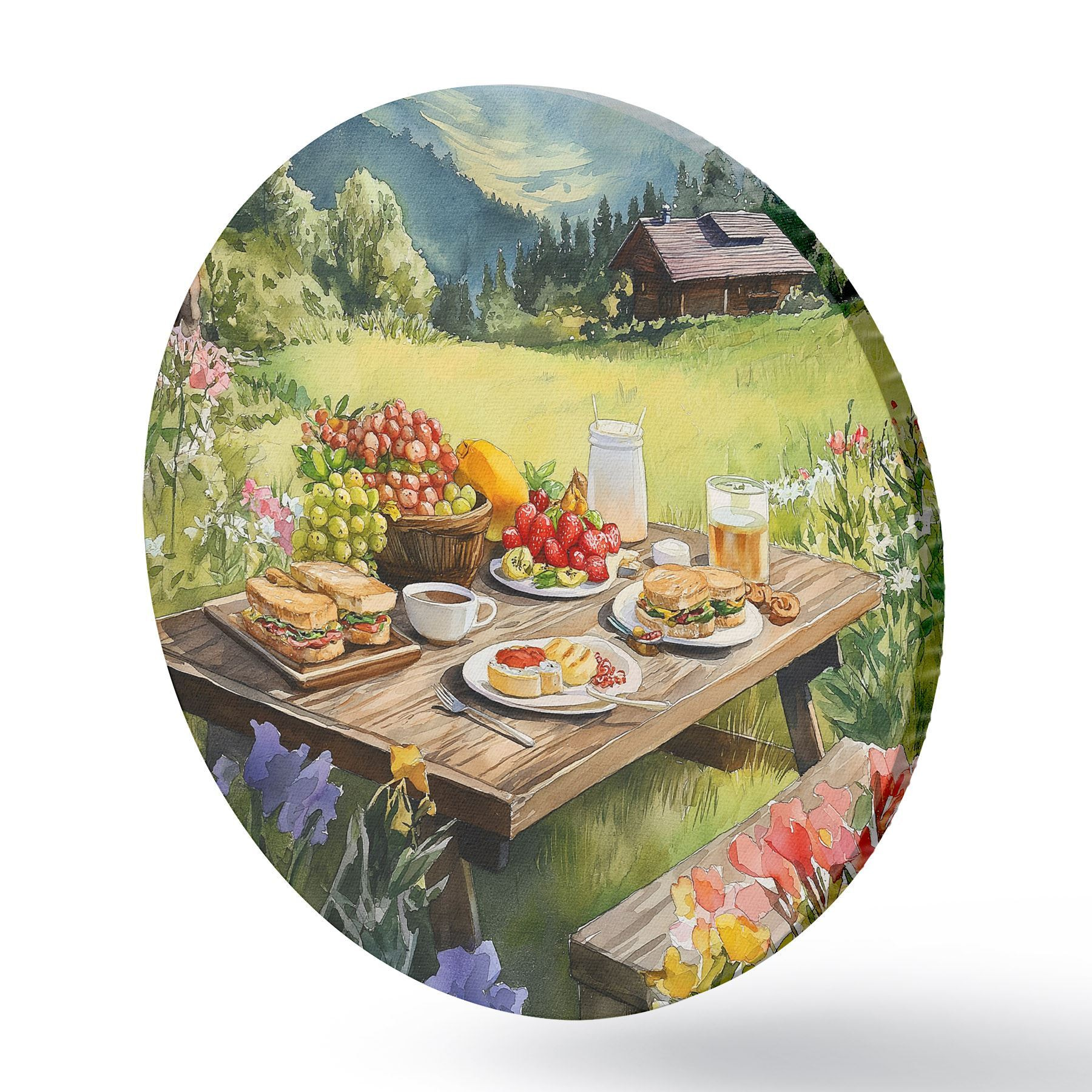 Runde Gemälde Berglandschaften, Sommerwiese, Holzhäuser, Frühstück r42425