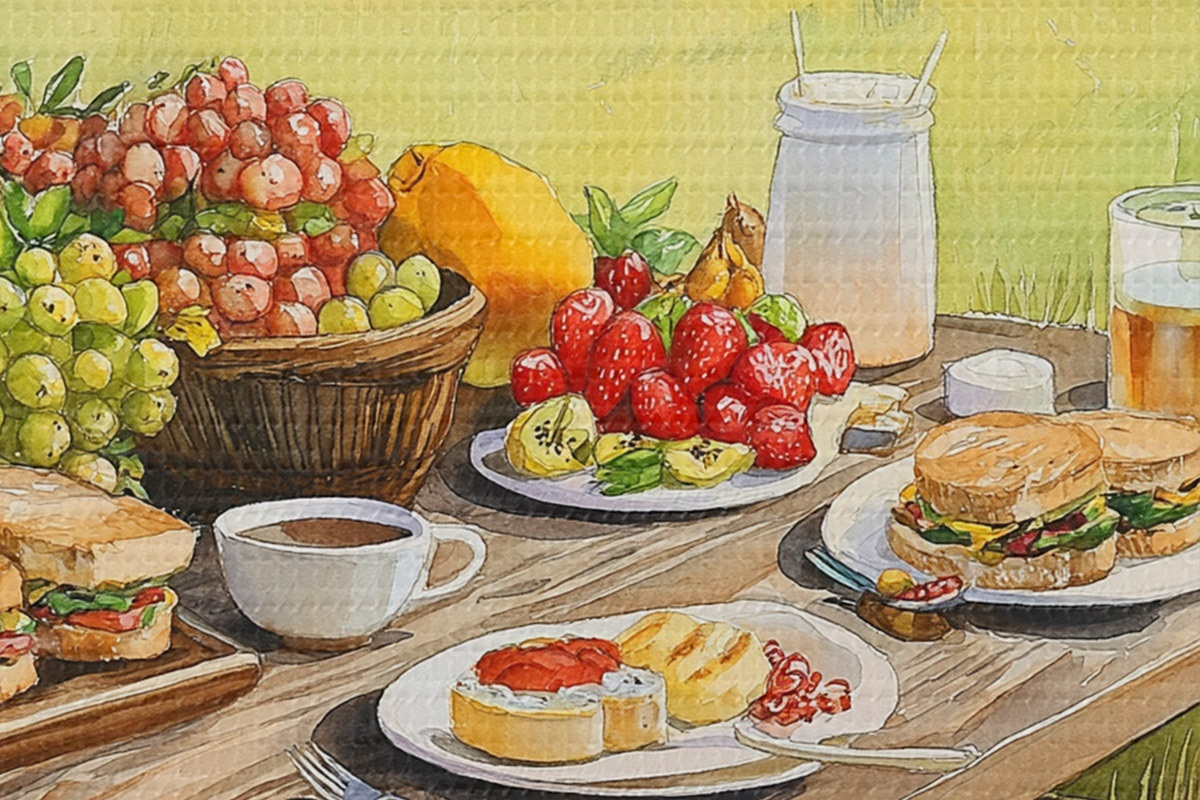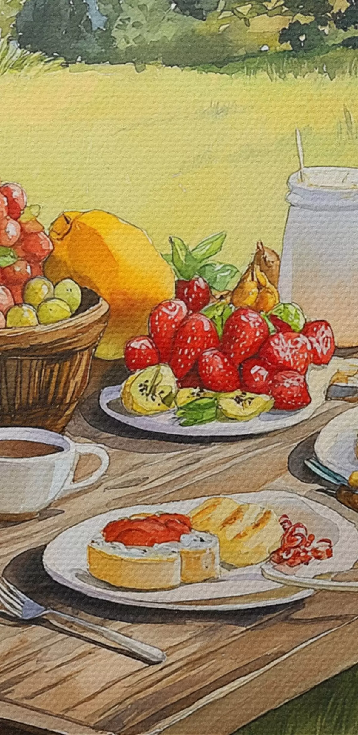 Bild Berglandschaften, Sommerwiese, Holzhäuser, Frühstück Nr r42425