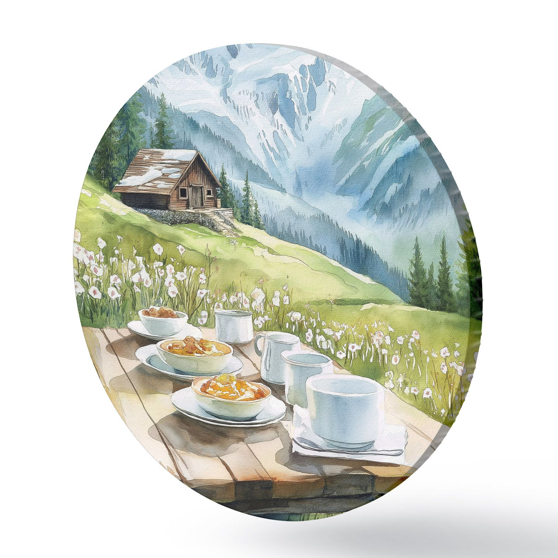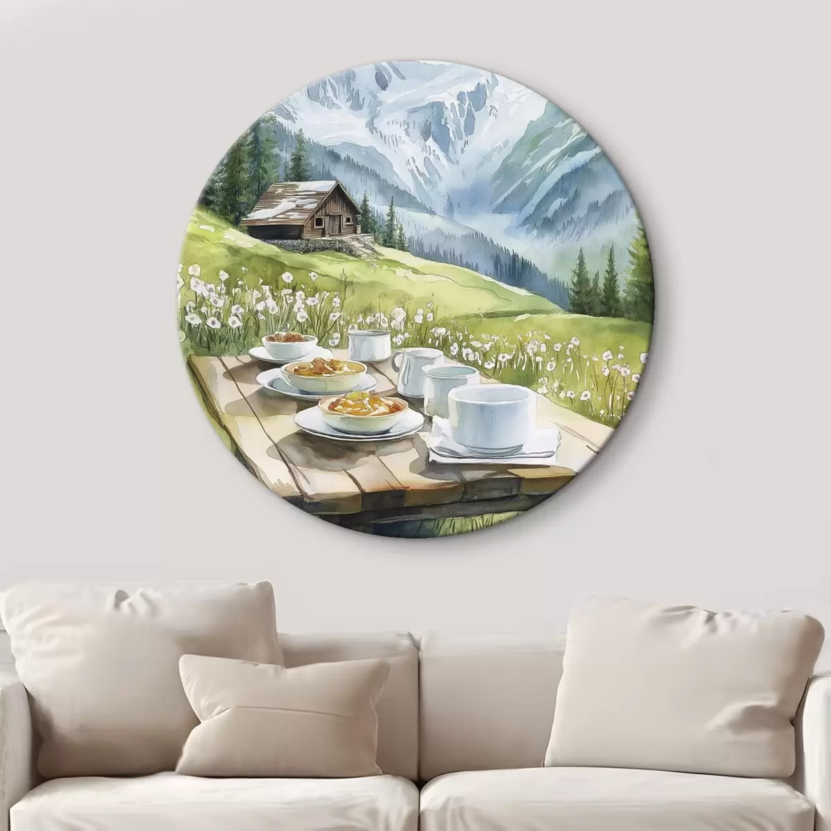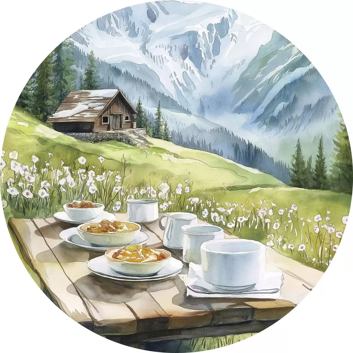 Runde Gemälde Frühstück in den Alpen, Berge, Wald, Natur, Sommer, Aquarellstil r42426
