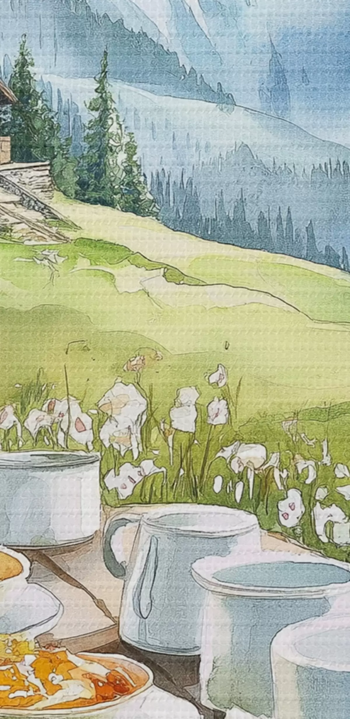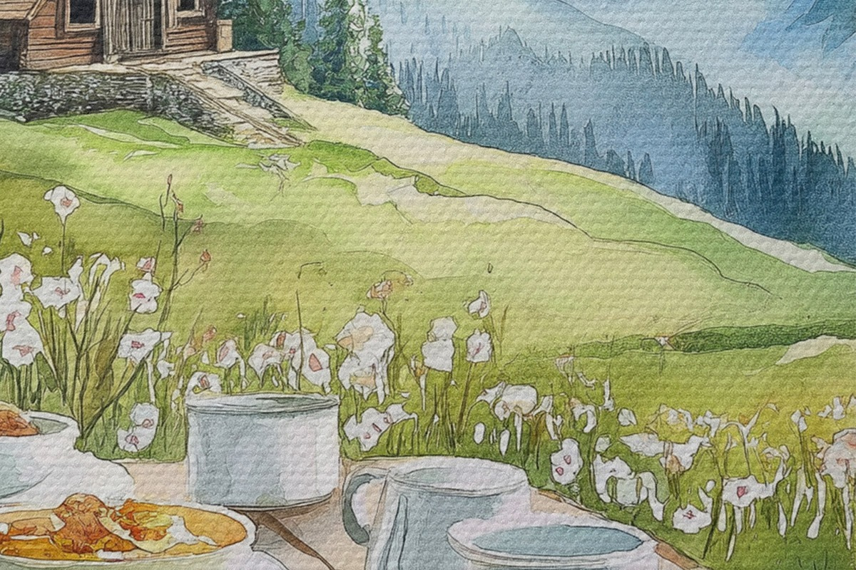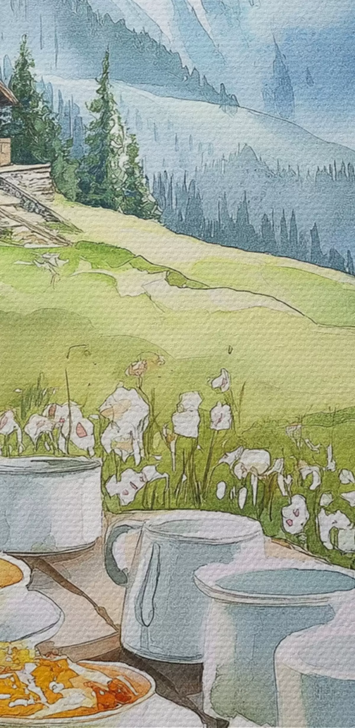 Bild Frühstück in den Alpen, Berge, Wald, Natur, Sommer, Aquarellstil Nr r42426