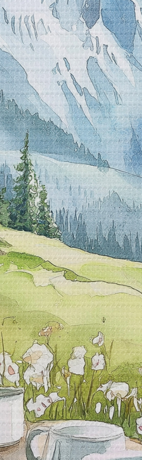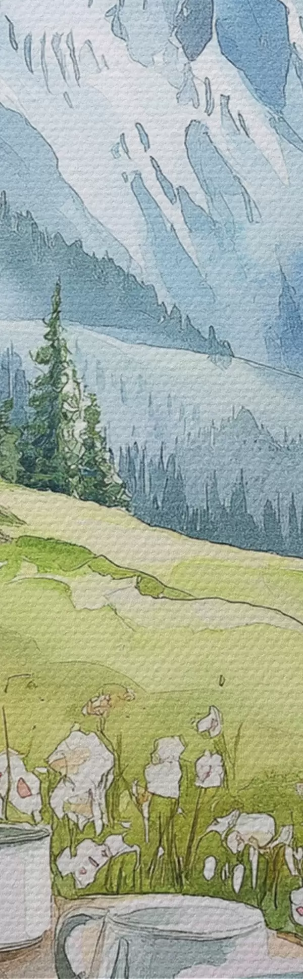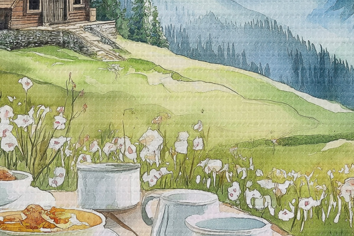 Bild Frühstück in den Alpen, Berge, Wald, Natur, Sommer, Aquarellstil Nr r42426