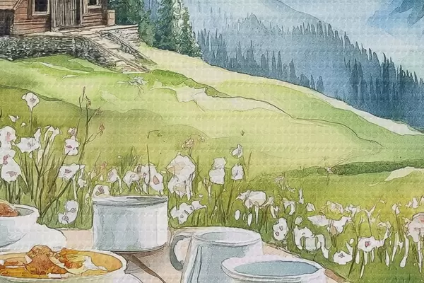 Bild Frühstück in den Alpen, Berge, Wald, Natur, Sommer, Aquarellstil Nr r42426