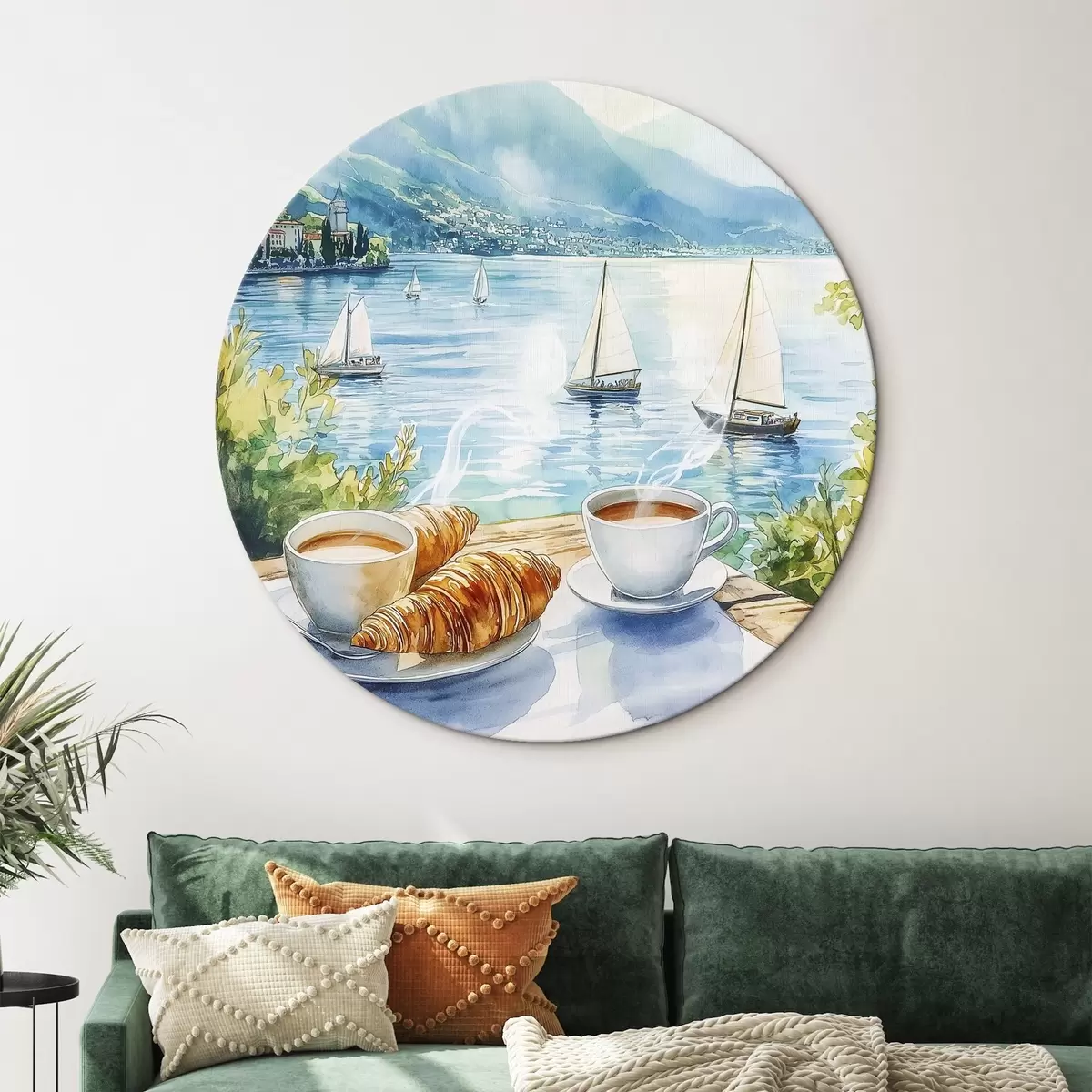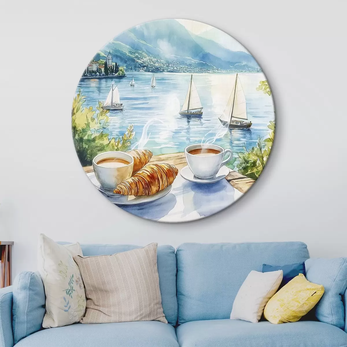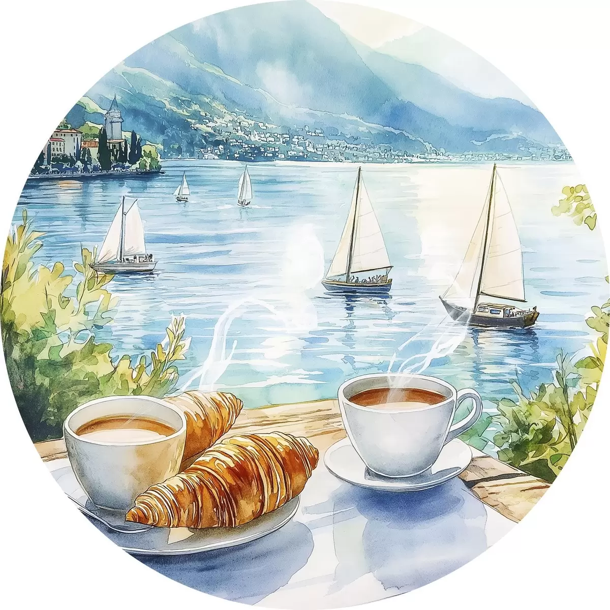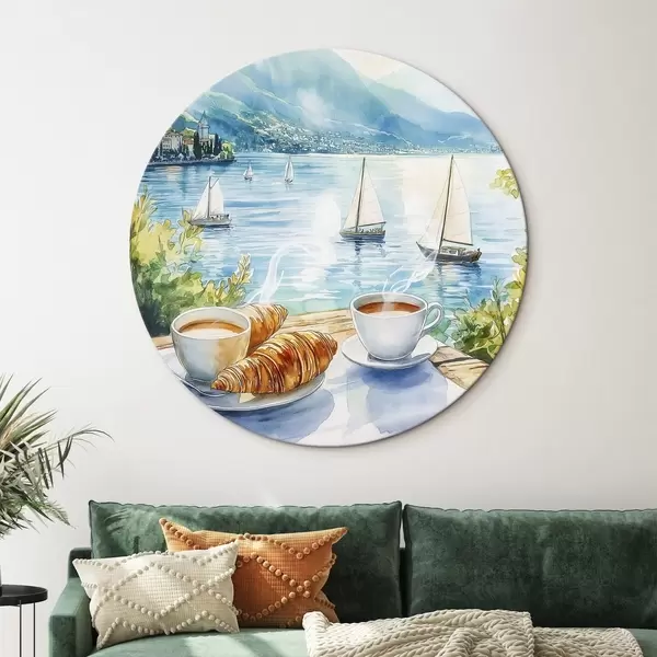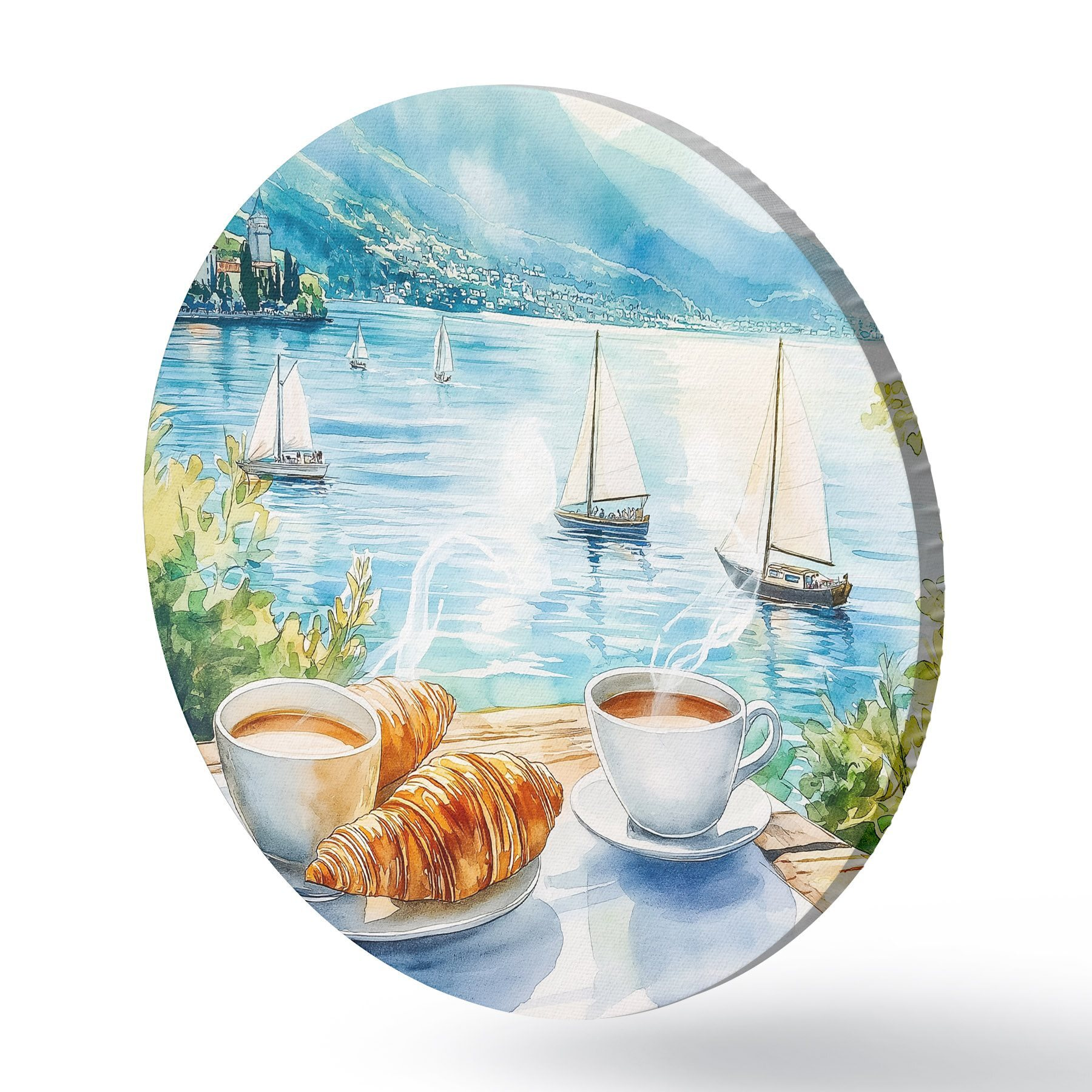 Runde Gemälde Sommer See mit Segelbooten, Tassen Kaffee, Croissants, Aquarell-Stil r42441