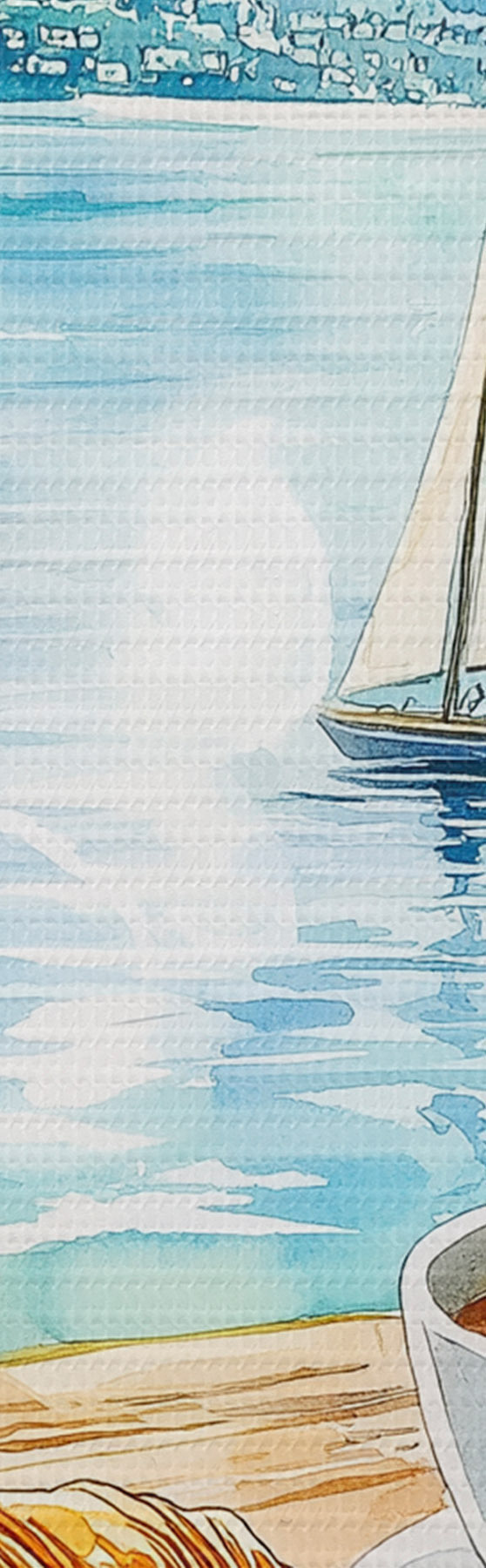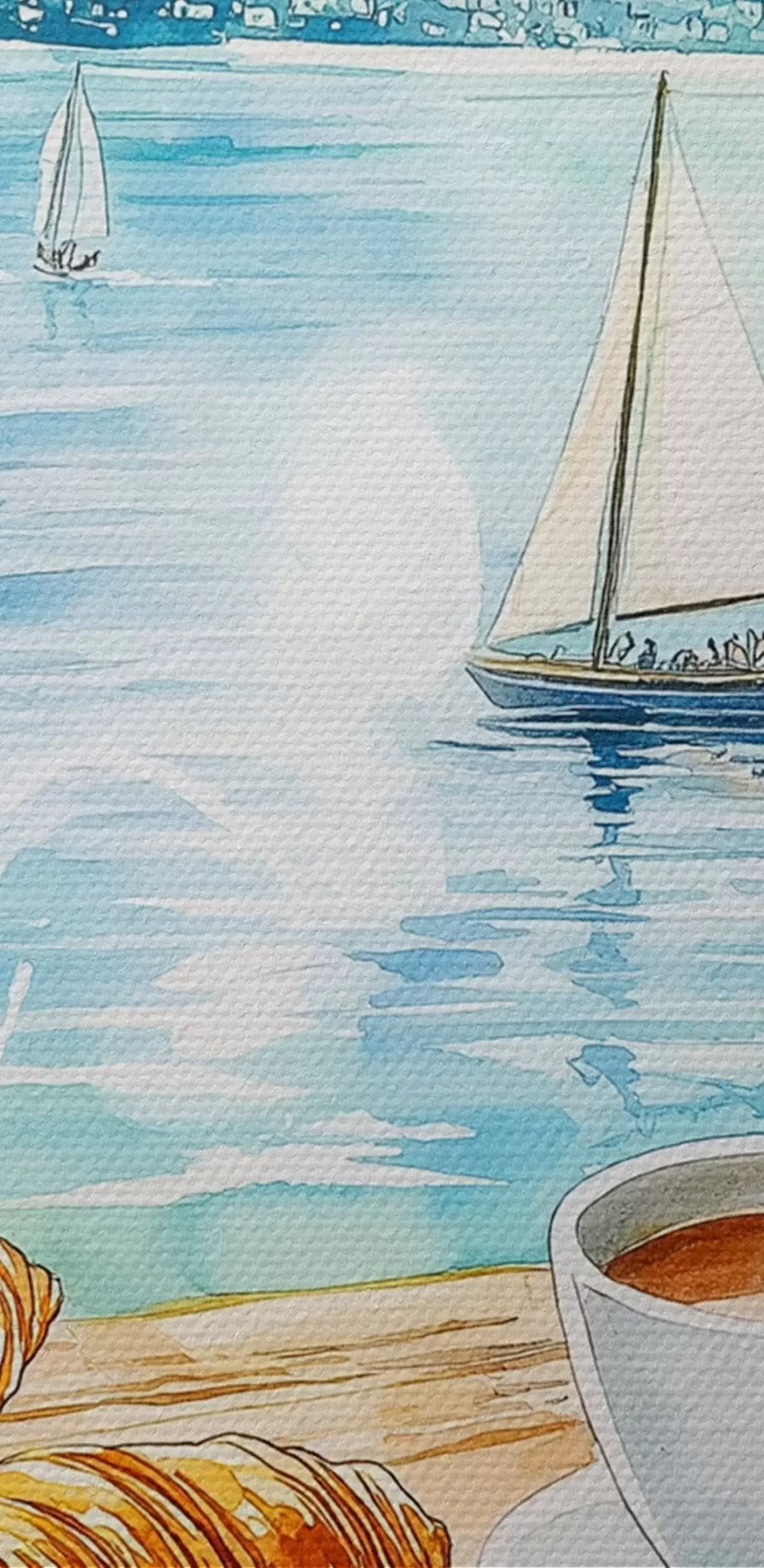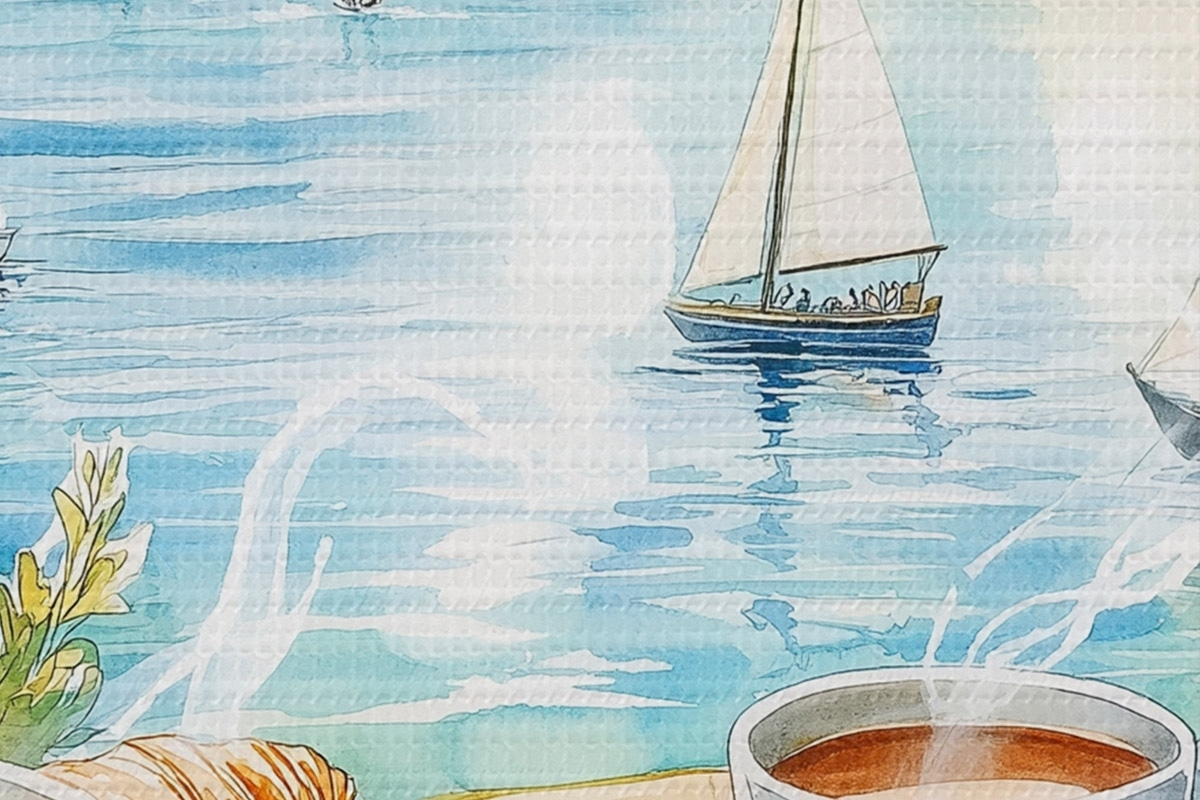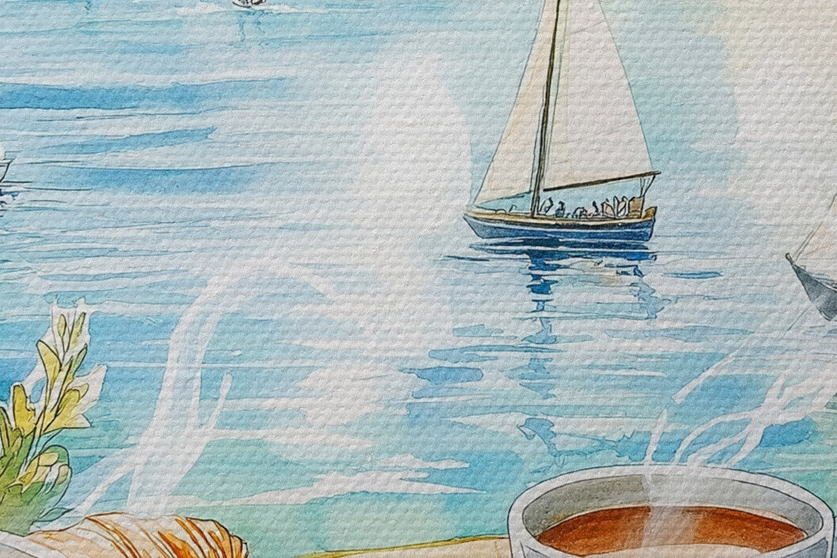 Bild Sommer See mit Segelbooten, Tassen Kaffee, Croissants, Aquarell-Stil Nr r42441