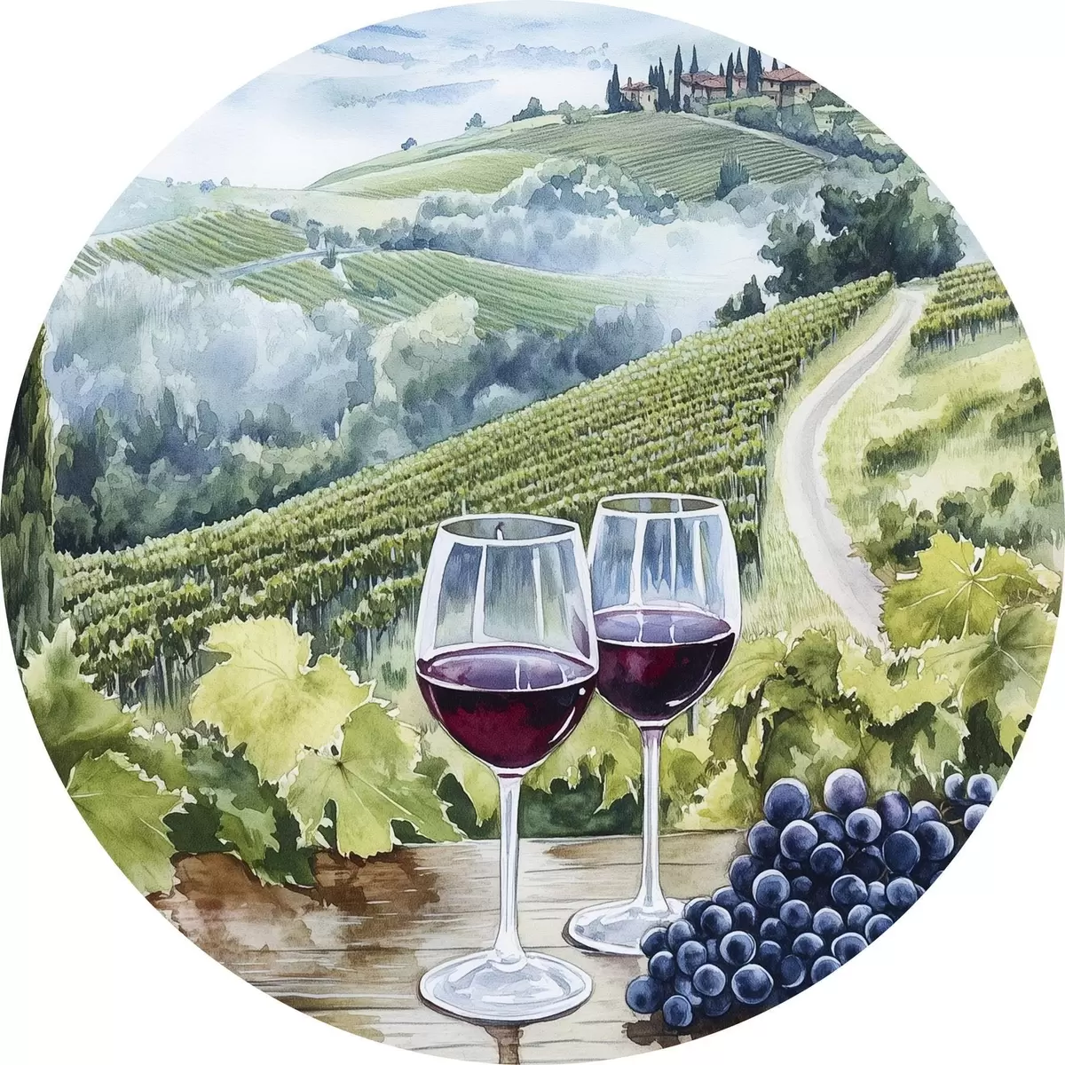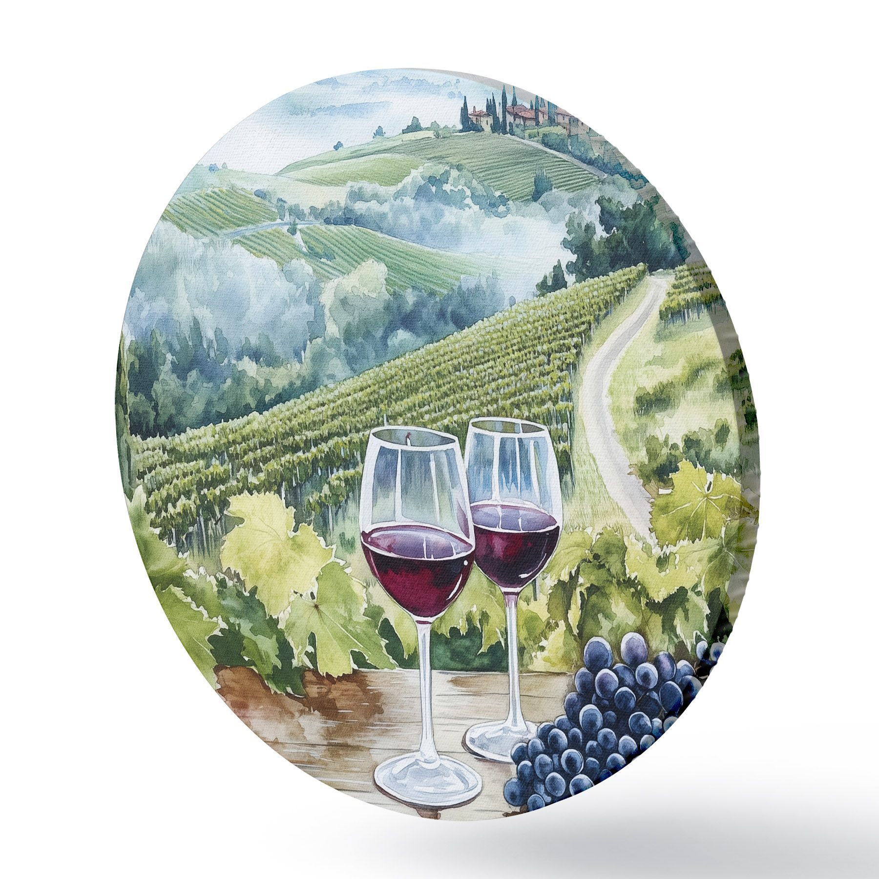 Runde Gemälde Landschaft der Toskana, Weinberge, Weingläser, Aquarellstil r42445