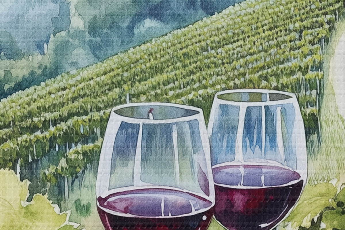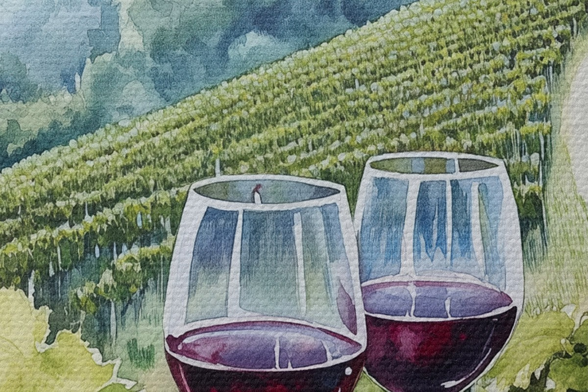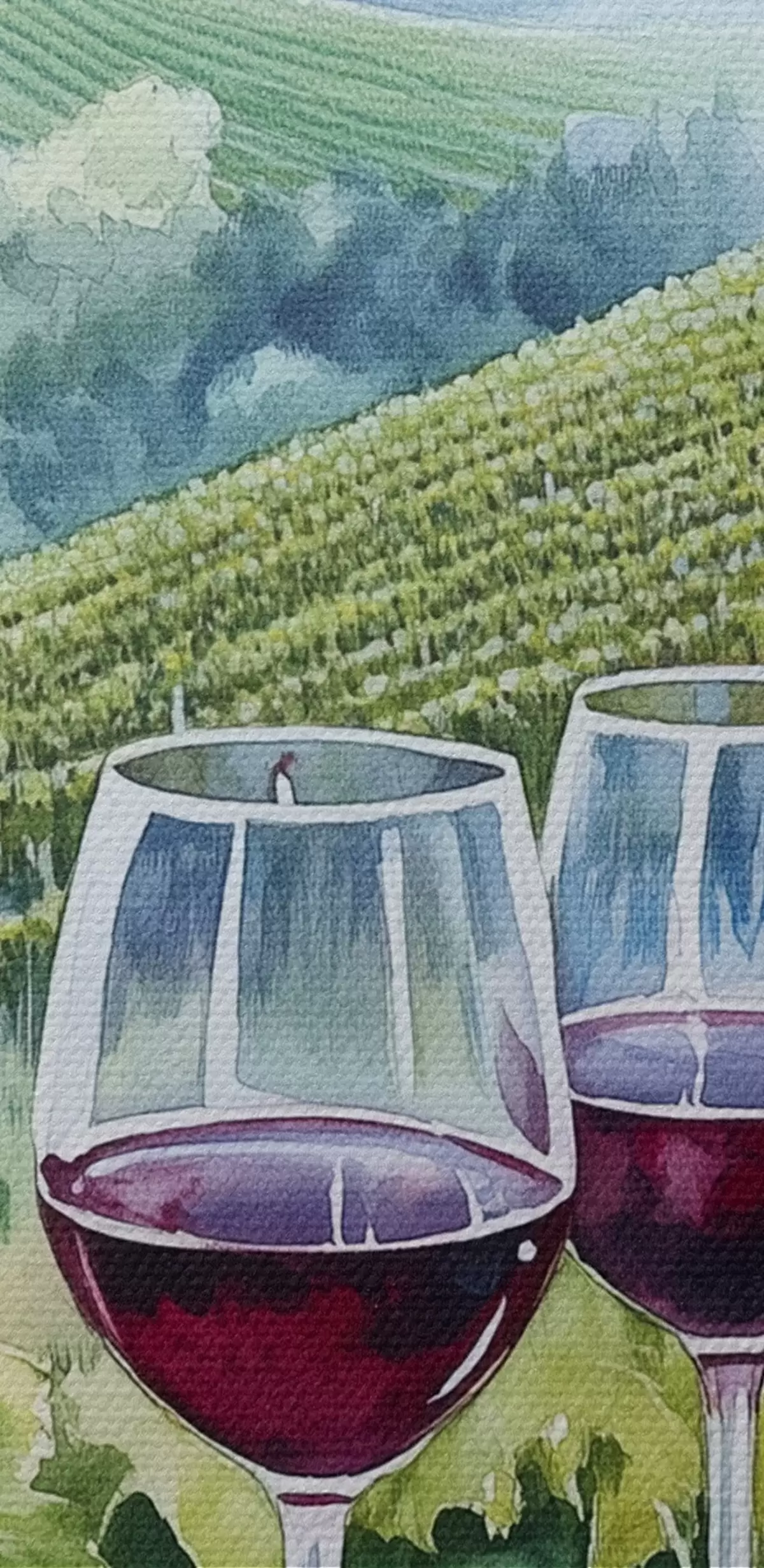 Bild Landschaft der Toskana, Weinberge, Weingläser, Aquarellstil Nr r42445