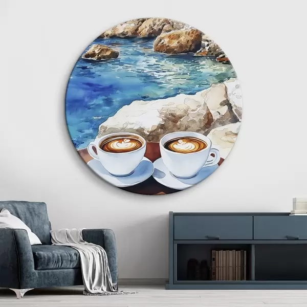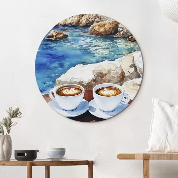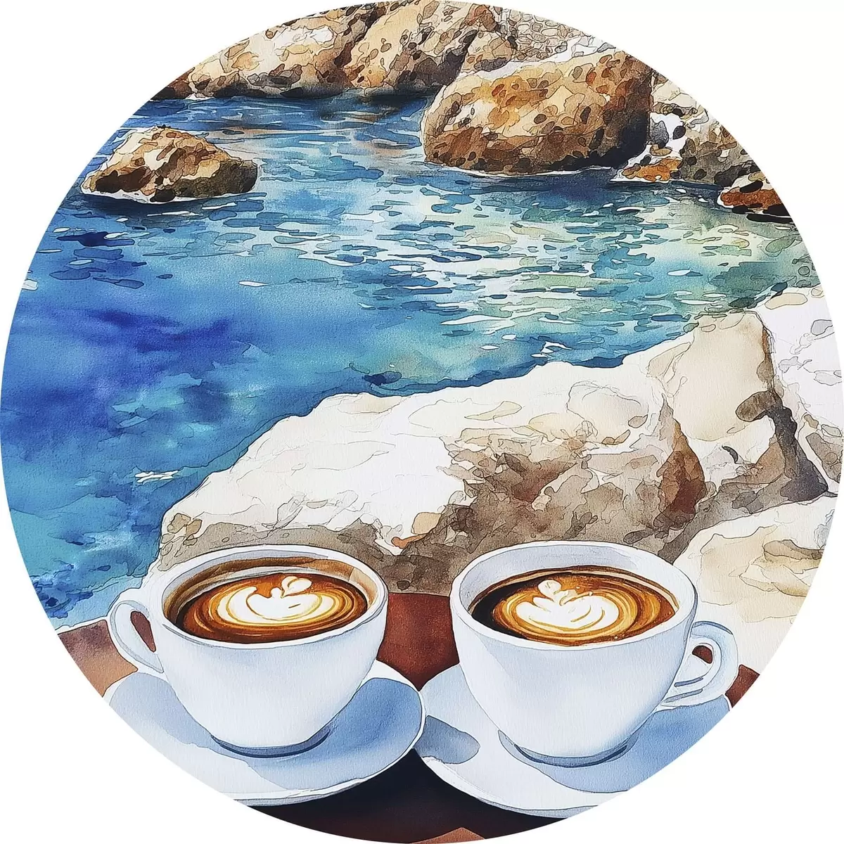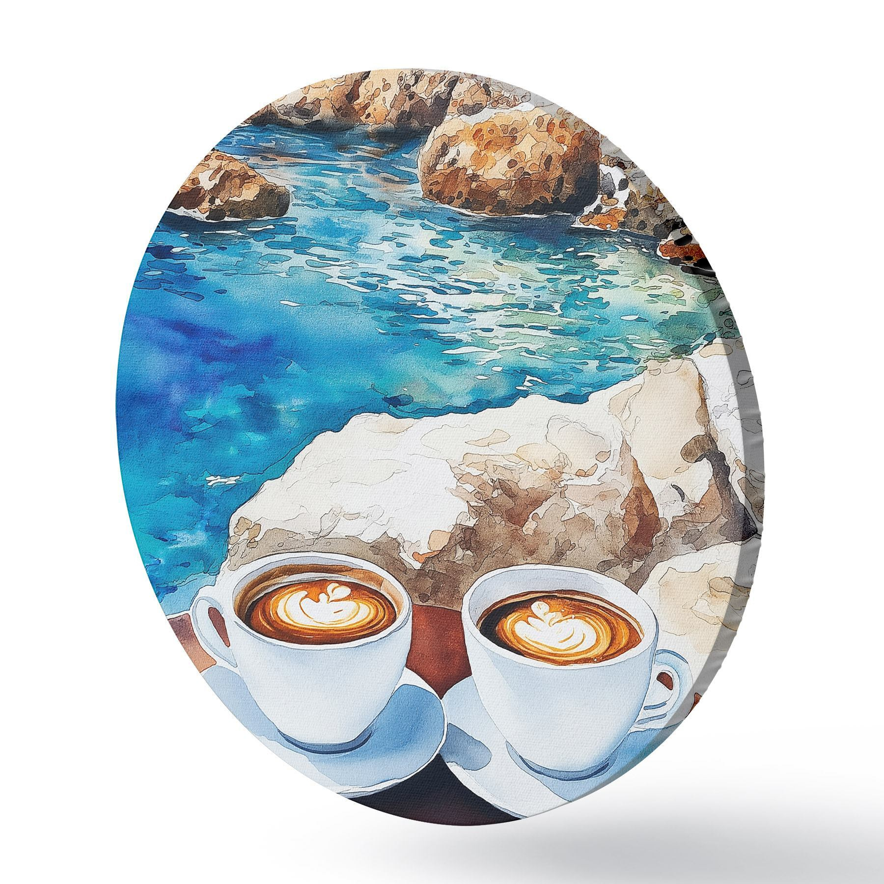 Runde Gemälde Aquarell Seeseite mit Tassen Kaffee, Sommer r42449