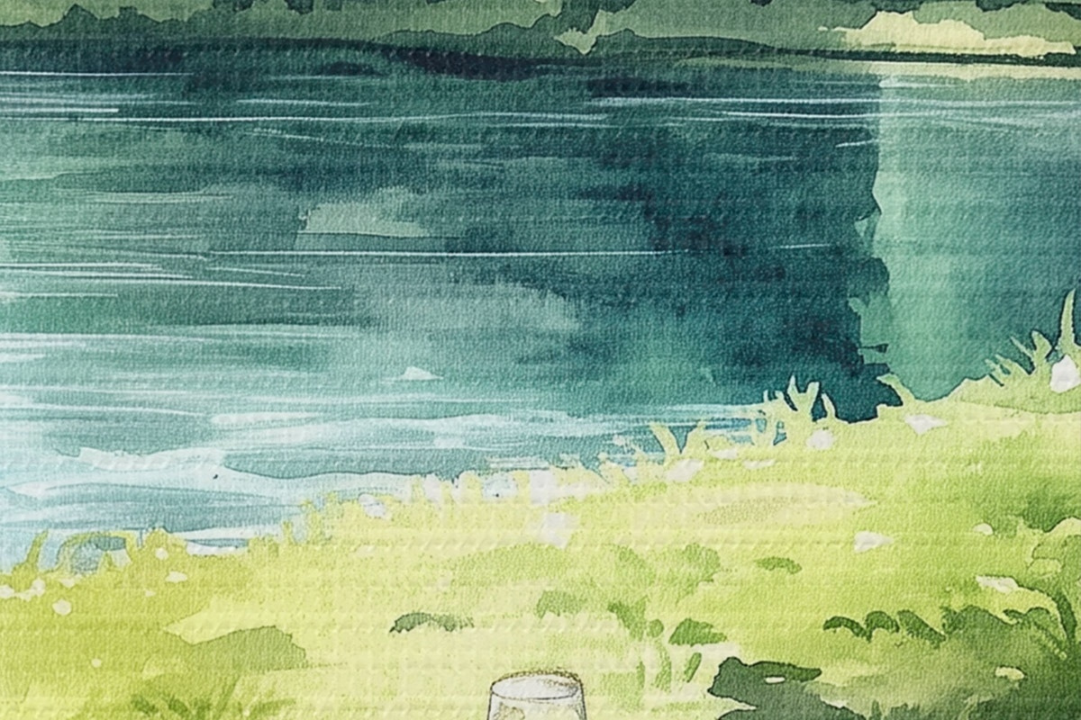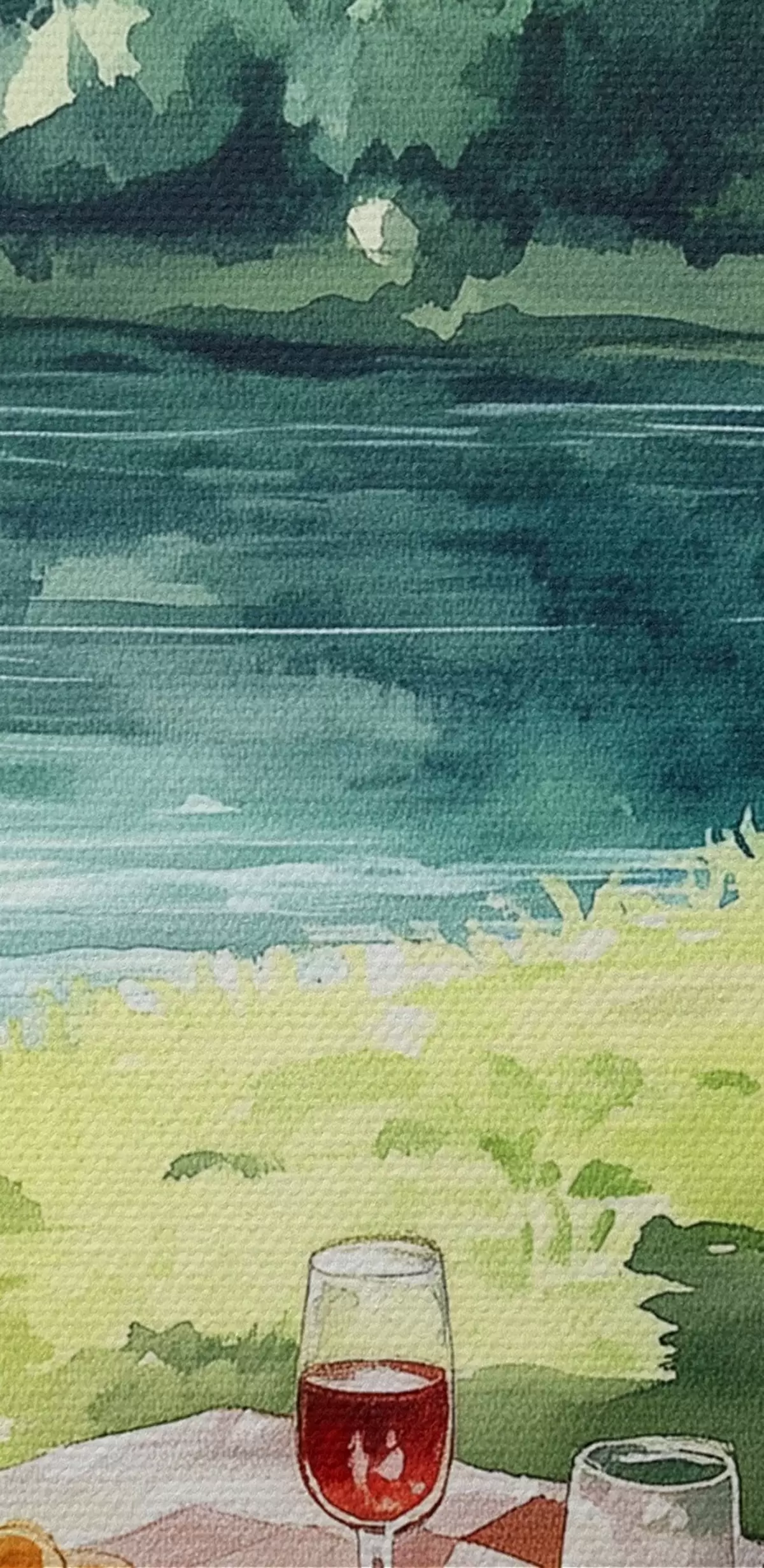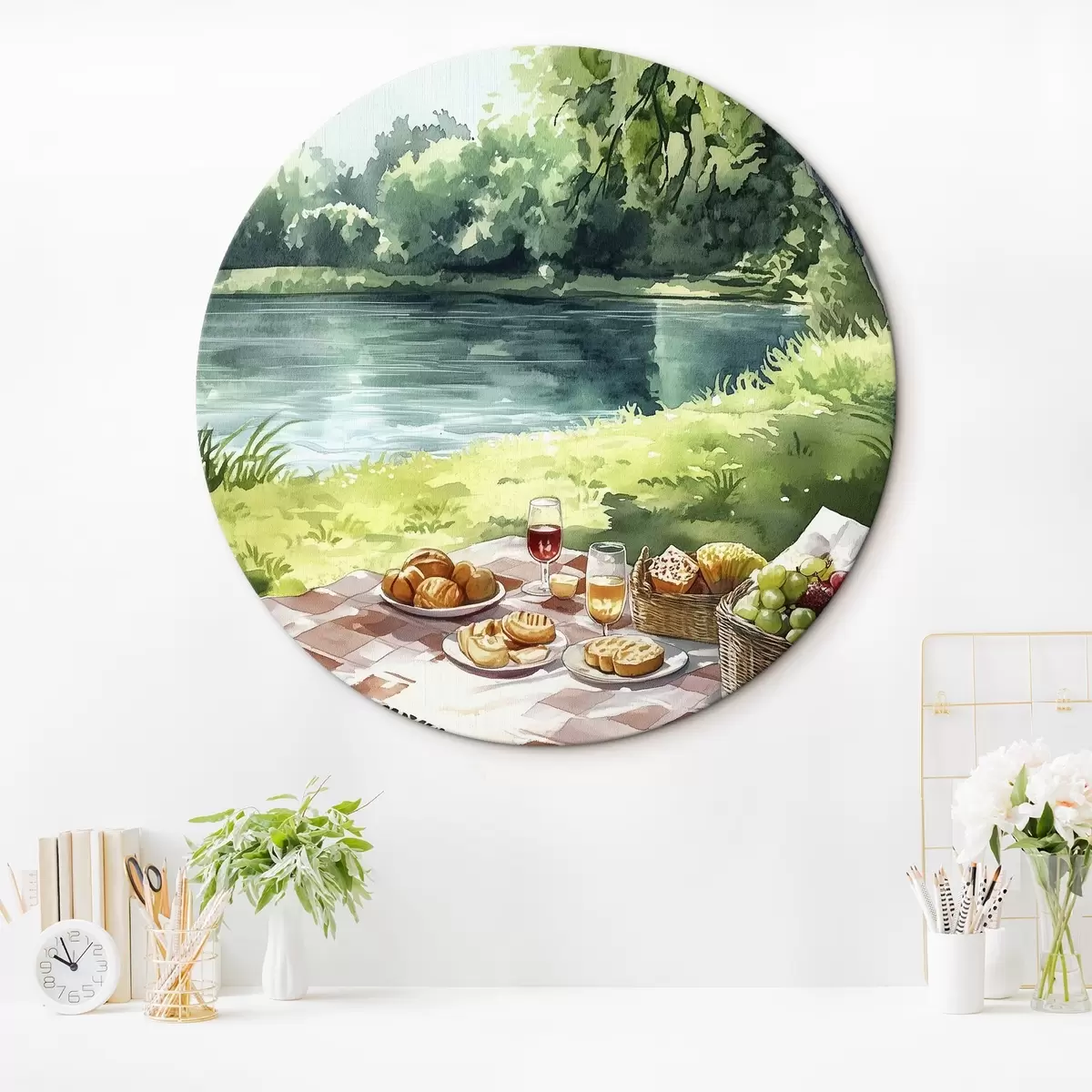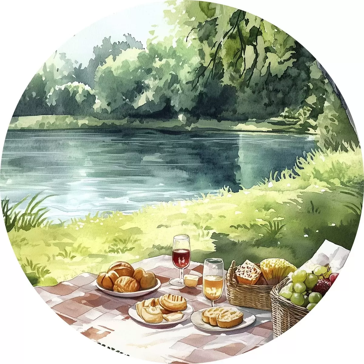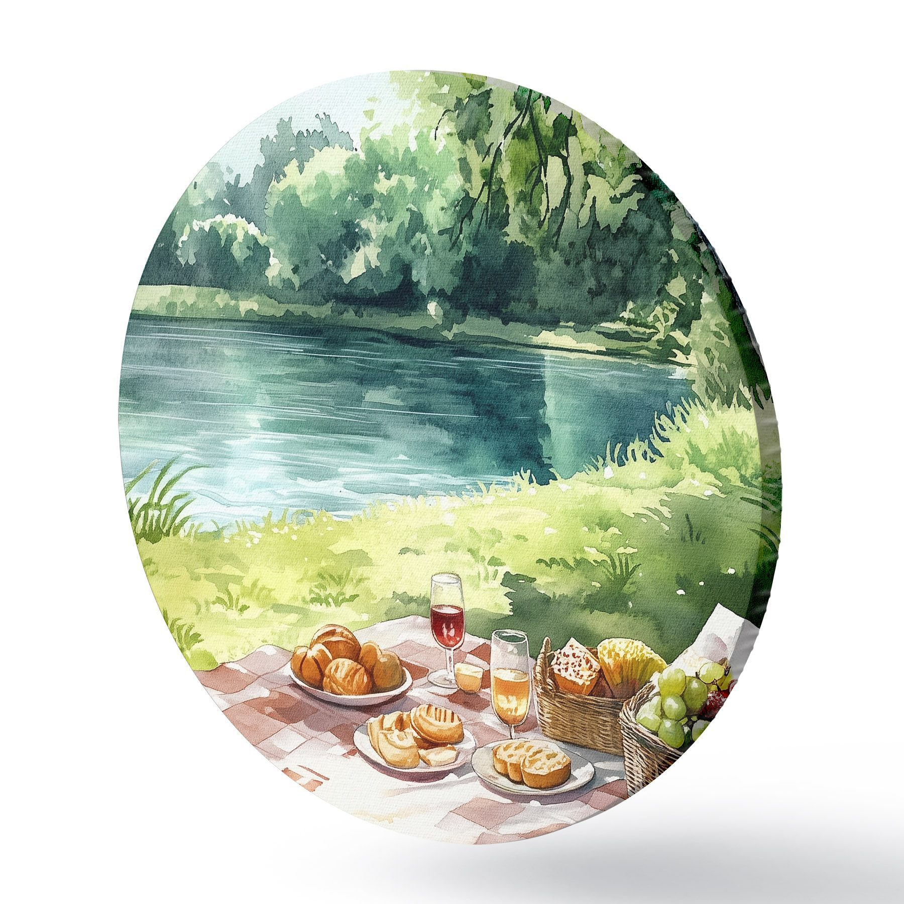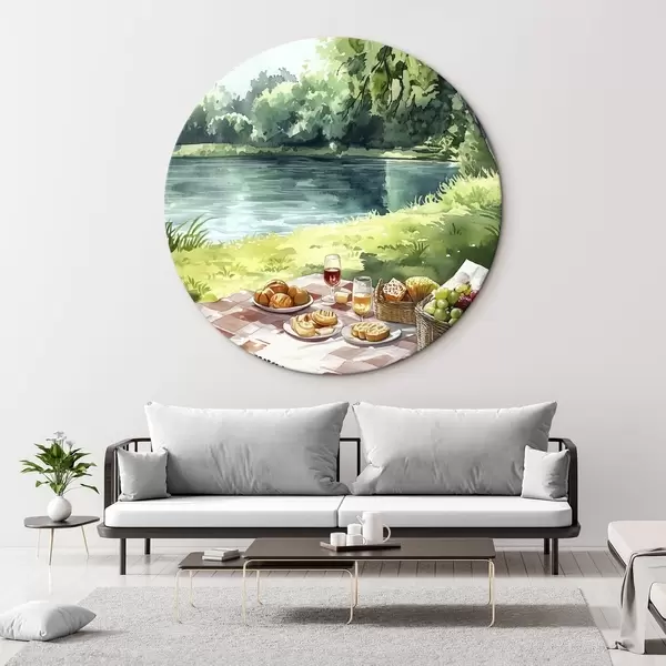 Runde Gemälde Wunderschönes romantisches Picknick am sommerlichen See, Früchte, Grünzeug r42451