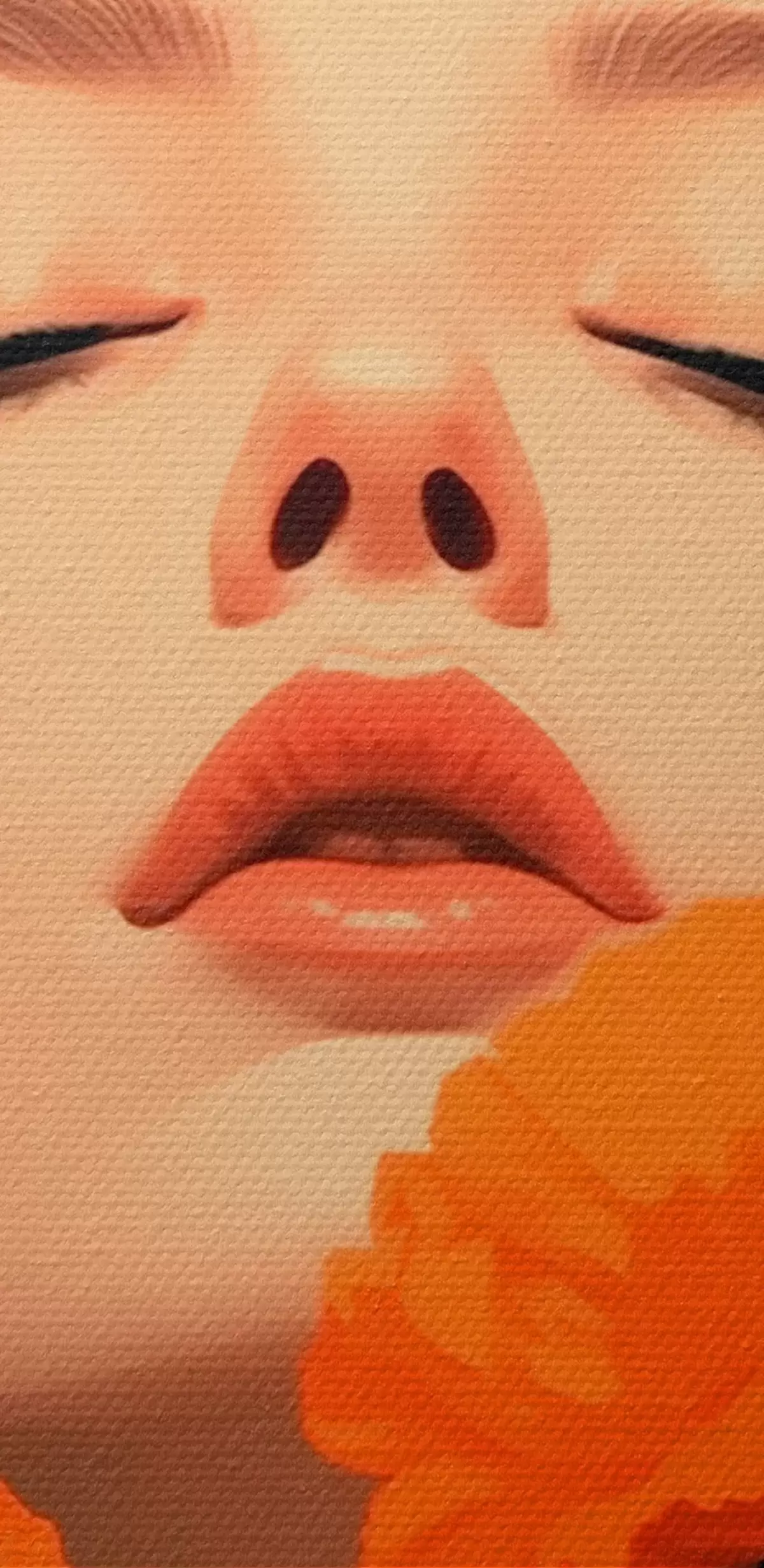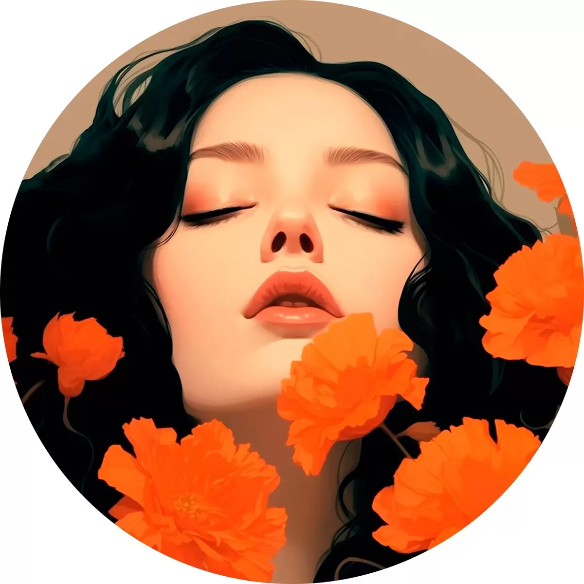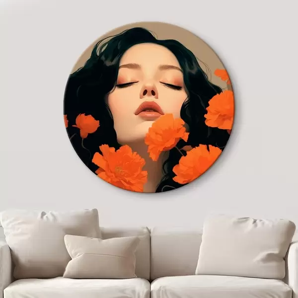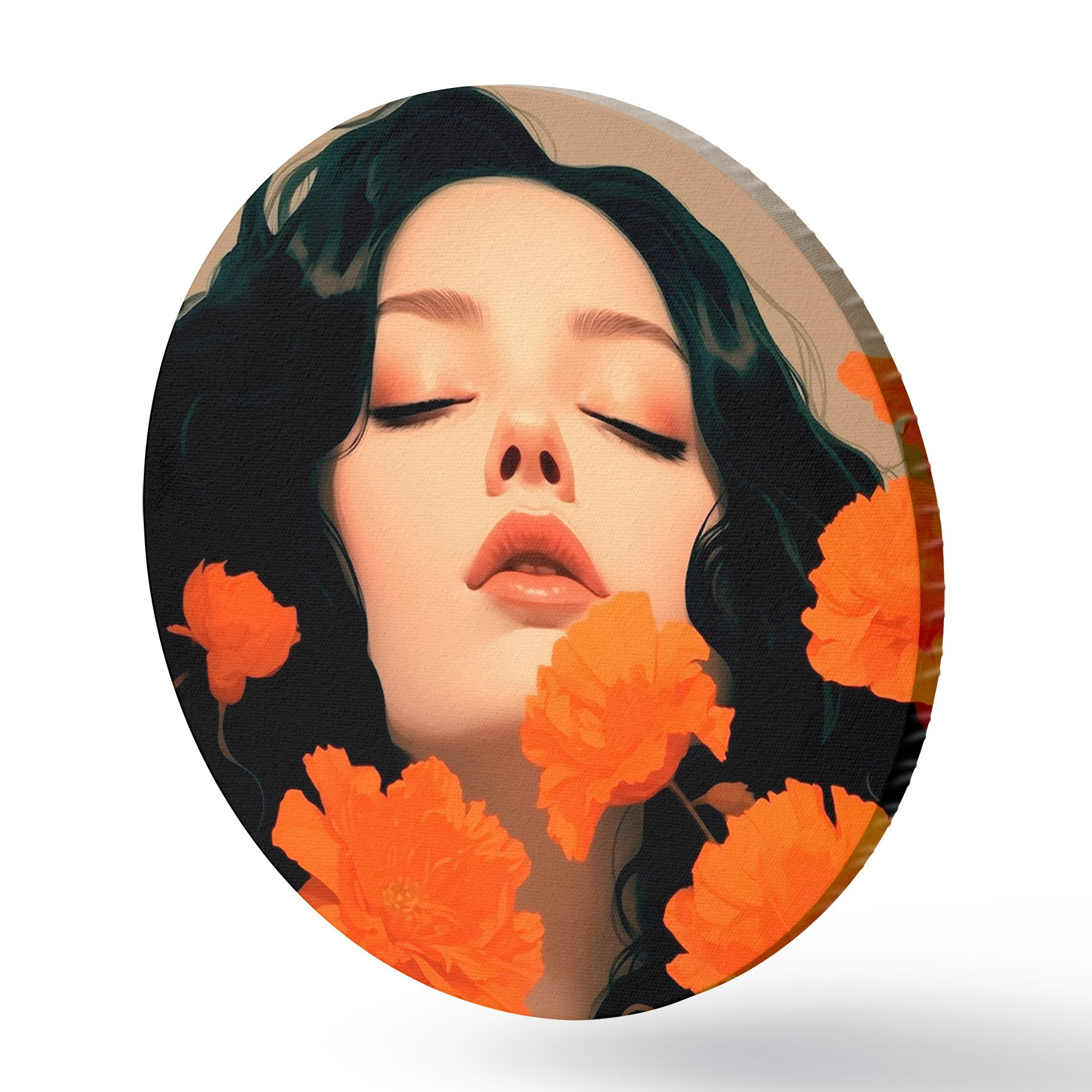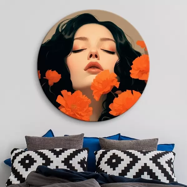 Runde Gemälde Weibliches Porträt zwischen roten Blumen r42478