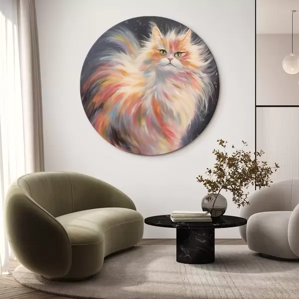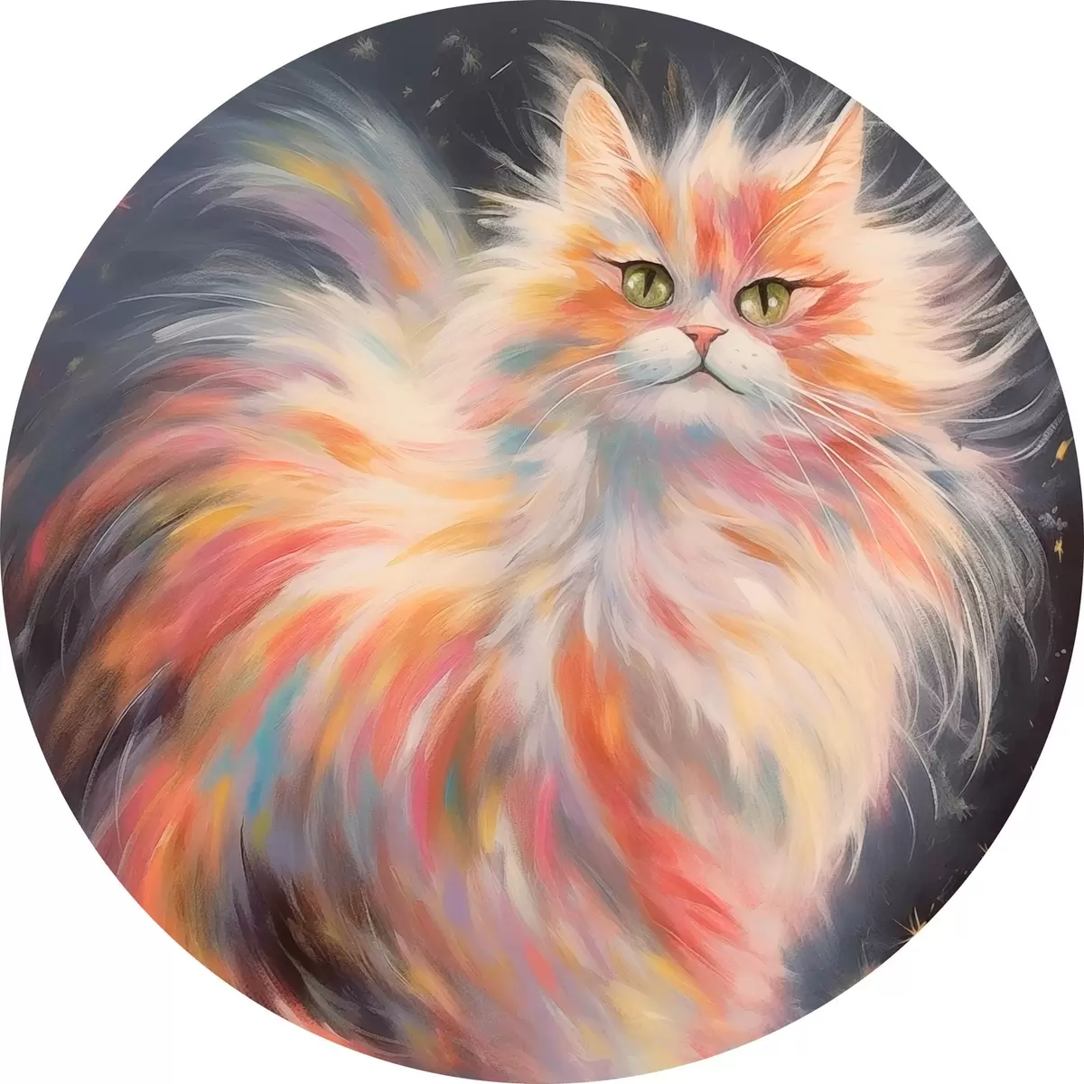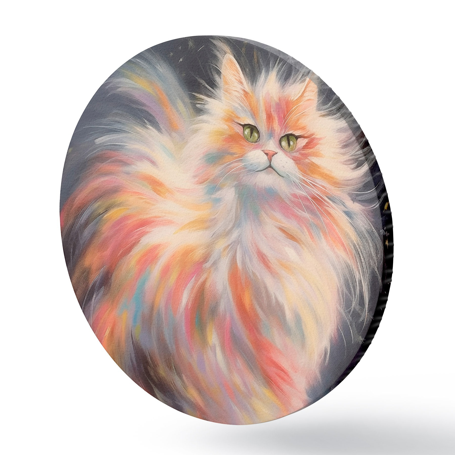 Runde Gemälde Flauschige Katze mit buntem Fell auf dunklem Hintergrund r42484