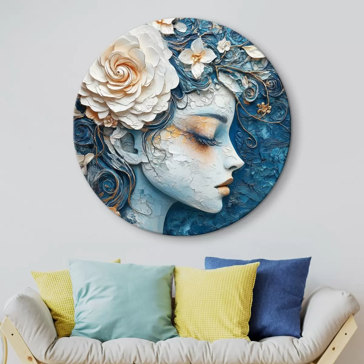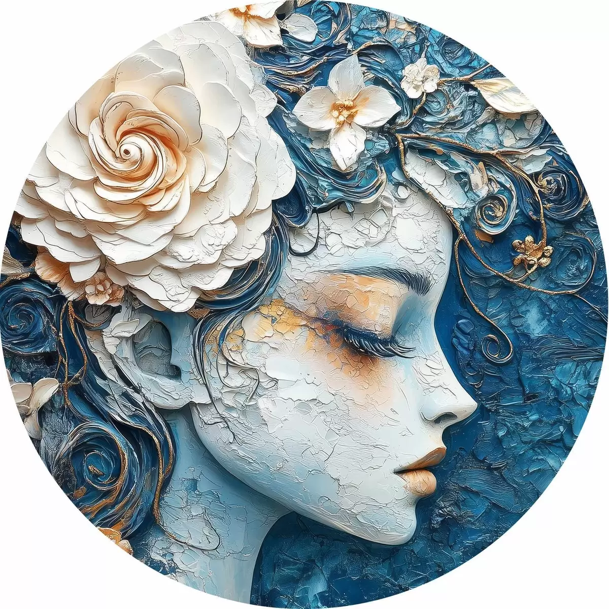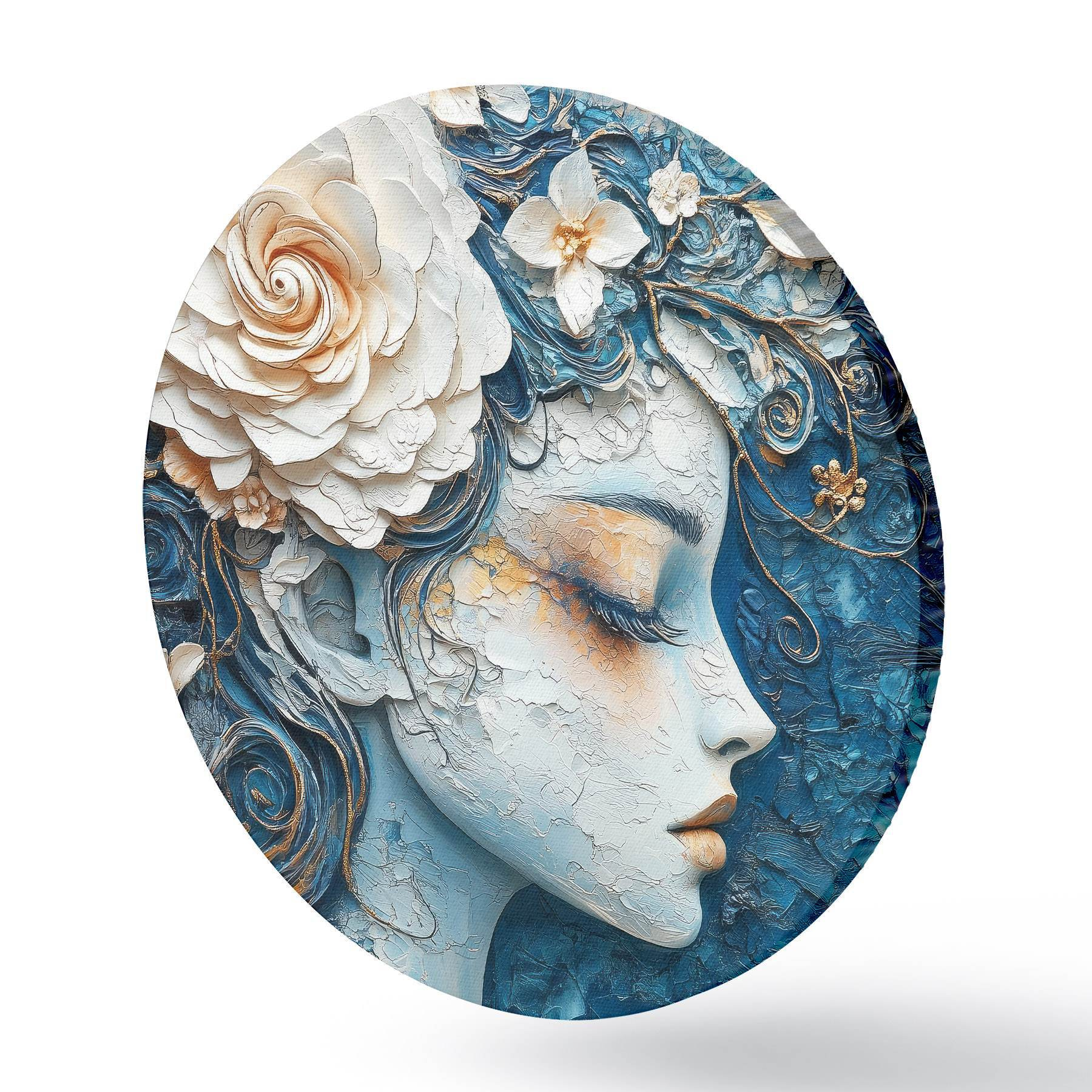 Runde Gemälde Zeichnung eines Mädchens im Profil in Blautönen r42495