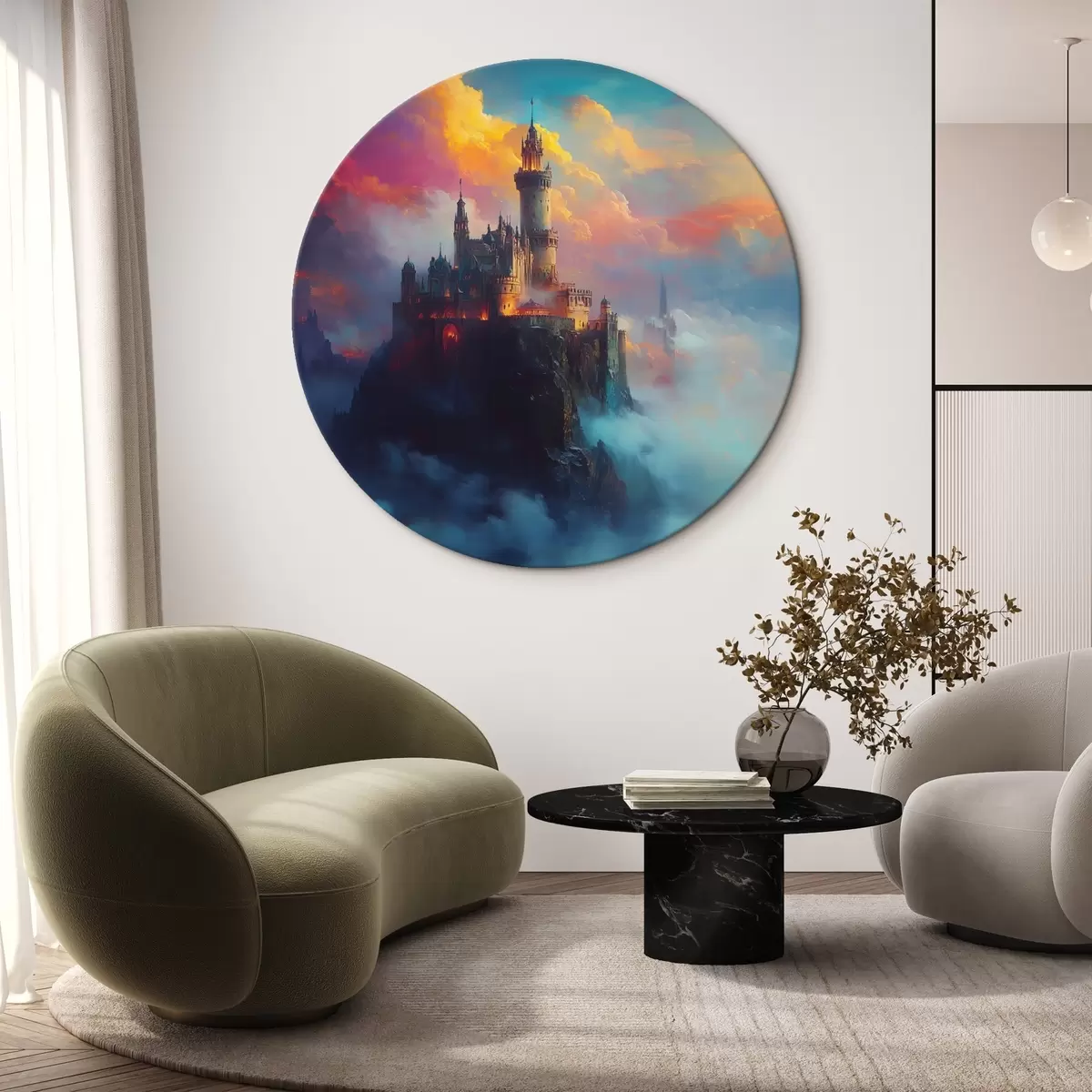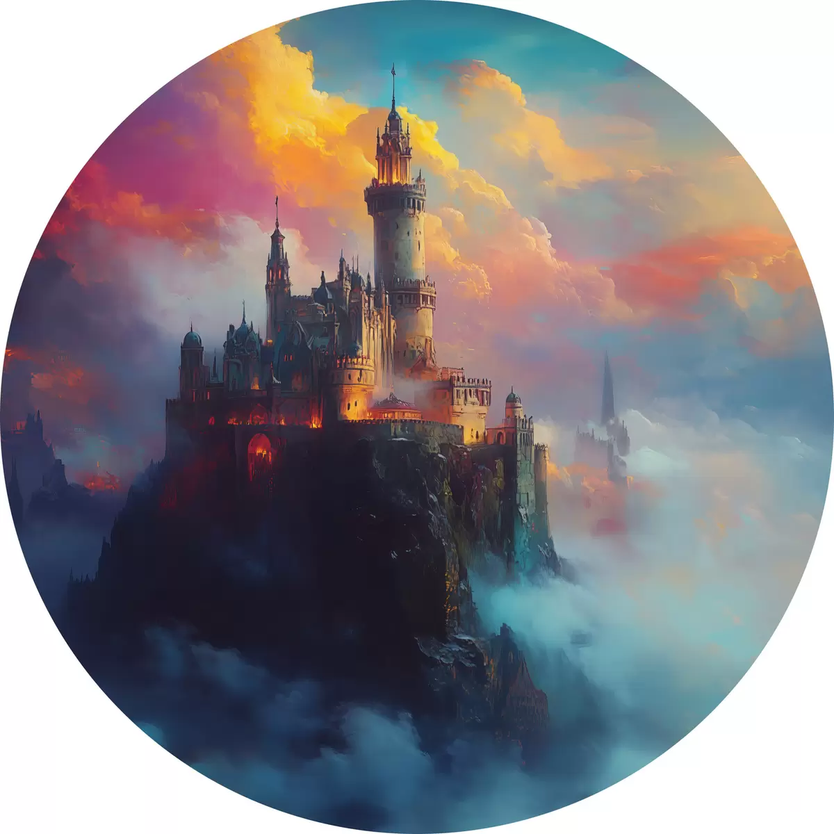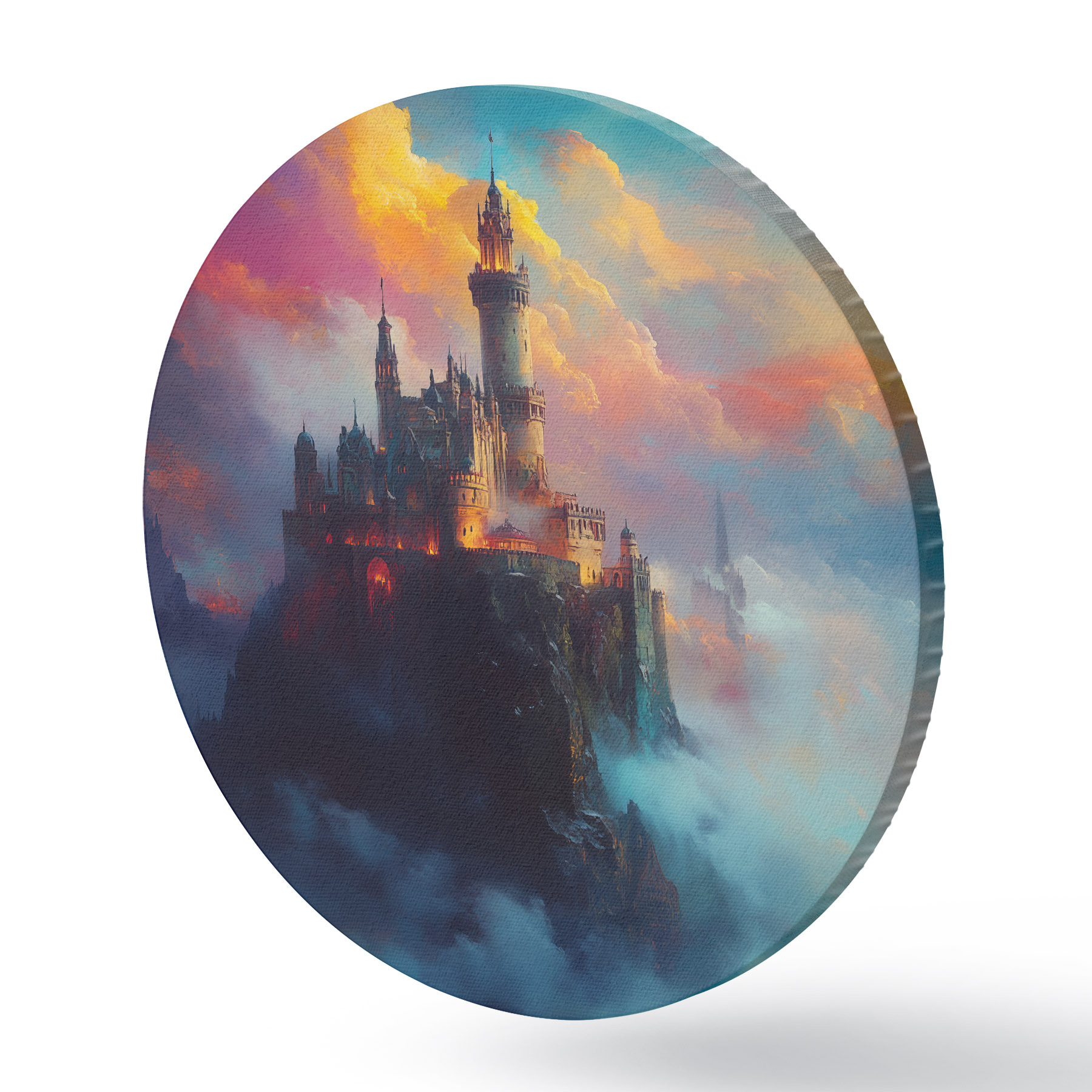 Runde Gemälde Burg auf einem Felsen in den Wolken r42501