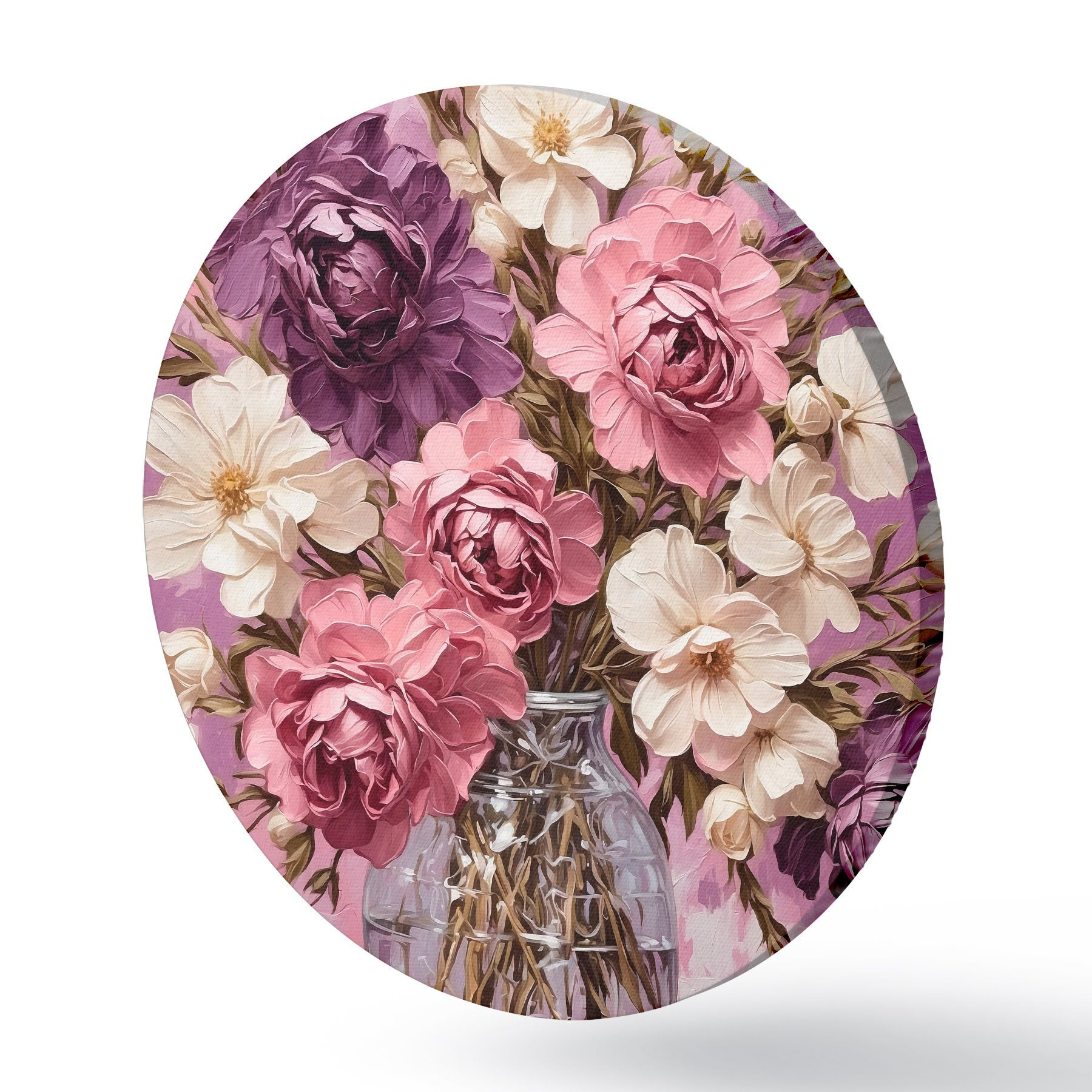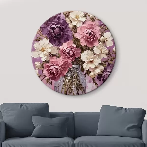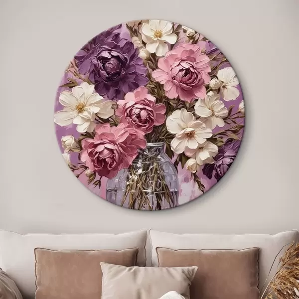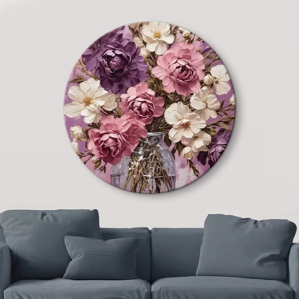 Runde Gemälde Blumen in transparenter Vase auf lila Hintergrund r42535
