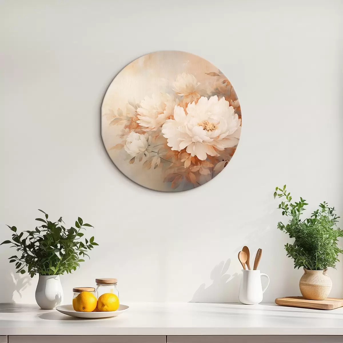 Runde Gemälde Zarte Pfingstrosen in pastelligen Cremetönen auf einem unscharfen Hintergrund, der eine sanfte und romantische Stimmung erzeugt. r42558