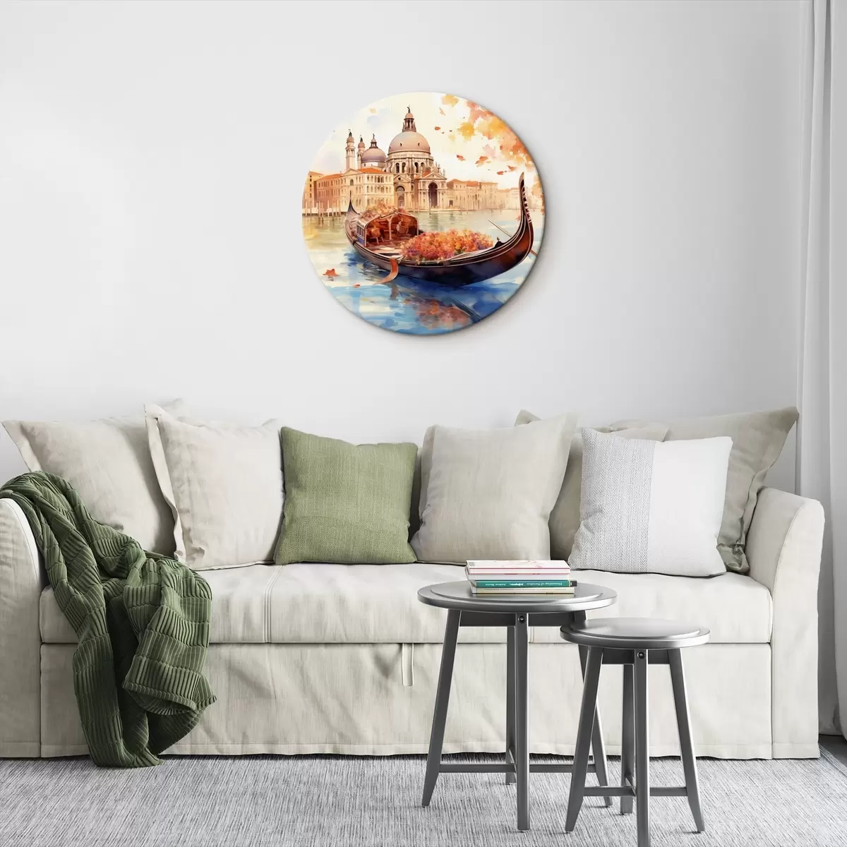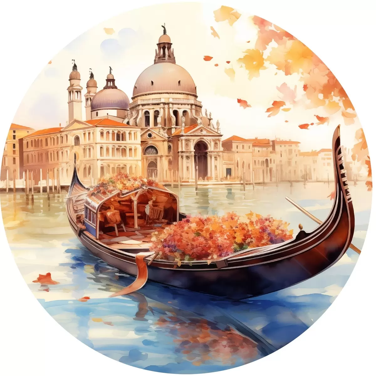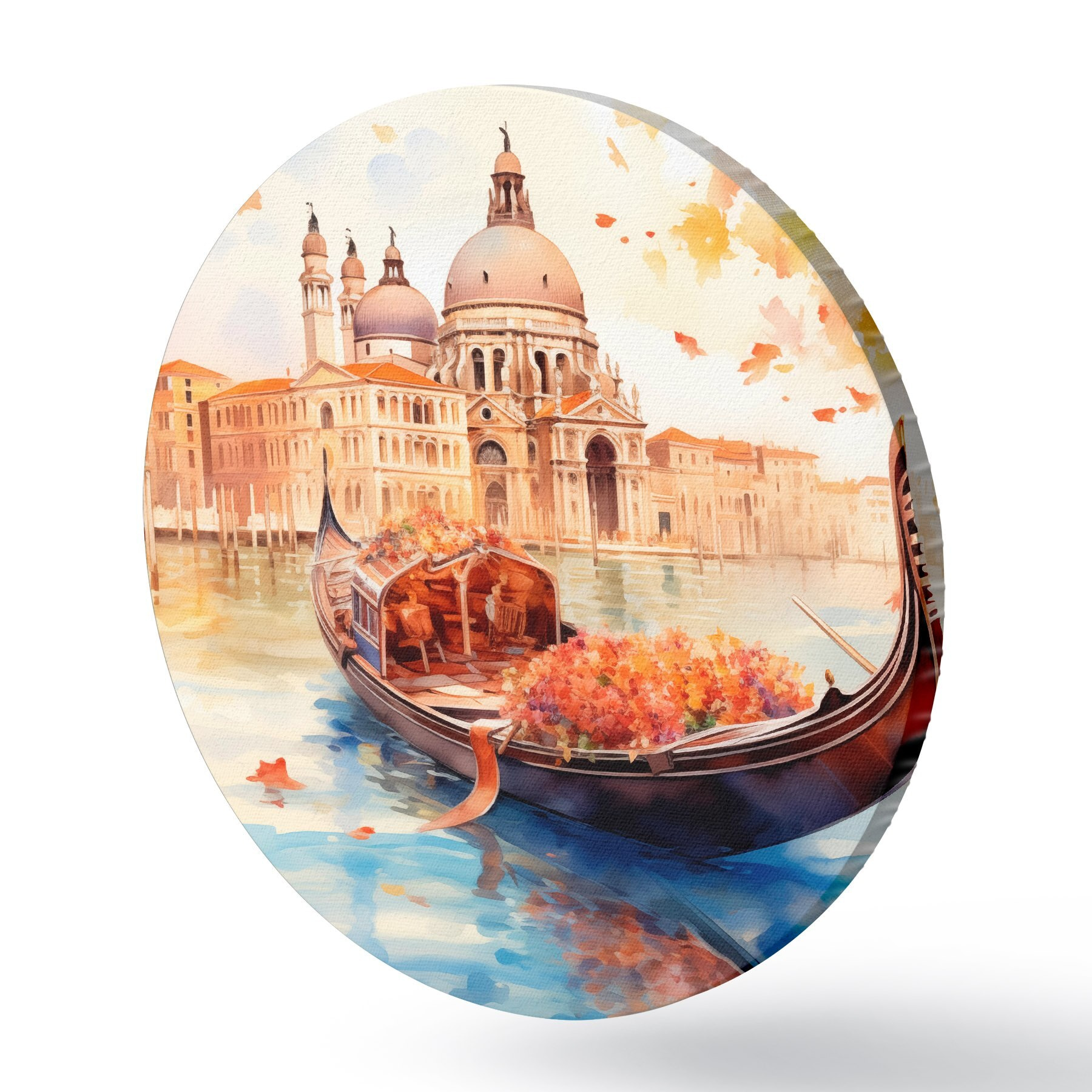 Runde Gemälde Eine herbstliche Ansicht von Venedig mit einer Gondel, umgeben von leuchtend orangefarbenen und roten Blättern, mit Spiegelungen von Gebäuden im ruhigen Wasser des Kanals. r42576