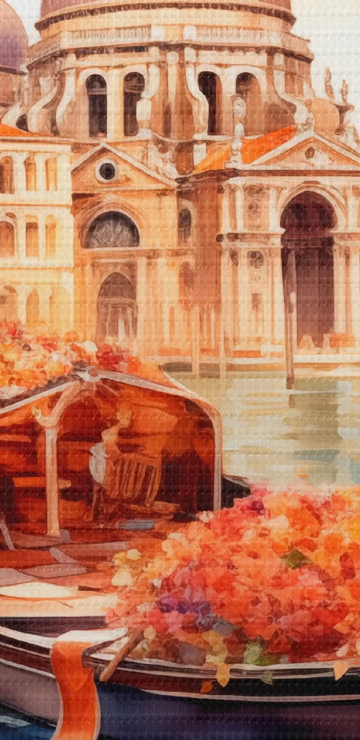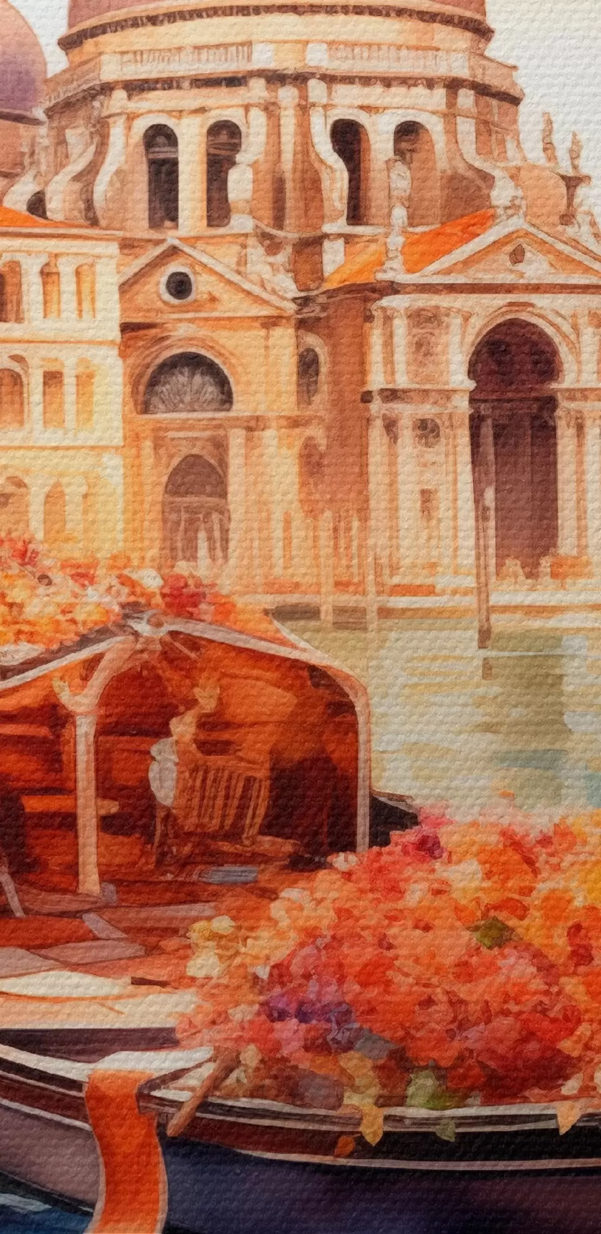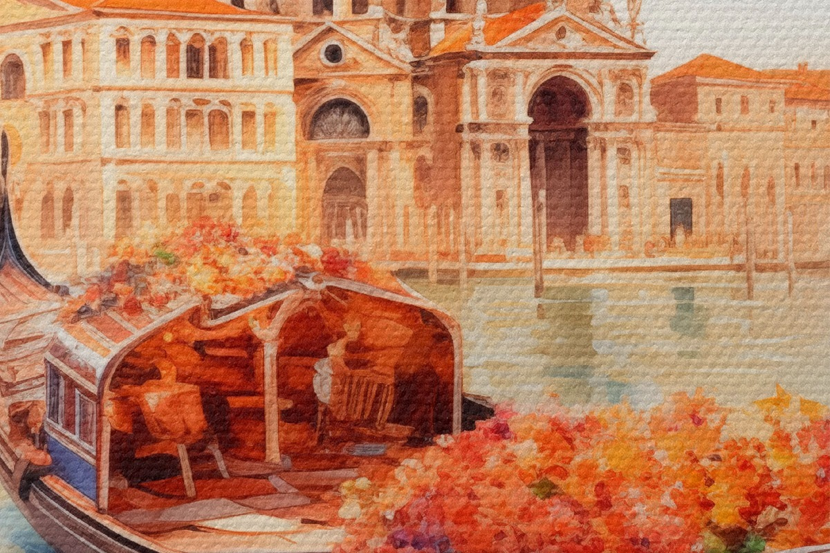 Bild Eine herbstliche Ansicht von Venedig mit einer Gondel, umgeben von leuchtend orangefarbenen und roten Blättern, mit Spiegelungen von Gebäuden im ruhigen Wasser des Kanals. Nr r42576
