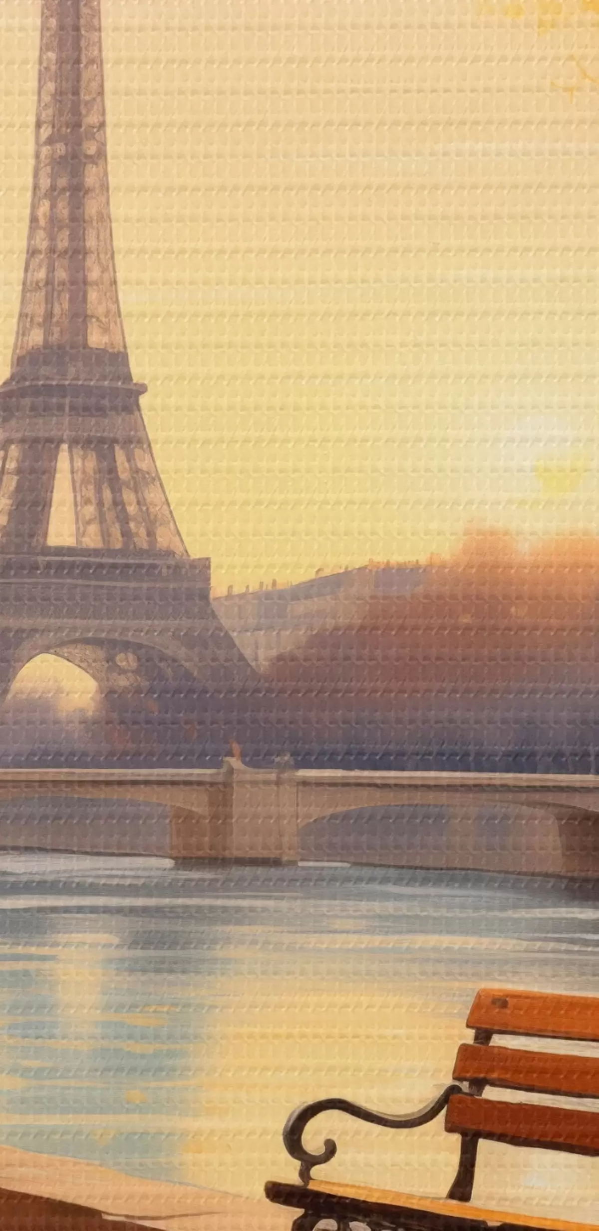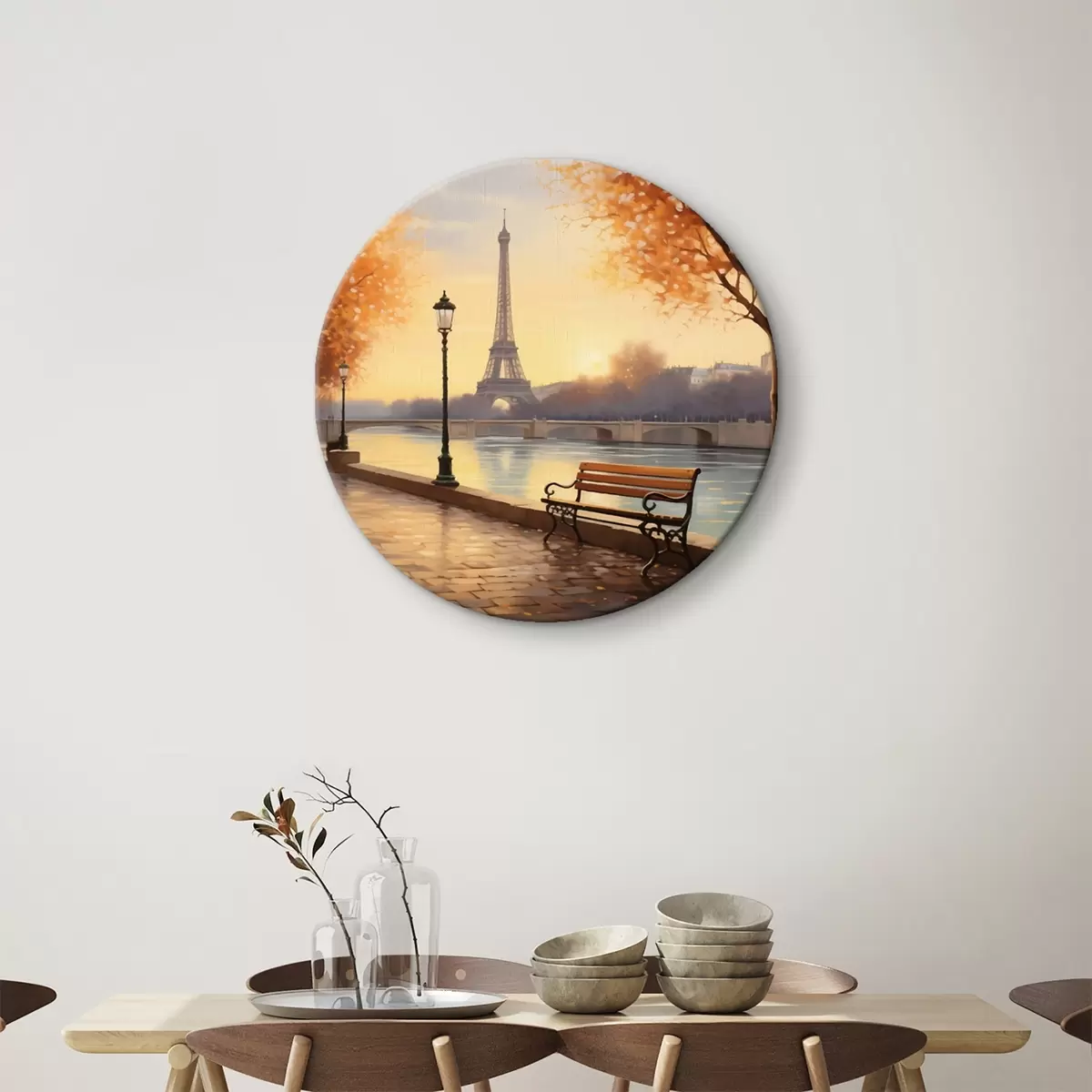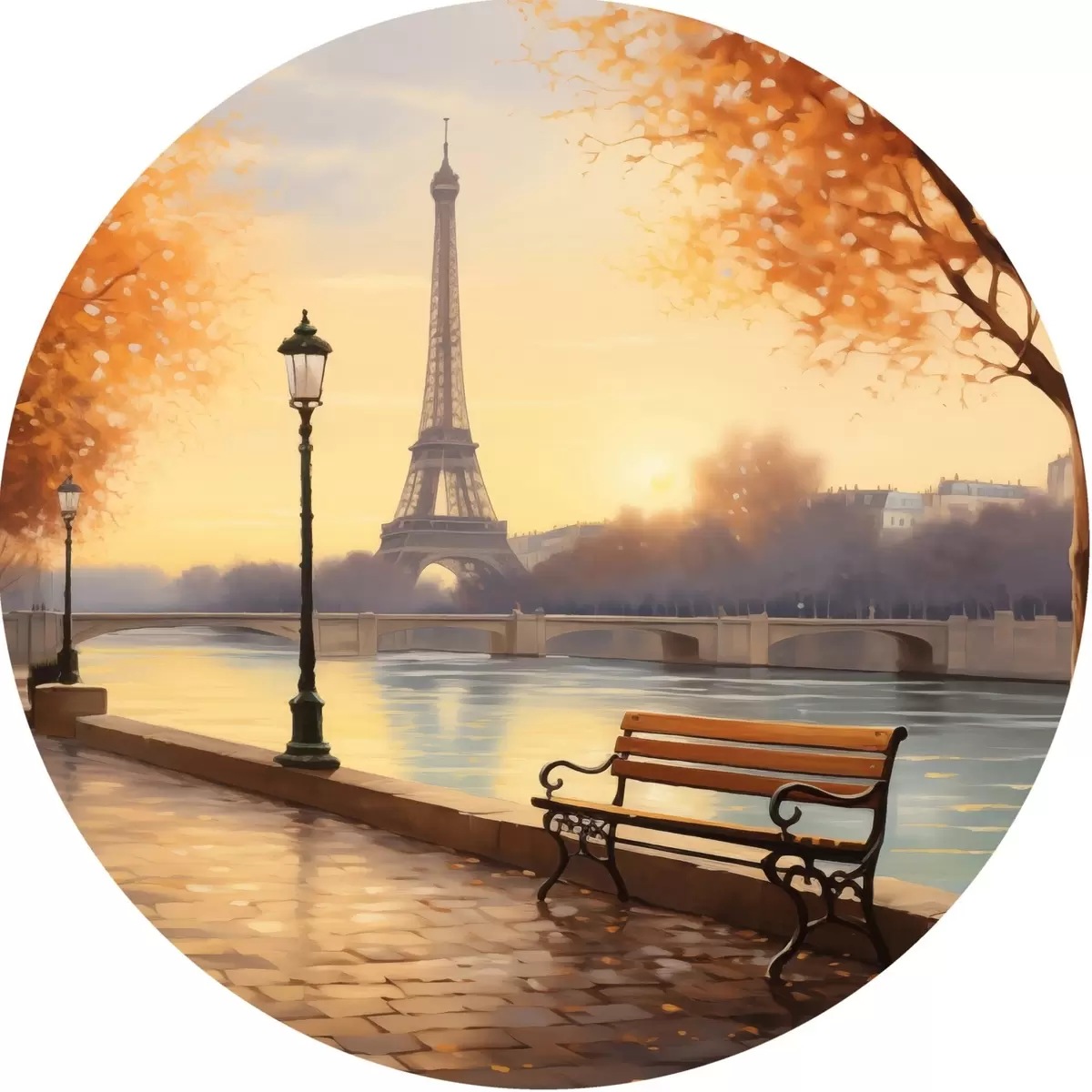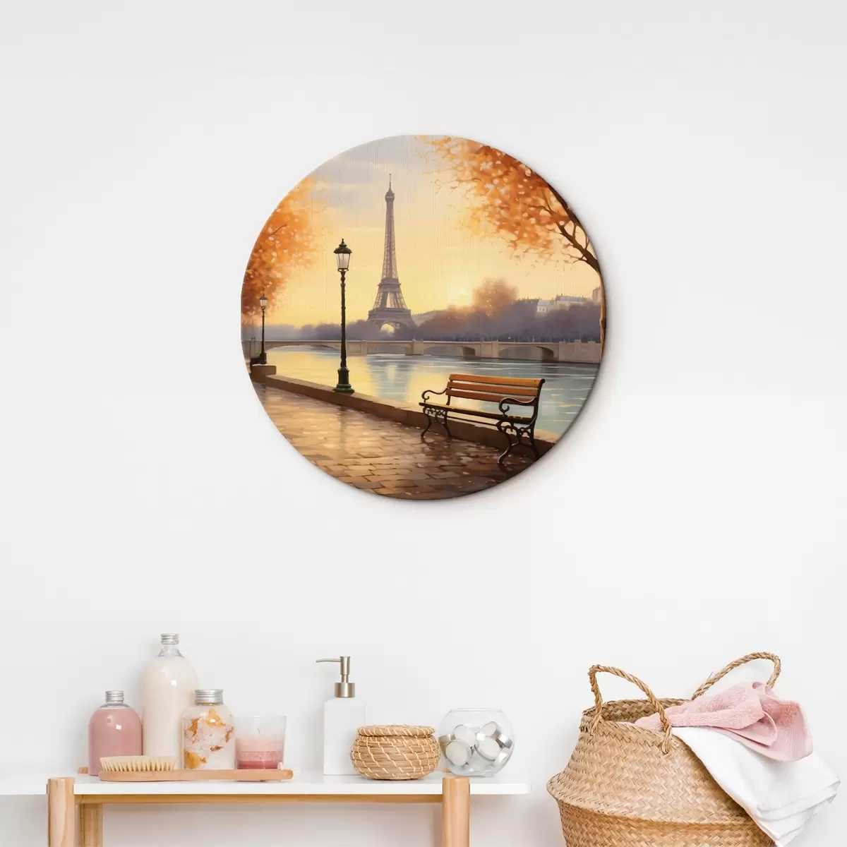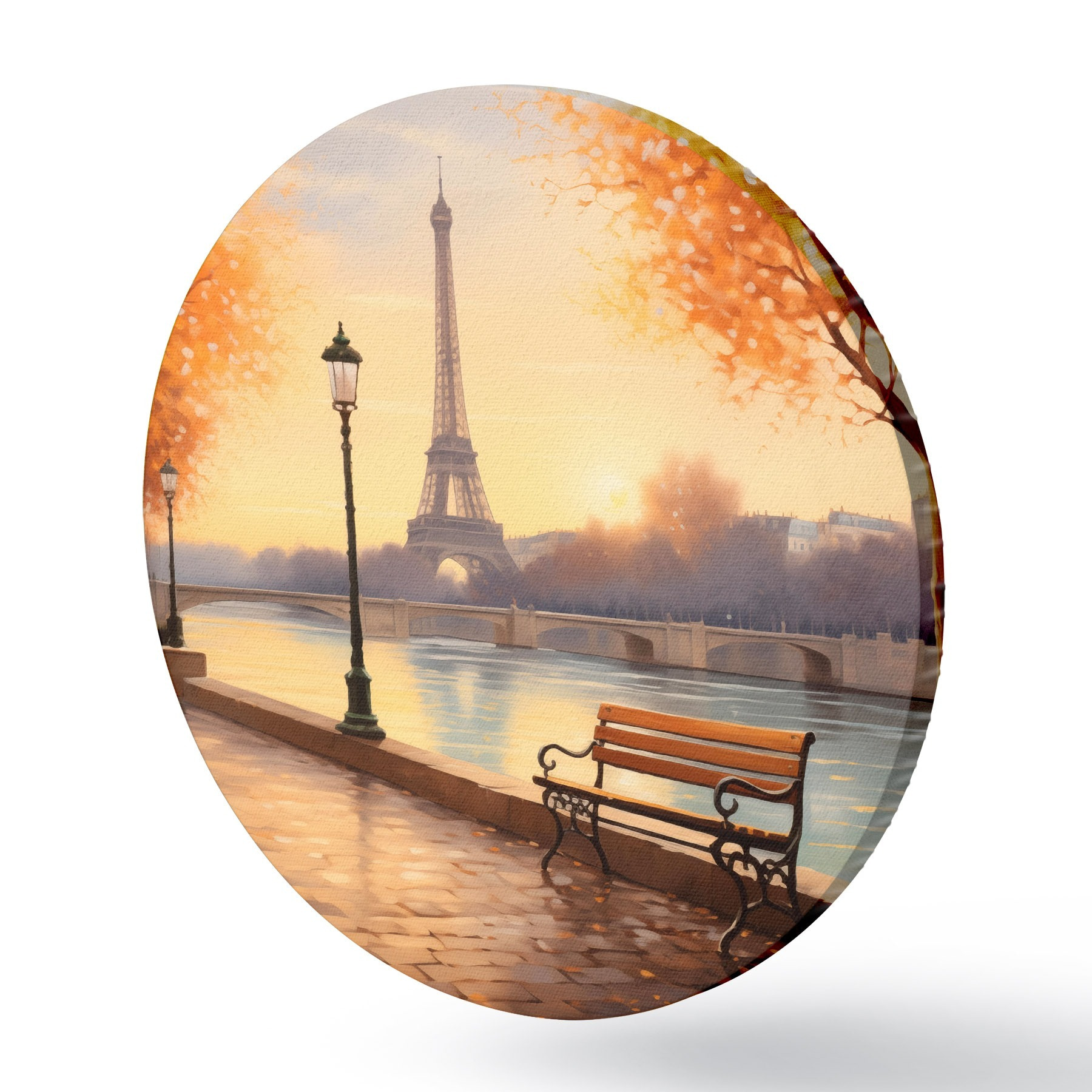 Runde Gemälde Herbst in Paris mit Blick auf den Eiffelturm, das mit Blättern bedeckte Ufer der Seine, Bänke und Straßenlaternen, die eine romantische Atmosphäre schaffen. r42577