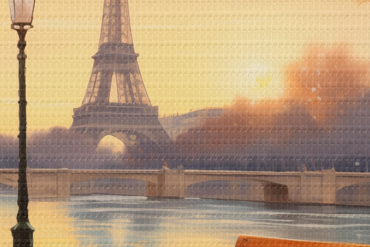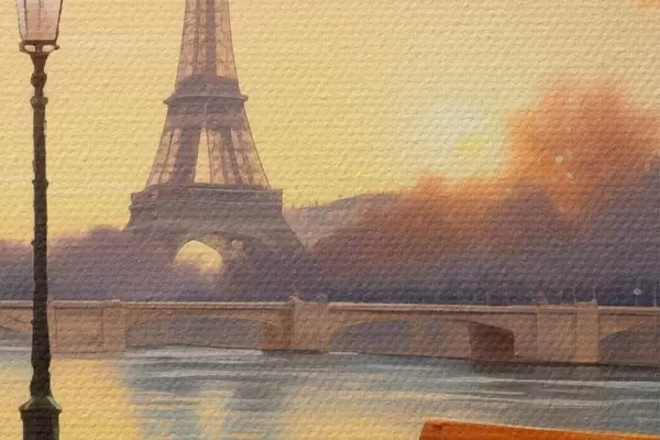 Bild Herbst in Paris mit Blick auf den Eiffelturm, das mit Blättern bedeckte Ufer der Seine, Bänke und Straßenlaternen, die eine romantische Atmosphäre schaffen. Nr r42577